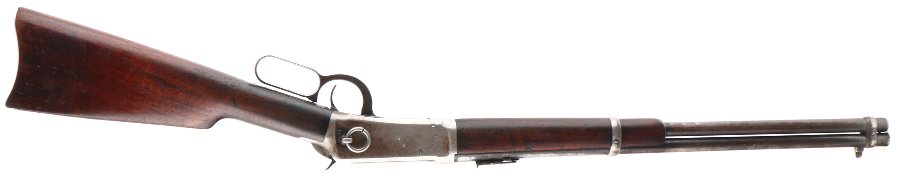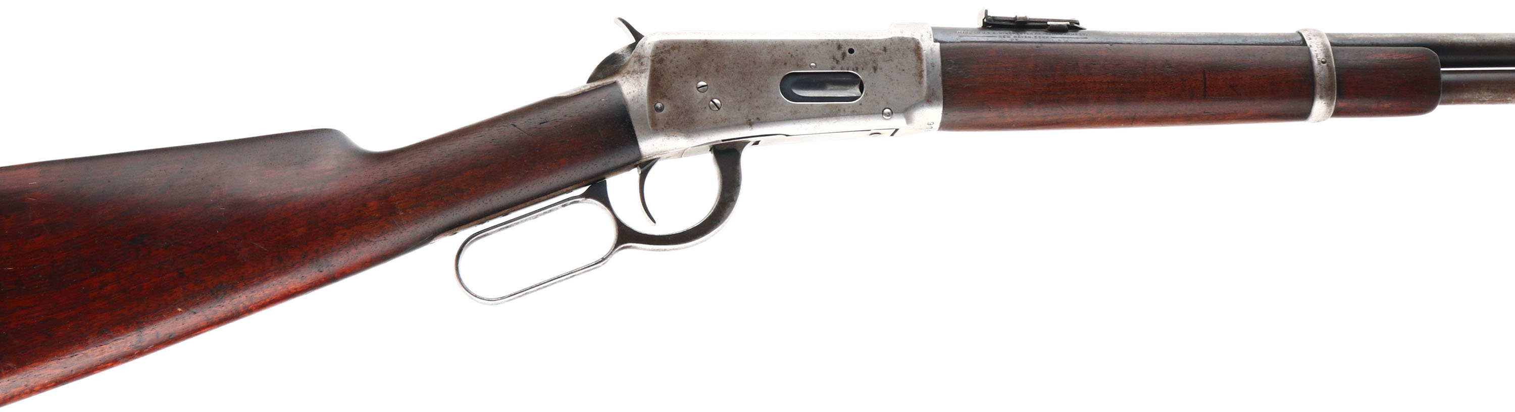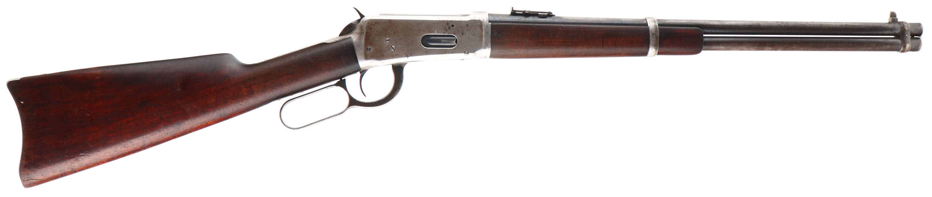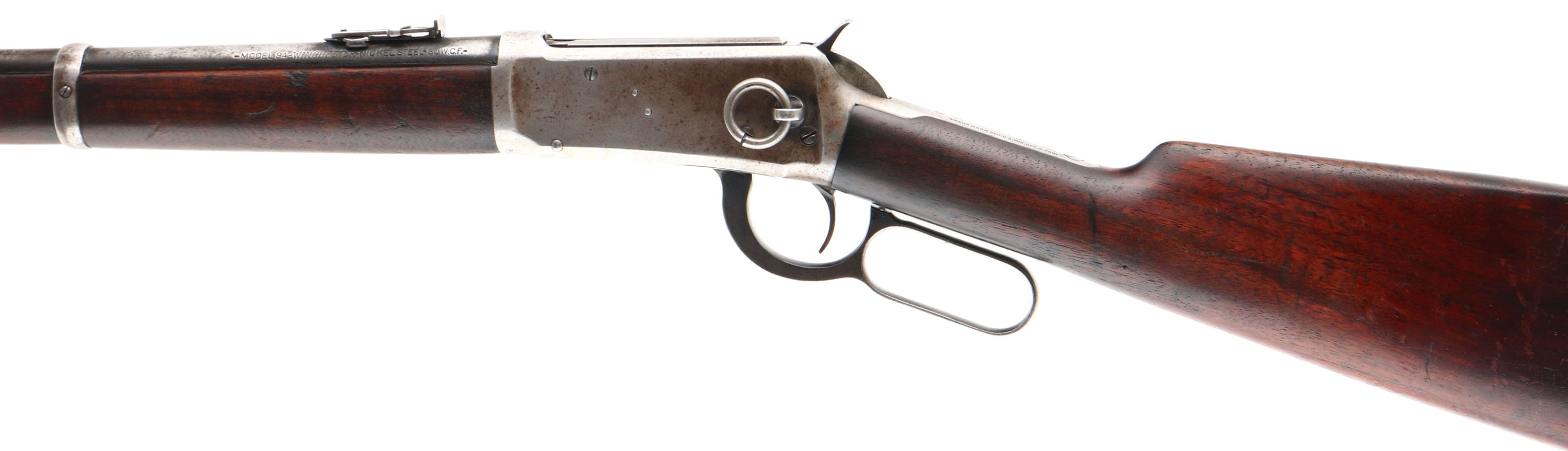 Winchester, Model 94 Saddle Ring Carbine, CAL: 30 WCF (30-30), MFG: 1925, SN: 974804, Lever Action Carbine, 20'' Round barrel, Full mag. The straight grip wood stock & forend are excellent, displaying minor surface scrapes & scratches to an added layer of protective oils over the original finish. The metal blue finish has worn mostly gun metal gray, with remains of original blue in more protected areas & a spotty brown patina. Bore is very good. The barrel holds a carbine ladder rear sight & a carbine box & blade front sight. Buttstock carries a smooth metal carbine style buttplate. FFL or C&R Req. - Value: 800 to 1500
