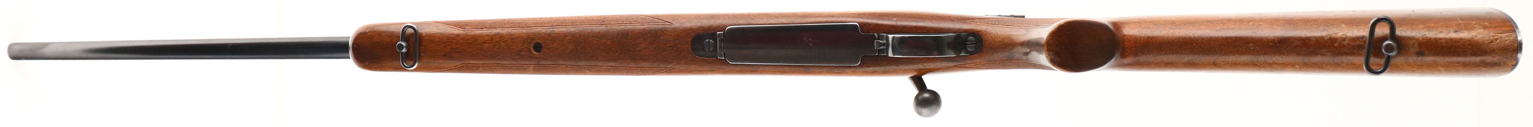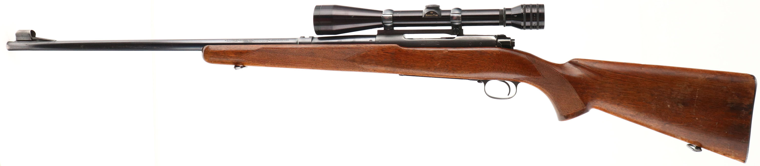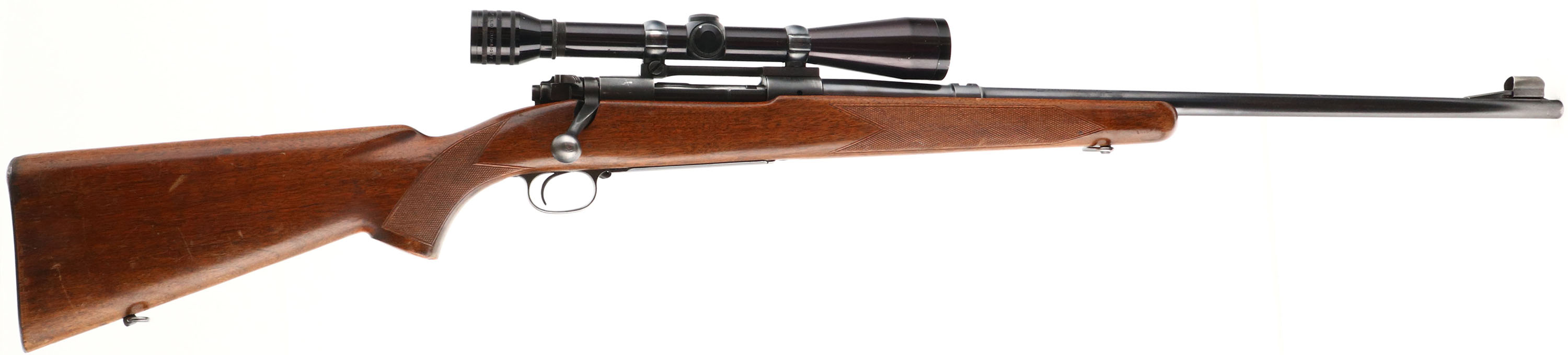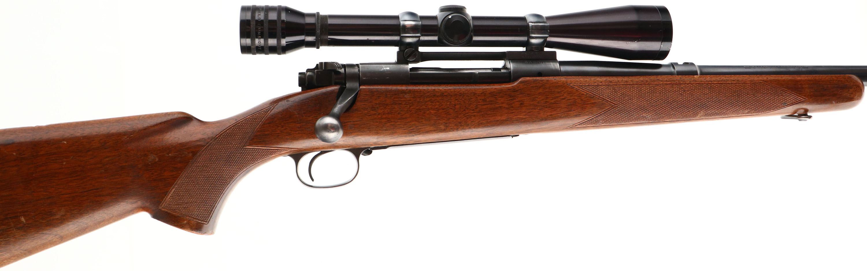 Winchester Model 70, CAL: 250-3000 Sav, MFG: 1946, SN: 63887, Bolt Action Rifle, 24'' barrel. Very rare caliber marking, pre-64 rifle. The original checkered & flat pistol grip wood stock is very good, displaying several finish level to small scrapes, scratches, contusions & nicks to the original finish. One larger gouge/scrape at the toe. The original metal blue finish rates 80% overall. Bore is excellent. Fitted with a Redfield 6x 1'' tube scope on Redfield mounts, The barrel carries an open rear dovetail & hooded ramp front sight. Buttstock carries the original checkered widow's peak metal buttplate. Sling swivels. Matching SN hand applied to bolt. An original surviving 40's model 70 in a seldom scene caliber. Highly collectible. FFL or C&R Req - Value: 2500 to 5000