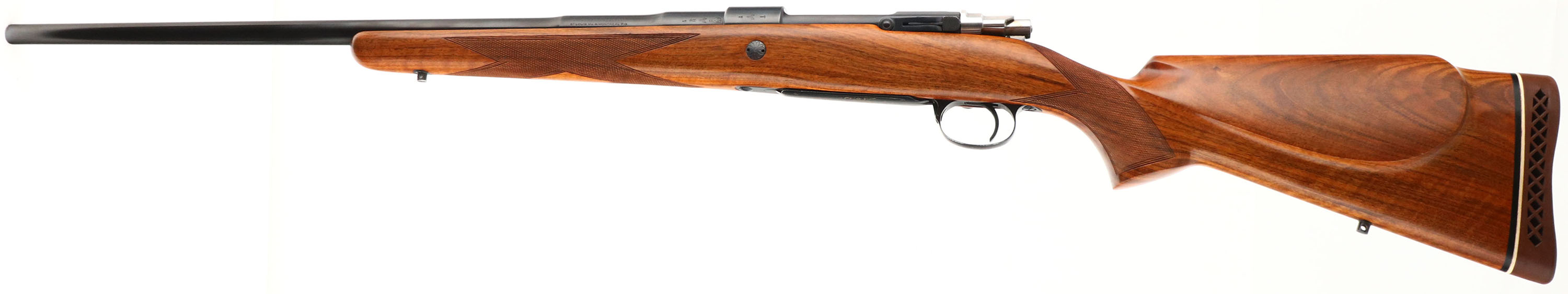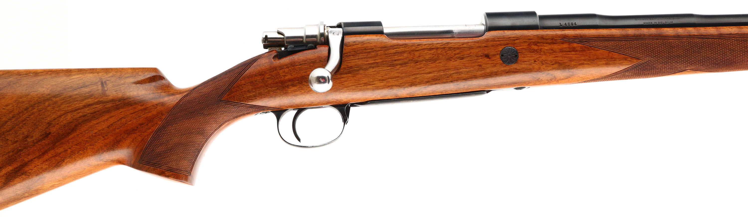 Browning, Model FN High-Power Safari Grade, marked Cal. 264 WIN. MAG. Only, MFG. 1959, Belgium, SN: L4394, Bolt Action Rifle, 24'' Round barrel, The factory checkered, cheeked & flat pistol grip Monte Carlo wood stock is excellent & original. There are just a couple very tiny finish level handling marks. The original metal blue rates 99% overall. Floorplate & trigger guard display fine gold tone engraving. Receiver has four open factory holes for scope mounting, while barrel has two factory screw filled rear sight hole & no front sight provision. Bore is excellent. Stock carries a ventilated Pachmayr recoil pad & sling stud provisions. An overall excellent, high original condition & collectible very early example. FFL or C&R Req. - Value: 1250 to 2500