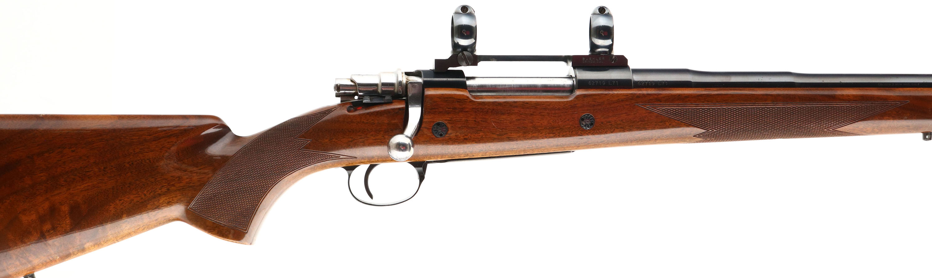Browning, Model FN High-Power Safari Grade, marked Cal. 7mm REM MAG. Only, MFG. 1971, Belgium, SN: 62719L71, Bolt Action Rifle, 24'' Round barrel, The factory checkered, cheeked & flat pistol grip Monte Carlo wood stock is excellent & original. There are a few minor handling marks, scuff & nicks to the original high gloss finish. The original metal blue rates 97% overall, with the barrel finish toning a bit plum. Floorplate & trigger guard display fine gold tone engraving. Receiver carries a Buehler base & scope rings for scope mounting, while barrel has two factory screw filled rear sight hole &a hooded ramp front sight. Bore is excellent. Stock carries a Browning ventilated recoil pad & sling stud provisions. An overall excellent, high original condition & collectible rifle. FFL or C&R Req. - Value: 1000 to 2000