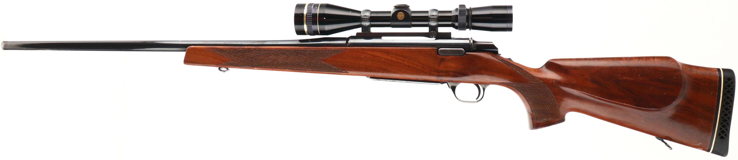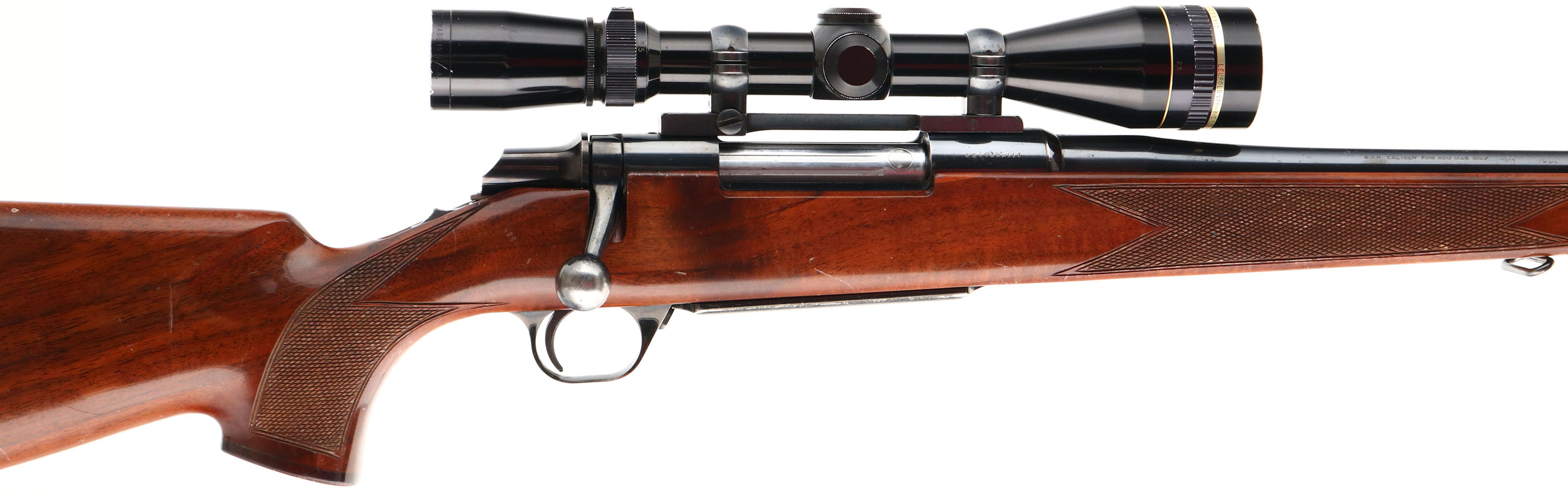 Browning, Model B.B.R., marked Cal. 7mm REM MAG. Only, MFG. 1979, Japan, SN: 02443RN117, Bolt Action Rifle, 24'' Round barrel, The factory checkered, cheeked & flat pistol grip Monte Carlo wood stock is excellent & original. There are numerous minor scratches, scuff & contusions to the original high gloss finish. The original metal blue rates 85% overall, with most of the loss due to spotting or speckling. Floorplate & trigger guard show a bit more wear. Receiver carries a Leupold Vari-x-III 3.5x10 scope on Redfield base, while barrel has no open sight provisions. Bore is excellent. Stock carries a Pachmayr ventilated recoil pad & sling swivels. A very nice original hunting rifle. FFL Req. - Value: 400 to 800