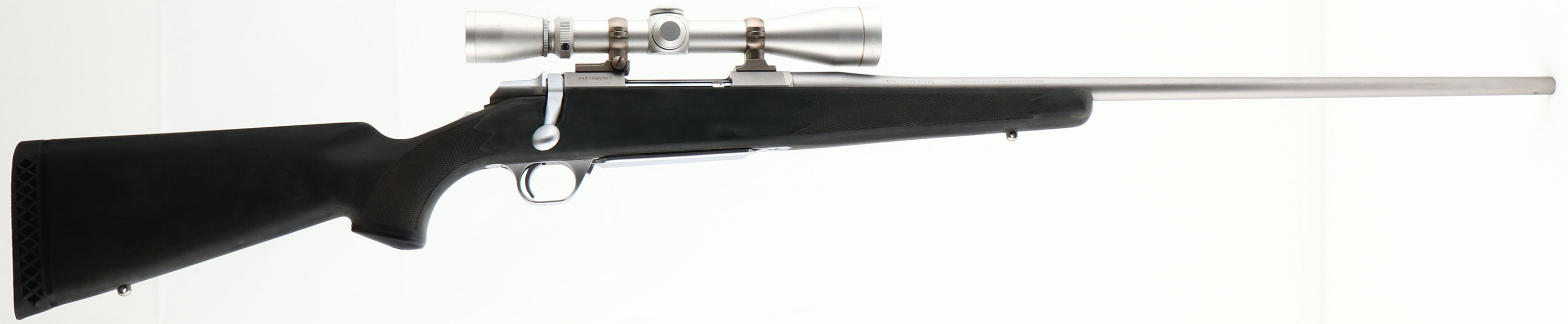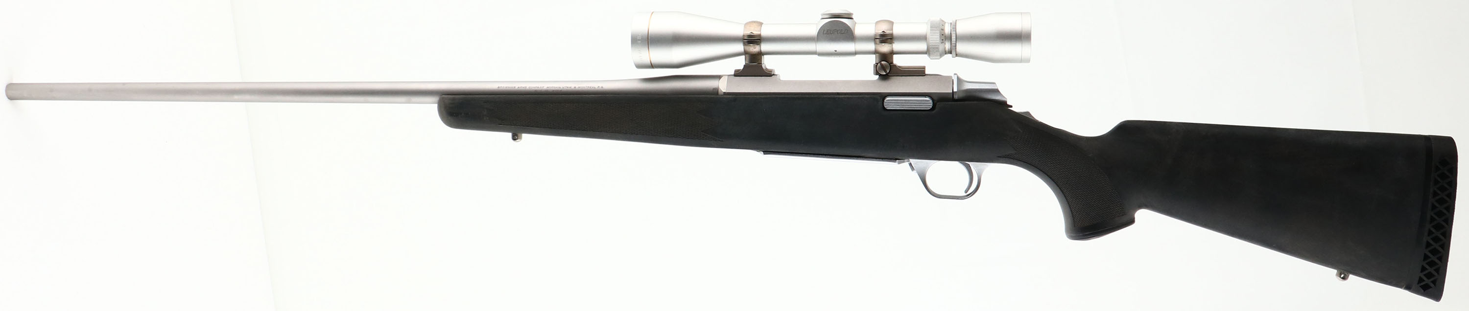 Browning, Model A-Bolt Stainless Stalker, Cal. marked 338 WIN MAG. Only, MFG. 1992, Japan, SN: 44510NY7S7, Bolt Action Rifle, 26'' Round barrel, The factory checkered & flat pistol grip matte black graphite fiberglass composite stock is excellent, but with very minor scuff or rubs & some use haze developing. The original matte stainless metal finish rates excellent overall. Receiver carries a matching Leupold Vari-x-IIc 3x9 scope, while barrel has no open sight provisions. Bore is excellent. Stock carries a Pachmayr ventilated recoil pad & sling studs. An excellent overall, all-weather hunting rifle. FFL Req. - Value: 500 to 850