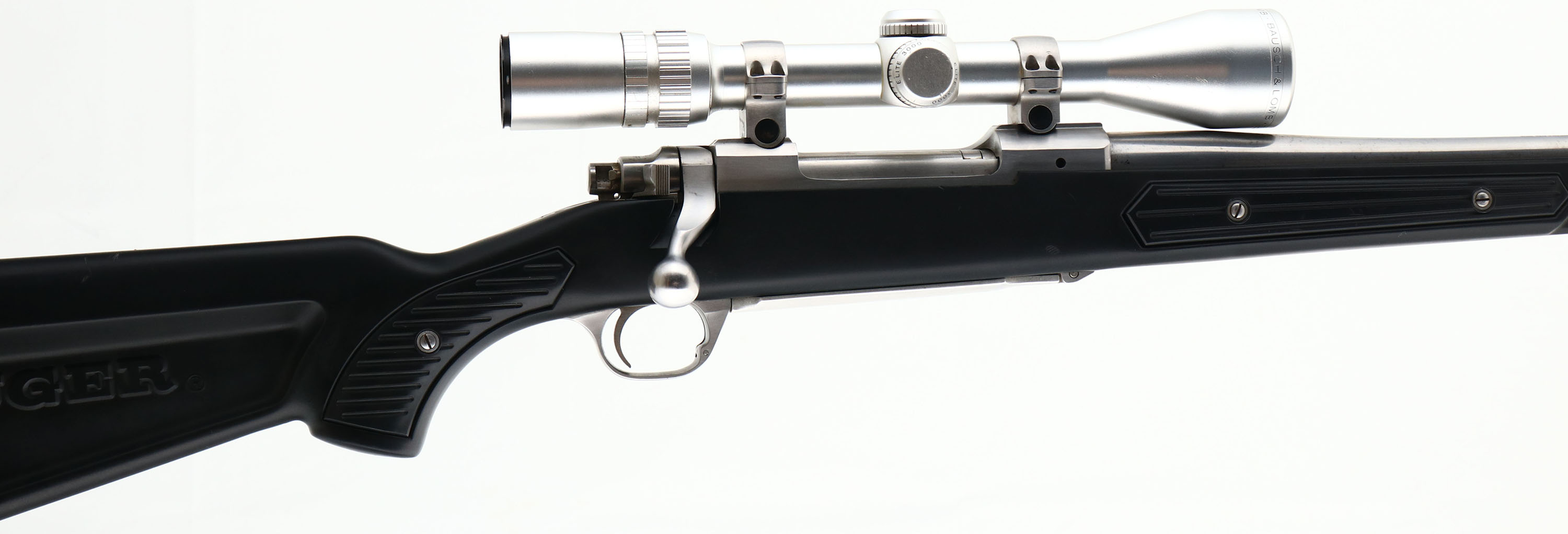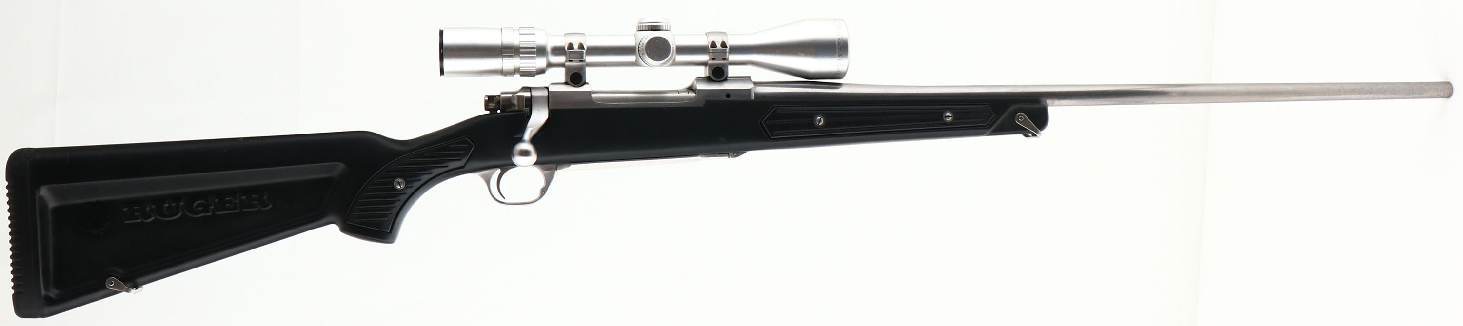 Ruger, Model M77 MARK II, Stainless All Weather, 7 mm REM MAG Cal., MFG. 1995, SN: 783-40592, Bolt Action Rifle, 24'' round barrel, The factory Zytel synthetic stock (sometimes referred to as a skeleton or boat/canoe paddle stock) is excellent, but does have some minor scuffs or scratches. The stainless steel surfaces have a satin silver finish, which is excellent, but with some minor spotting & fine brush lines. The satin silver finish on the floorplate does show some use wear. Bore is excellent, Factory recoil pad & sling loops. Grooved receiver for scope mount. No sight provisions. Fitted with a satin silver matching Bausch & Lomb 3-9X scope. A high quality, all weather, bolt action sporting rifle. FFL Req. - Value: 1000 to 2000