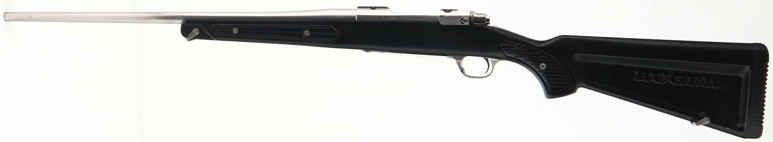 Ruger, Model M77 MARK II, Stainless All Weather, 22-250 REM Cal., MFG. 1996, SN: 784-31731, Bolt Action Rifle, 22'' round barrel, The factory Zytel synthetic stock (sometimes referred to as a skeleton or boat/canoe paddle stock) is excellent, but does have some minor scrapes, scuffs or scratches, mostly on the grip pads. The stainless steel surfaces have a satin silver finish, which is excellent, but with some minor rubs, scratches & fine brush lines. Bore is excellent, Factory recoil pad & sling loops. Grooved receiver for scope mount. No sight provisions. A high quality, all weather, bolt action sporting rifle. FFL Req. - Value: 800 to 1500