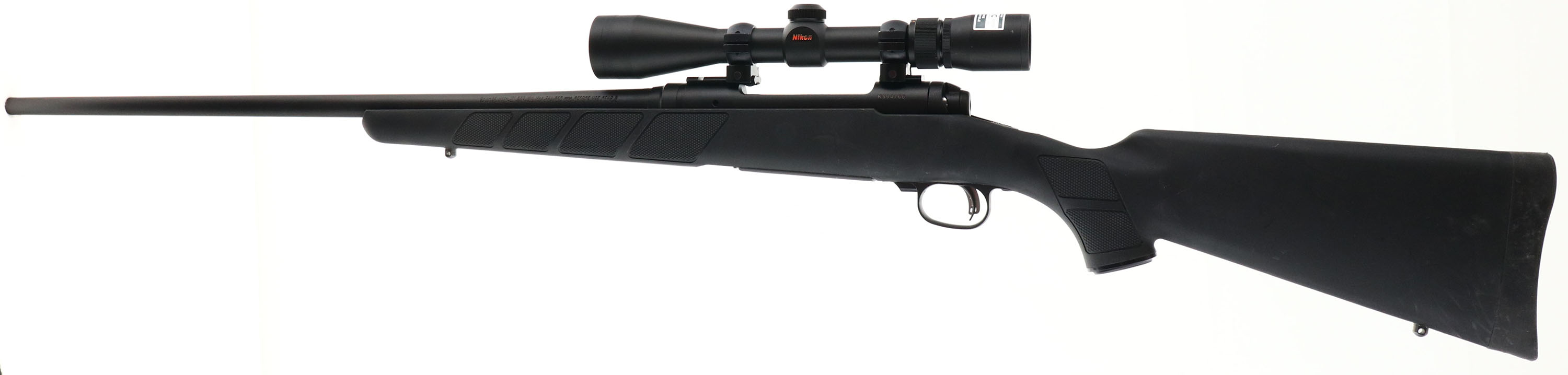 Savage, Model 111, CAL: 300 WIN MAG, MFG: Modern, SN: K594766, Bolt Action Rifle, 24 1/4'' Tapered round barrel. The original checkered & capped pistol grip synthetic stock is excellent, with a few minor handling rubs. Still has Savage retail sticker on the right side of stock. The original metal finish 99% overall. Bore is excellent. The receiver is fitted with a Nikon 3-9x40 Scope, with no open sight provisions on the barrel. Stock carries the original solid recoil pad. Sling studs. Detachable mag. Excellent overall. FFL Req. - Value: 400 to 600