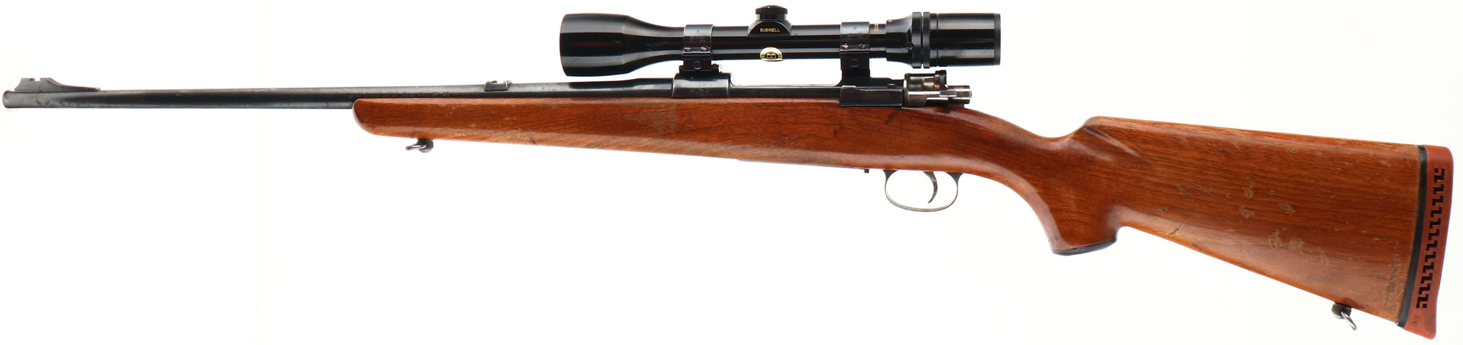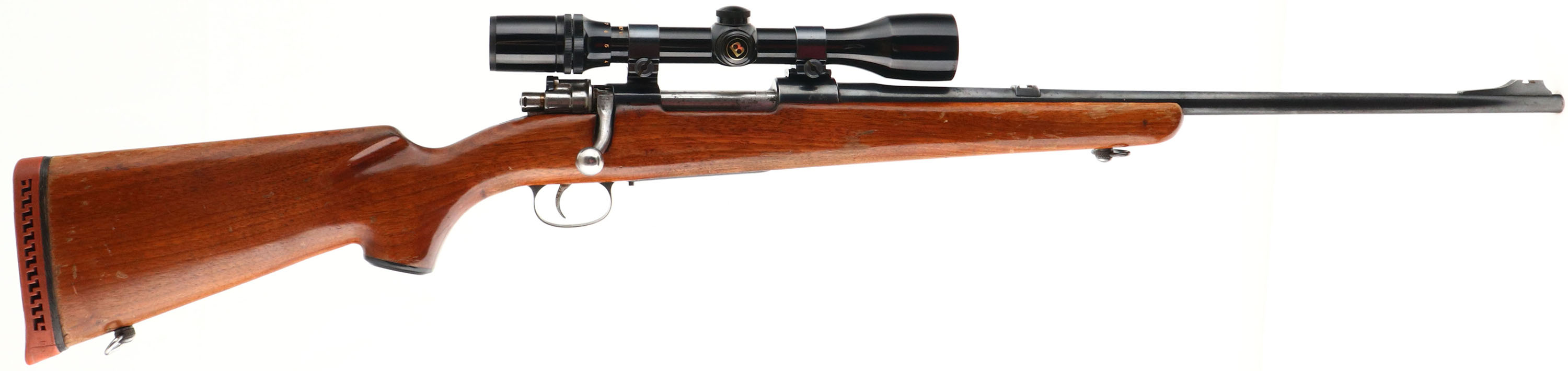 J.C. Higgins, Model 50, CAL: 300 WIN MAG, MFG: 1950's, SN: 12402, Bolt Action Rifle, 22'' barrel. Belgian FN 98 Mauser action & a barrel produced by High Standard for J.C. Higgins. This rifle started out chambered in 30-06, but has been re-chambered to 300 WIN MAG, & original caliber marking has been X'd out & barrel has been properly restamped. The capped pistol grip wood stock is very good, with several small scrapes. scuffs & contusions to the original finish, which is thinning & flaking. The metal blue finish rates 85% overall, with light spotting & additional wear on the floorplate. Bore is very good. The receiver is mounted with a Bushnell Scopechief VI scope on Weaver mounts, while the barrel has an open front & rear dovetails. Buttstock carries a ventilated J.C. Higgins recoil pad, which is a bit proud to the wood. Sling swivels. FFL or C&R Req. - Value: 300 to 600