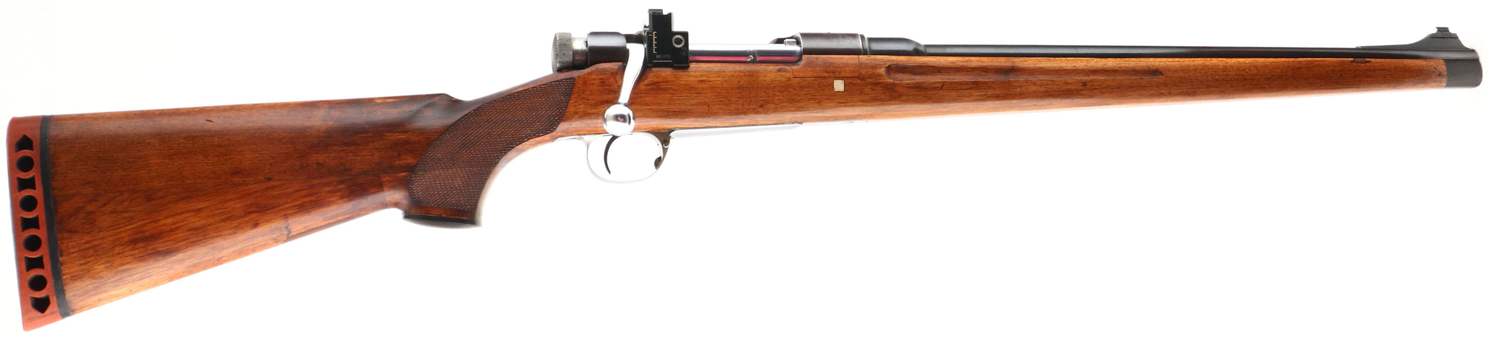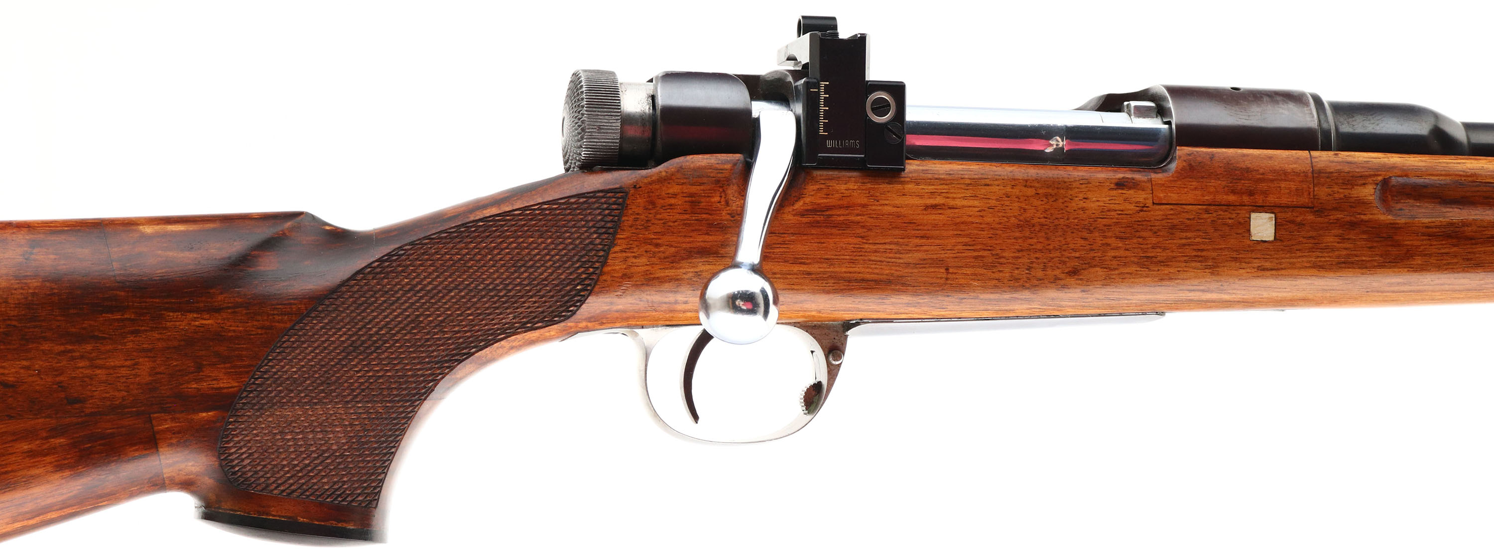 Sporterized Rifle, Built from a Tokyo Arsenal Type 38, CAL: 6.5x257mm, MFG: 1900-20, SN: 1386005, Bolt Action Rifle, 18 1/2'' Round barrel. The original stock has been altered with a number of inlaid & grafted wood sections & recontoured into a sporterized, checkered & capped pistol grip Mannlicher style stock. It was sanded & refinished & is very good, with few light handling or use marks. The metal surfaces were buffed, polished & reblued, retaining 85% reblued finish. The barrel appears original, having been cut down & carrying a replaced ramped tall blade front sight, while the receiver carries an adjustable Williams right side mounted sight. The receiver & barrel was polished, removing most of the original military markings & was refinished with what is currently a high polish plum/brown finish. The original trigger guard & floorplate have been polished silver. Bore is good & cleaned bright, but does have spots of roughness amongst thinned rifling. Stock carries a Red Head ventilated recoil pad. Silver polished bolt handle. FFL or C&R Req. - Value: 250 to 500