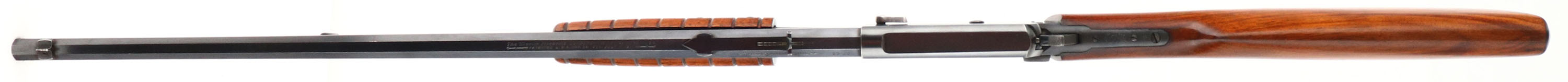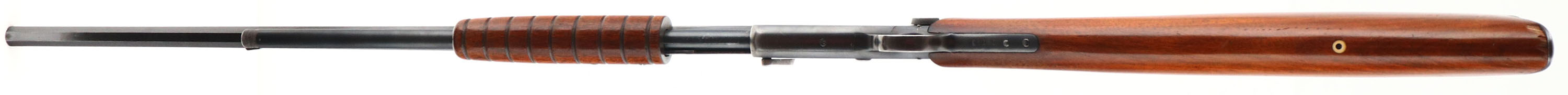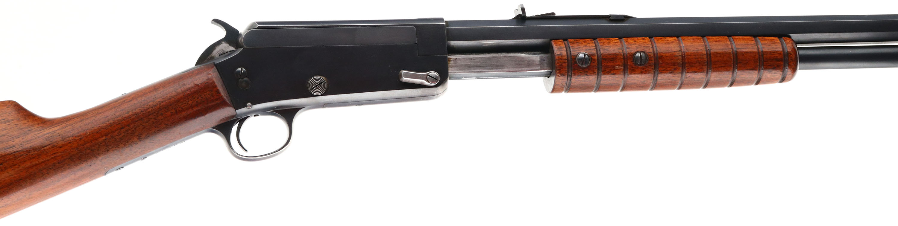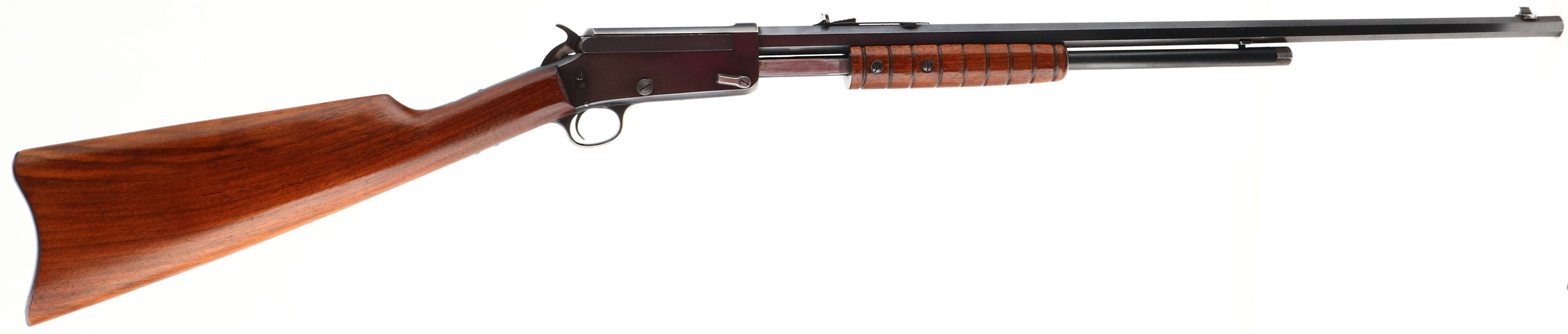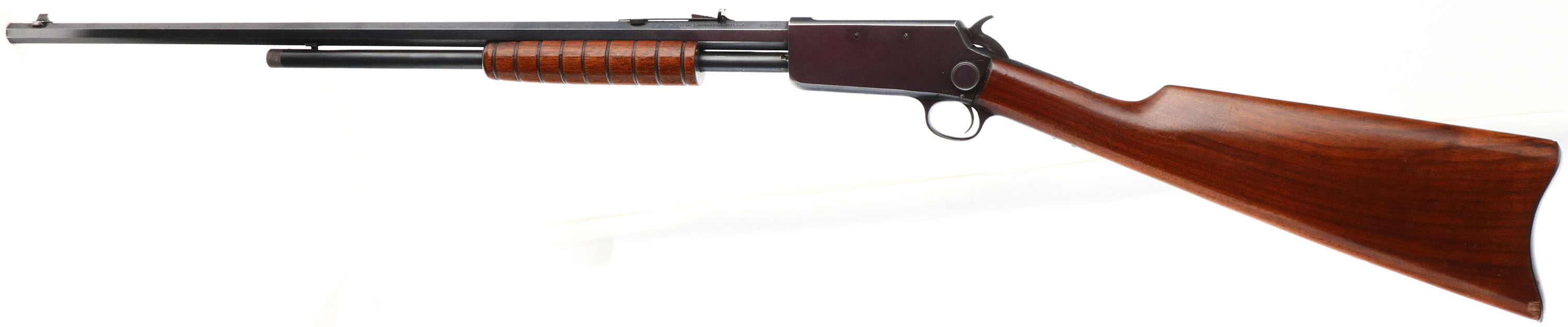 Marlin, Model 27S, marked 25-20, MFG. 1913-32s, SN: 3030, Pump Action Rifle, 24'' Octagon barrel, 2/3rds mag. The original wood stocks are excellent, with very few minor contusions & areas of thinning finish at the wrist & forend. The stock as an added thin layer of protective finish over the original finish. There is a 1''x 1/2'' grouping of missing chips at the toe of stock. The original factory metal blue finish rates 85%, with the receiver starting to tone plum. Bore is excellent. Factory rear & front sights. Metal crescent buttplate. Marlin trademark bullseye inlaid in belly of stock. FFL or C&R Req. - Value: 300 to 600