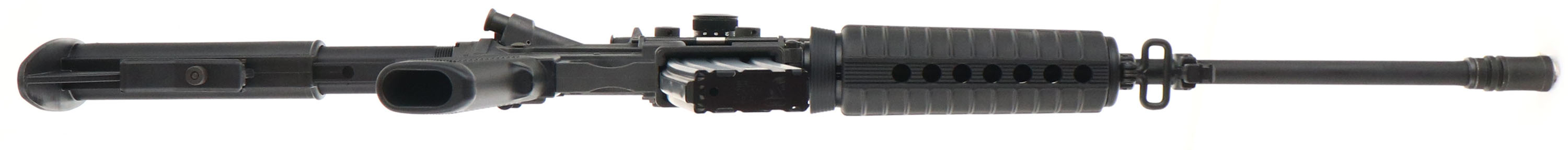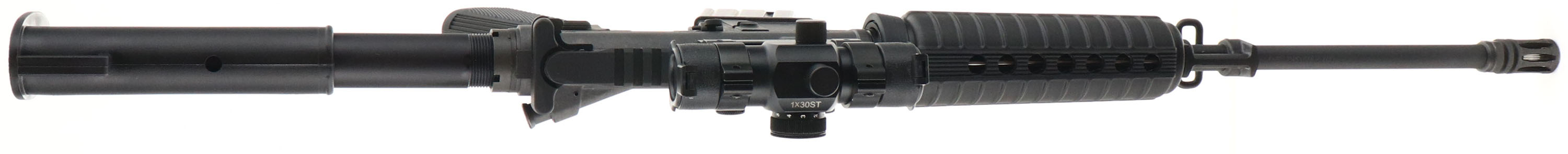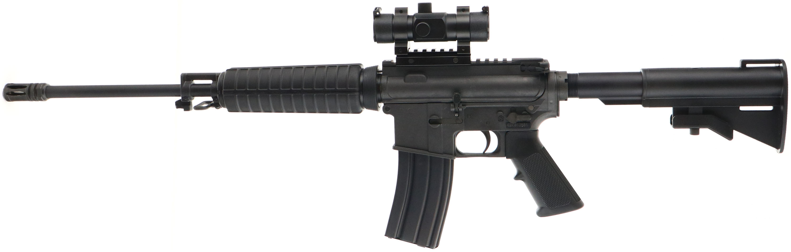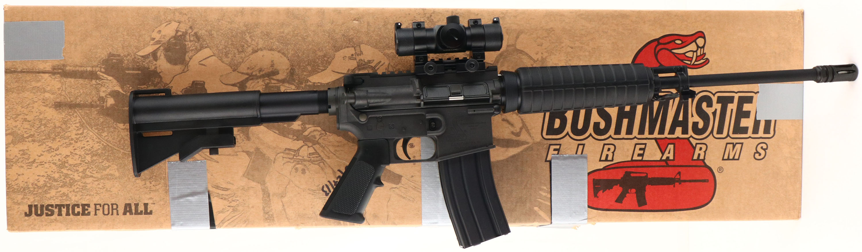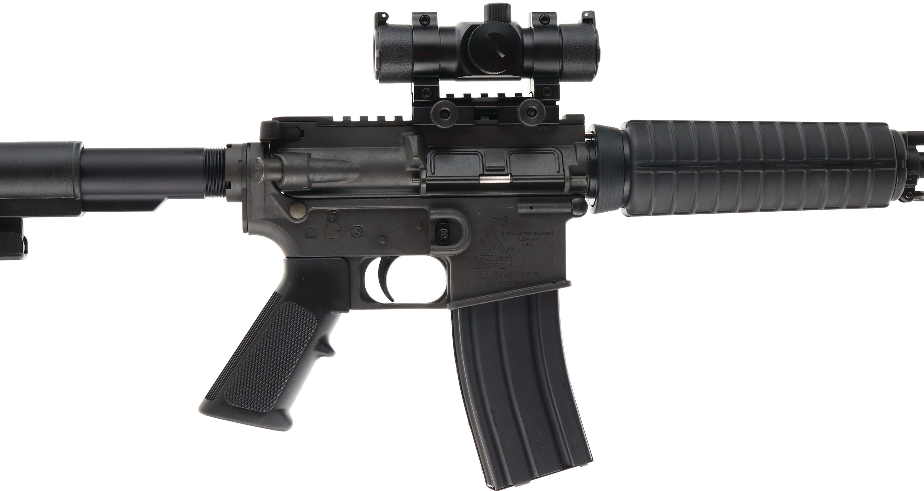 BOXED Bushmaster, Carbon 15 Optic Ready, CAL: 5.56mm or 223 MFG: Modern, SN: CBC013581, Semi Auto, 16'' 1/9 twist barrel, 17 1/2'' when including the muzzle brake. Originally developed by Professional Ordnance & later picked up in the Bushmaster line. Durable Carbon 15 composite receivers are an amazing 40% lighter than comparable aircraft aluminum receivers. The LOP slide adjustable 6-Position molded synthetic & pistol grip are excellent. Shortened A2 style forearm. The factory metal black finishes are excellent. 7'' Picatinny rail carries a new Red Dot 1X30ST sight/scope. Bore is excellent. Threaded barrel carries a bird cage hinder. Rifle carries a 30 round factory mag. Comes with the original box, with Sling, Operator Safety Manual, Chamber Flag & Gun Safety Lock. Overall excellent. FFL Req. - Value: 600 to 850