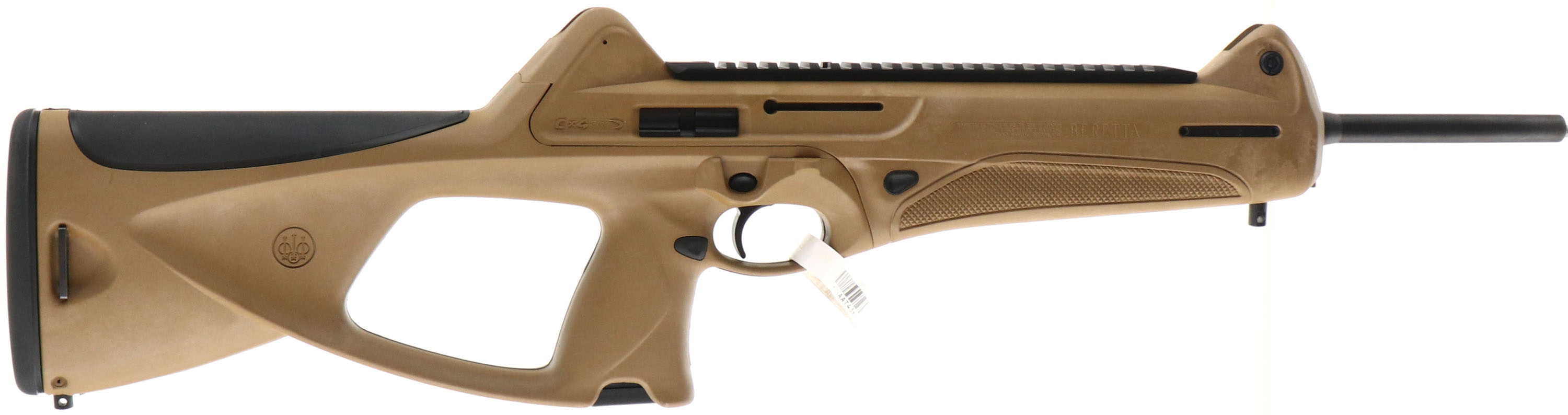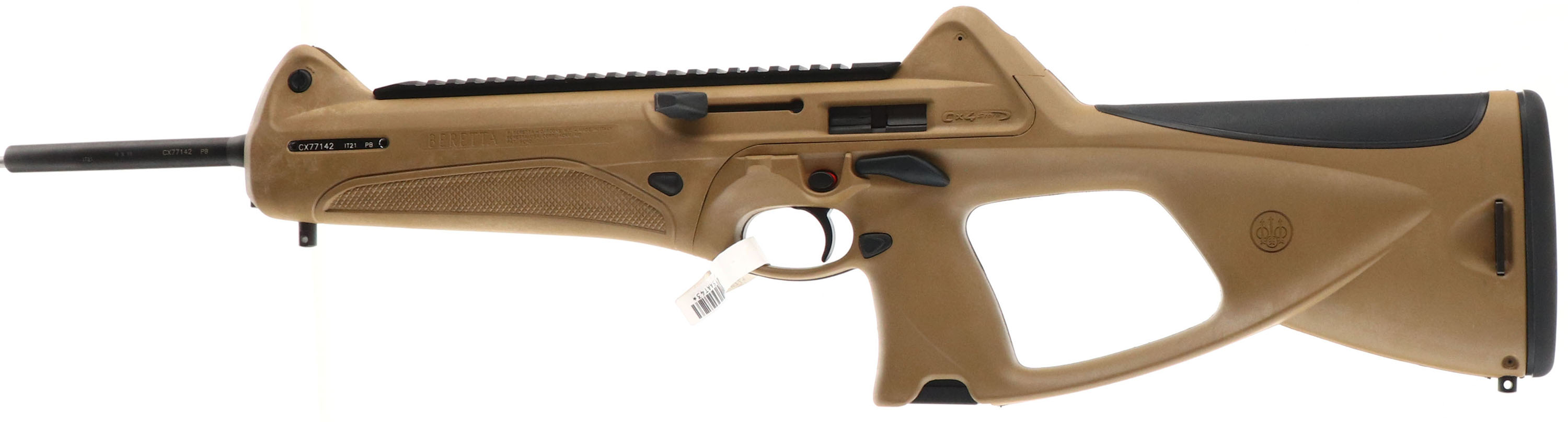 NEW, Beretta, Model CX4 Storm, CAL: 9mm, MFG: Modern, SN: CX77142, Semi Auto Rifle, 16 1/2'' barrel. The Beretta factory desert tan composite stock is excellent. The metal blue finish on the barrel rates 99%+ overall. Bore is excellent. The receiver holds a factory 10'' picatinny rail for optics. No open sight provisions. Stock carries sling studs & a solid black rubber recoil pad. HAS 17 RD magazine. NOS. No Box. FFL Req. - Value: 600 to 1000