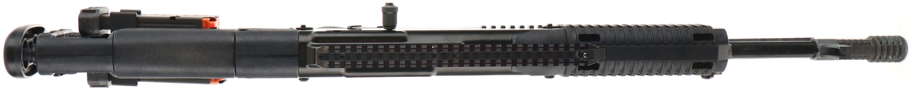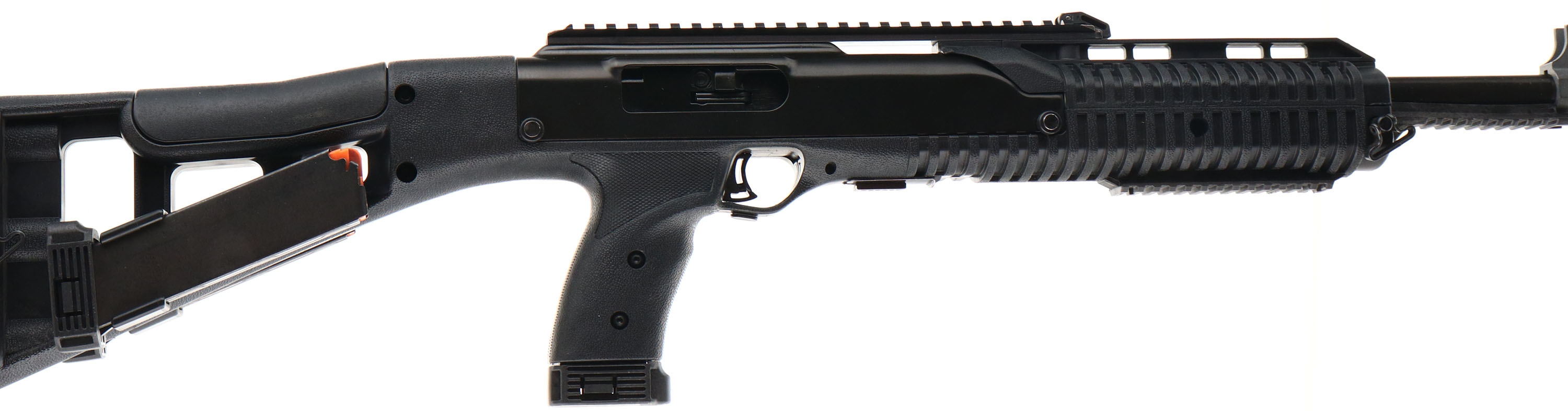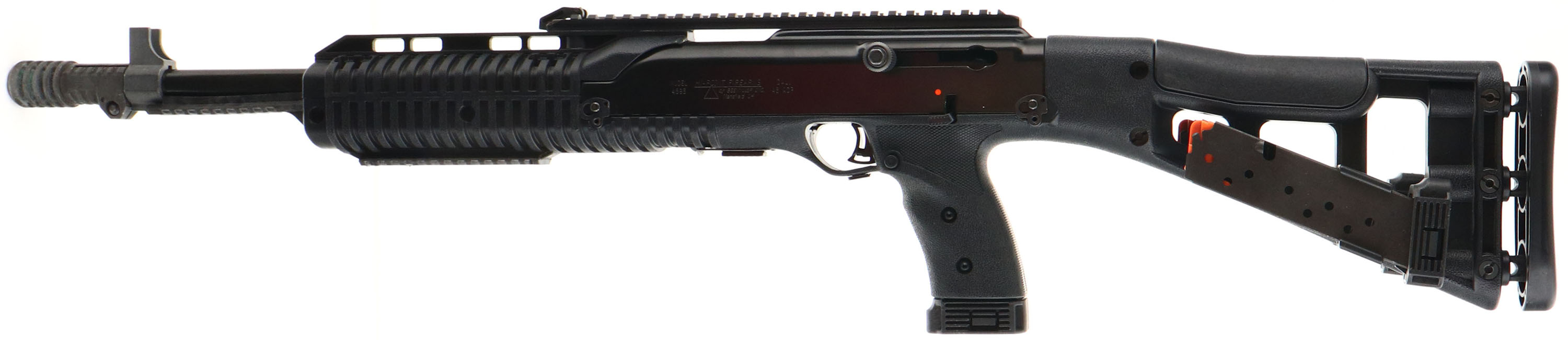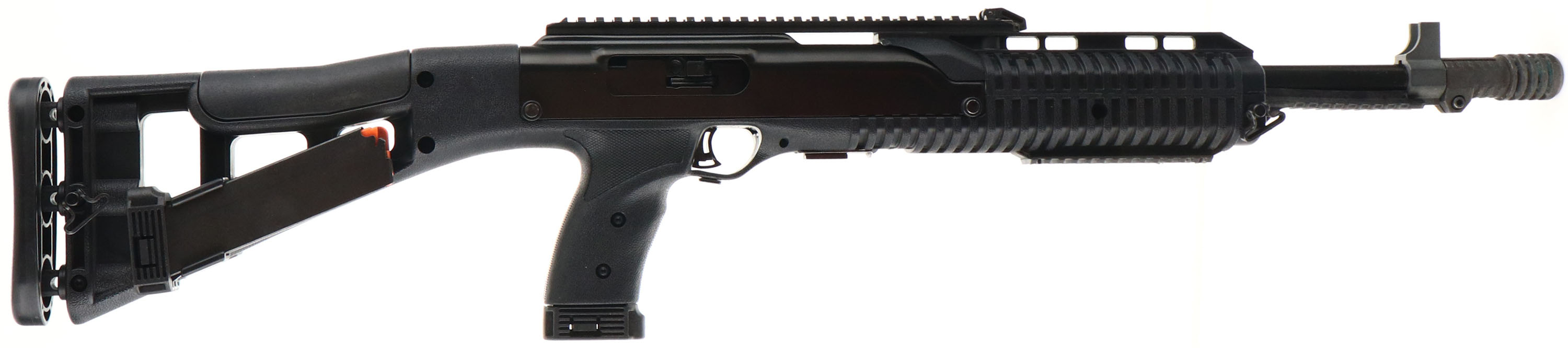 Hi-Point, Model 4595, 45ACP Cal., MFG: Modern, American-made firearm. SN: R50860, Semi auto rifle, 17.5'' barrel, 20'' with muzzle brake. 32'' overall length. The black all-weather molded polymer skeletonized stock & pistol grip, with internal recoil buffer, is excellent. The original black metal finish rates 99%. Bore is excellent, No optics, but a post front sight base & 10'' Picatinny rail for scope or optic mounting. Grip-mounted mag release. Has three 9 round mags, two of which are side of stock mounted. Sling swivels. A compact & rapid fire rifle. FFL Req. - Value: 300 to 500