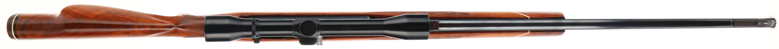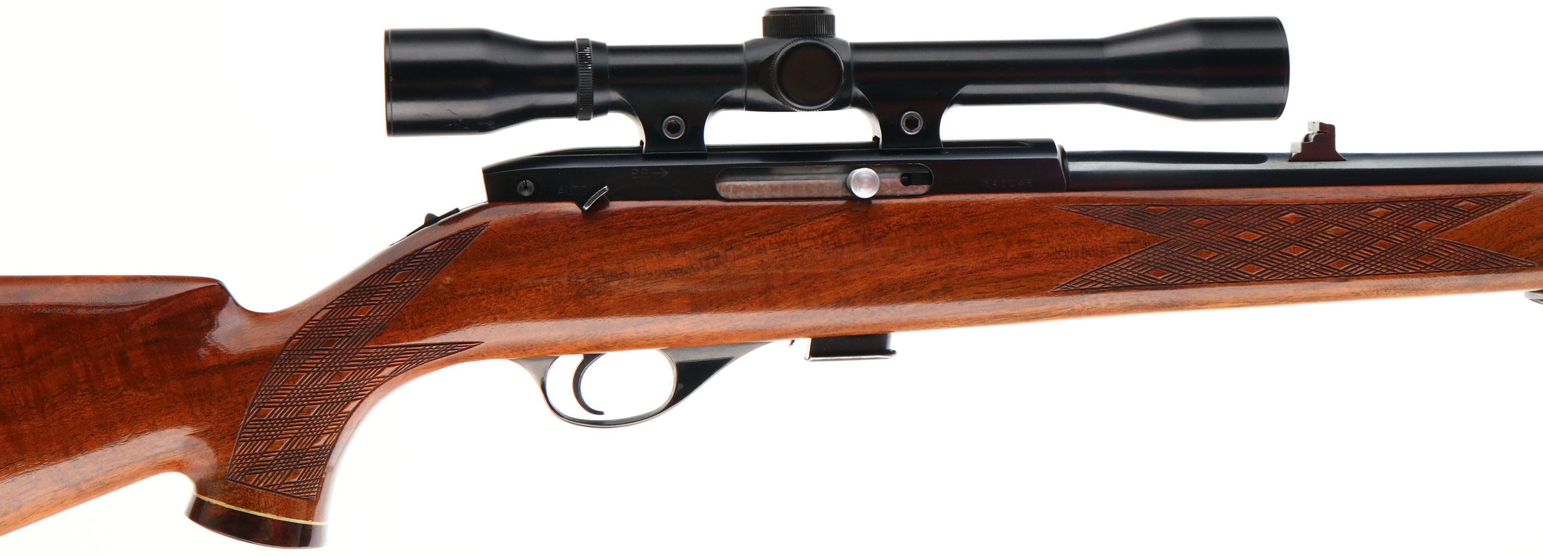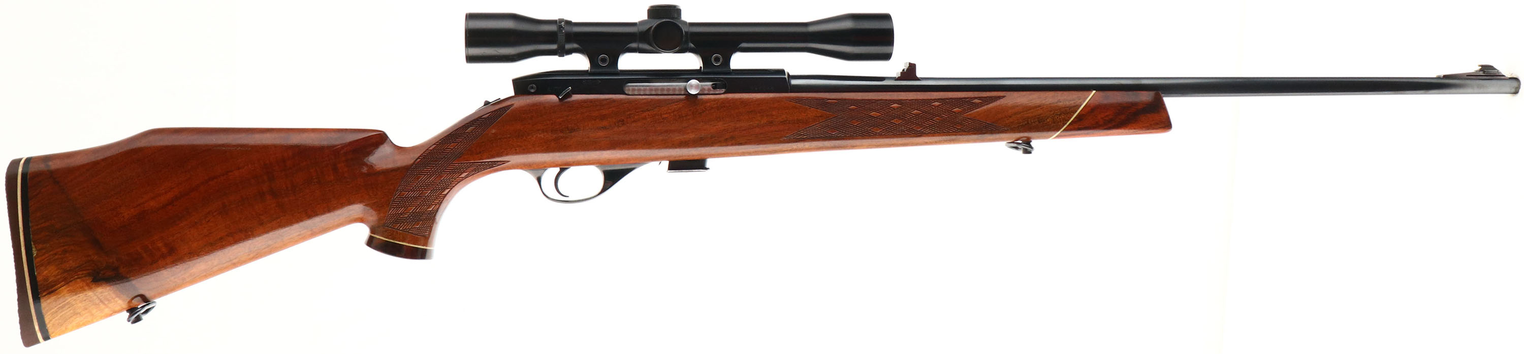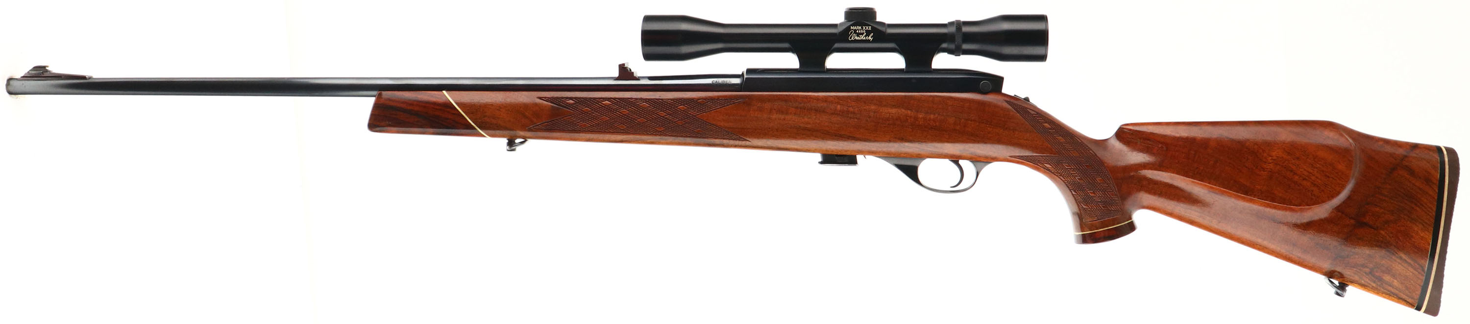 Weatherby, Model Mark XXII, CAL: .22 LR, MFG: ca. 1972-80 (Japan), SN: N46046, Semi Auto Mag Fed Rifle, 24'' round barrel. The original cheeked, skipline checkered, capped pistol grip, Monte Carlo style wood stock is excellent, displaying virtually no wear to the wood or finish. Rosewood forend tip & pistol grip cap. The metal blue finishes rate 99%. Bore is excellent. Fitted with a Weatherby Mark XXII 4x50 scope & factory rear & ramped front sights. Buttstock carries a Weatherby recoil pad & factory sling loops. Condition is overall excellent. FFL Req. - Value: 800 to 1200