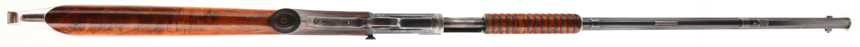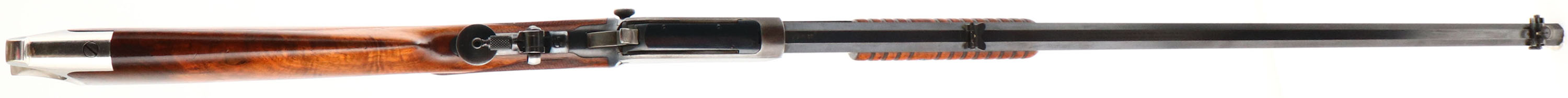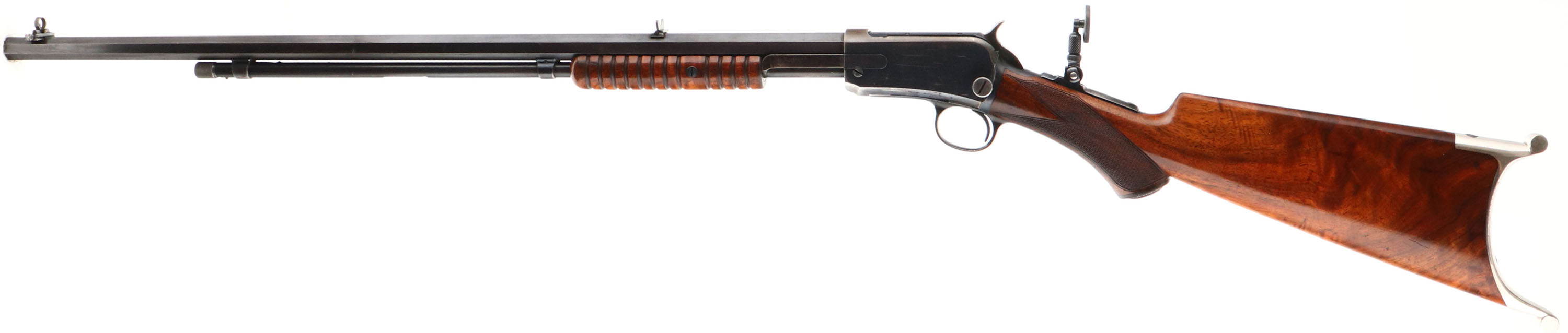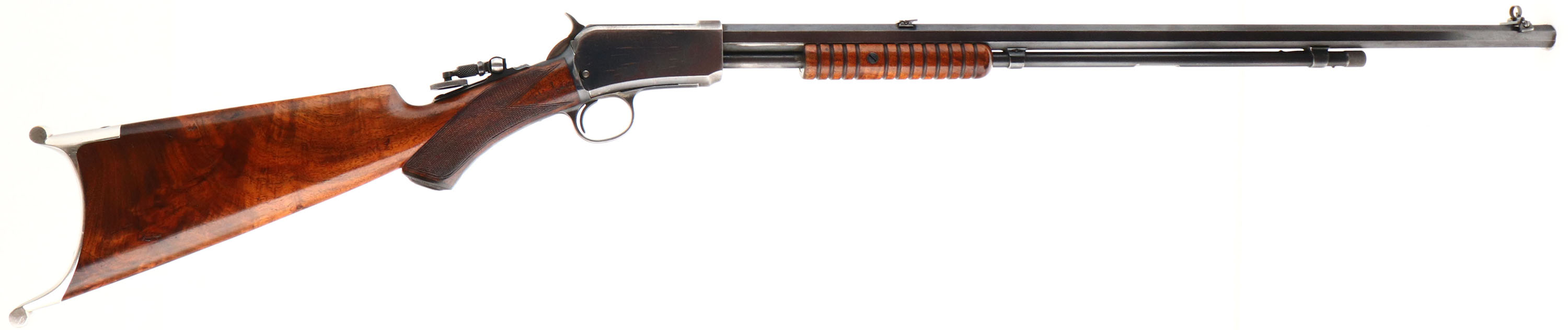 RARE DELUXE Winchester, Model 1890, NICKELED SWISS BUTTPLATE, 2nd variation, .22 WRF, Cal., MFG. 1905, SN: 234341, Pump Action Rifle, 24'' Tapered Octagon barrel. RARE LETTERED DELUXE, CAPPED PISTOL GRIP, WITH EXCEEDINGLY RARE NICKELED SWISS BUTTPLATE. According to the consignor, only 22 1890 rifles were produced with the rare Swiss buttplate. The deluxe, hand checkered & capped pistol grip wood stock is excellent. The stock displays excellent X quality rippled grain, which matches the single ''X'' stamping on the side of the lower left tang. The tang is also stamped with the assembly # 20649, which is also stamped on the end of the buttstock under the buttplate along with ''90'' for the model. The stock carries the original finish, with excellent checkering having the points rounded some from normal carry wear. There are small handling marks & light contusions. The forearm is a corncob style, which is correct as the letter refers to the rifle being ordered with only a checkered stock. The factory metal blue finish has 85% coverage on the barrel & mag, with some toning of the blue on the edges as it thins. The receiver retains about 75% of blue, with wear top & bottom & on lower tang. As indicated in the letter, the rifle is fitted with a Lyman large cup disc tang peep sight, folding leaf rear & a wind gauge sporting front globe sight, with ivory bead. Excellent bore. Comes with the factory letter. This is an extremely rare, & highly desirable special order rifle, with a rare configuration collectors desire. FFL or C&R Req. - Value: 12000 to 15000