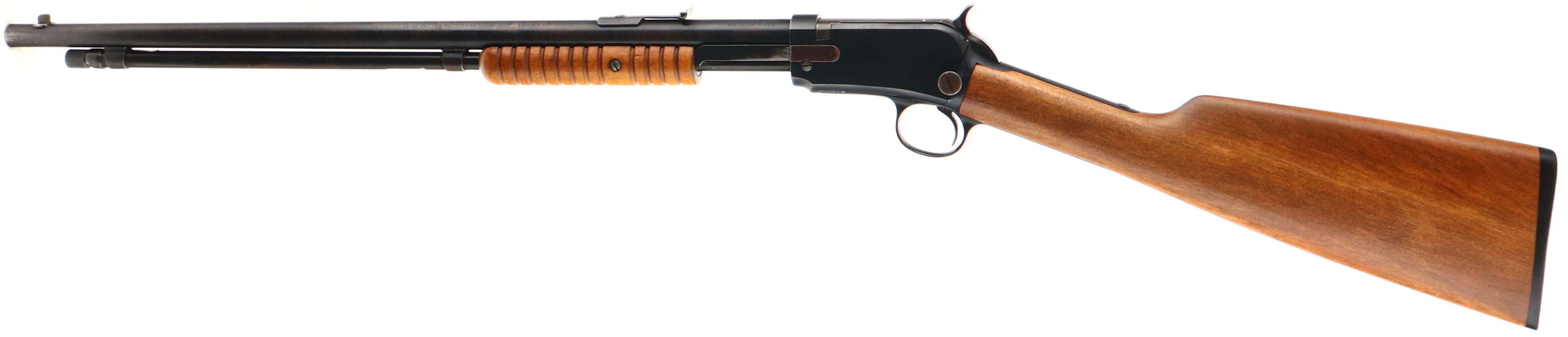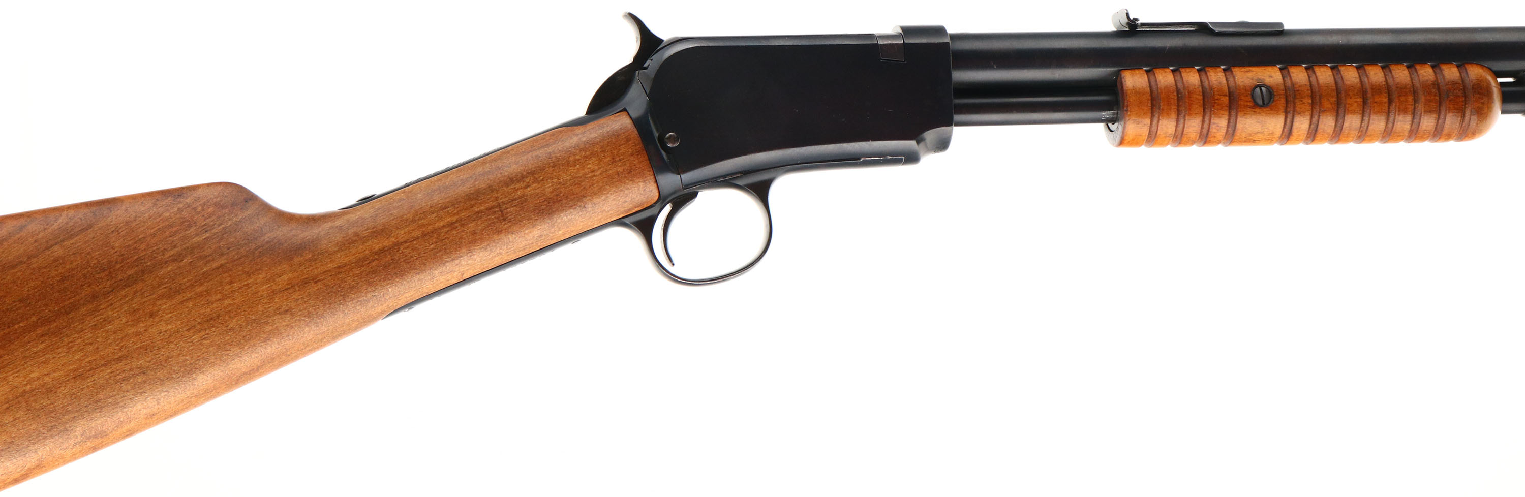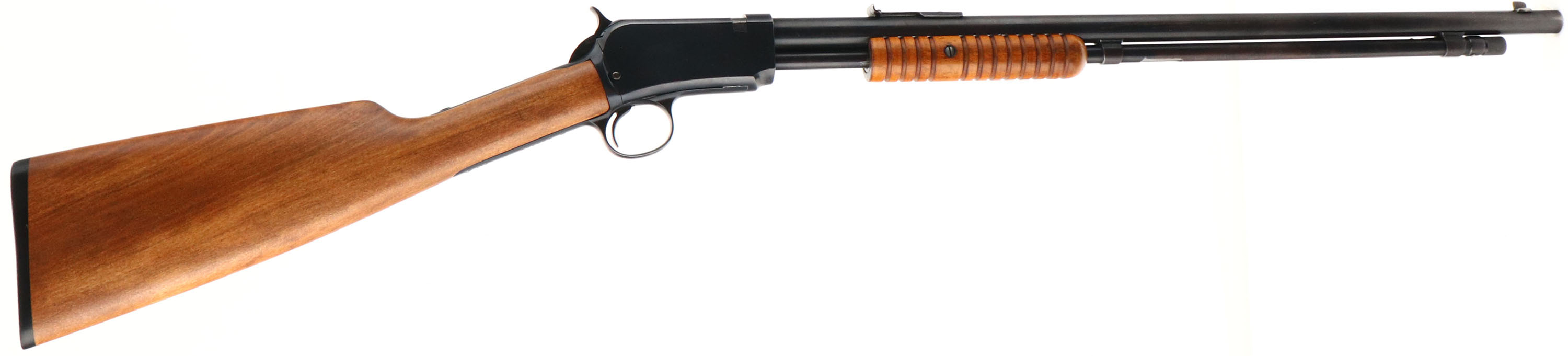 Winchester, Model 1906, .22 S. L. & LR. Cal., MFG. 1907, SN: 794167, Pump Rifle, 20'' Tapered round barrel. Full Mag. The original gum wood stocks are solid & excellent. The original factory finish is excellent, with only a couple tiny contusions. Metal retains 85% original blue, with loss due to some flaking on the top of the receiver & thinning or spotting on the barrel & mag. Original front & rear sights. Bore is excellent, Winchester buttplate. Rare very high condition collectors' example, with great eye appeal. FFL or C&R Req. - Value: 2000 to 3000