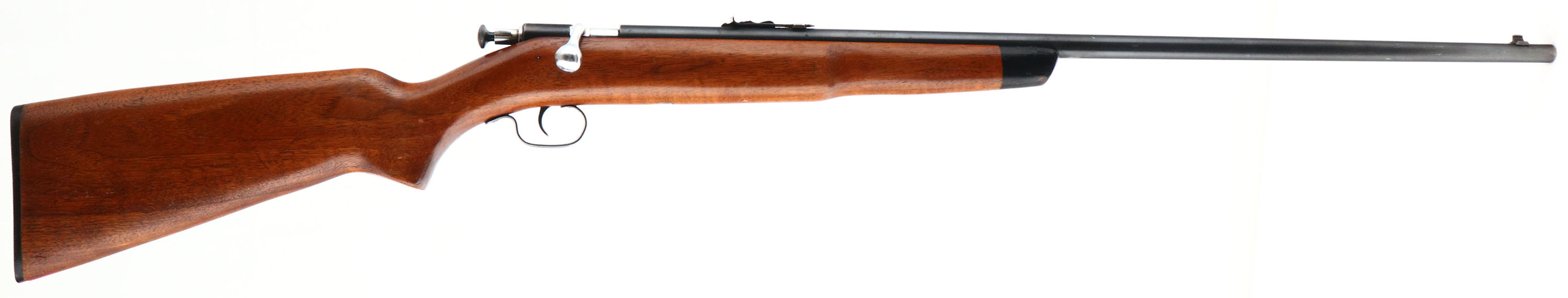 Winchester, Model 67, 22 S, L, LR Cal., MFG: 1934-63, SN: None, Bolt Action Rifle, 27 1/8'' Round barrel. The flat pistol grip wood stock is very good & solid. It has been recontoured or narrowed at the forend & refinished. The stock has some minor scrapes, scratches & contusions. There is a small ''HM'' lightly scratched into the right side of the forend. A set of #'s has been carved into the flat of the pistol grip & the matching #'s are electric pencil engraved onto the bolt. The metal blue finish is 90% overall. Bore is very good. Barrel mounted with an adjustable rear sight & small blade front sight. There is a bit of pink fingernail polish at the toe of the rifle. Winchester plastic buttplate. FFL or C&R Req. - Value: 150 to 300