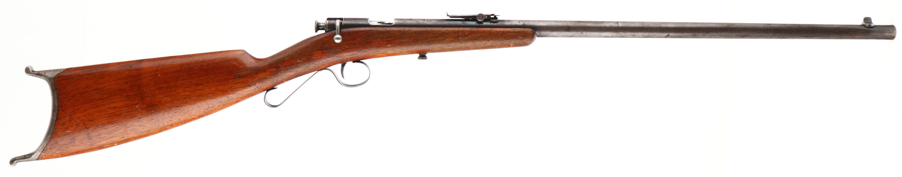 Savage, Model 1905, .22 S, L, LR Cal., MFG. 1905-24, SN: 26720, Bolt Action Single Shot Rifle, 22'' round barrel. The factory perch belly stock is very good & carries a fantastic Schuetzen style buttplate. The finish carries an added layer which has worn thin & is flaking in areas, with small scratches, scrapes & contusions. The factory metal blue finish has worn gray, with a spotty brown patina. Bore is fair, dark & rough, but with some visible rifling. Mounted with Savage marked adj. rear & front sights. A classic looking .22 rifle. FFL or C&R Req. - Value: 150 to 300