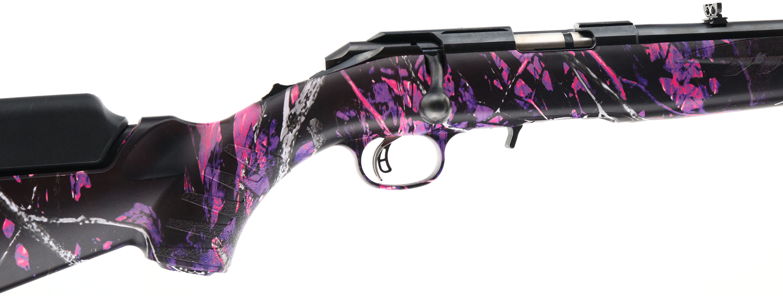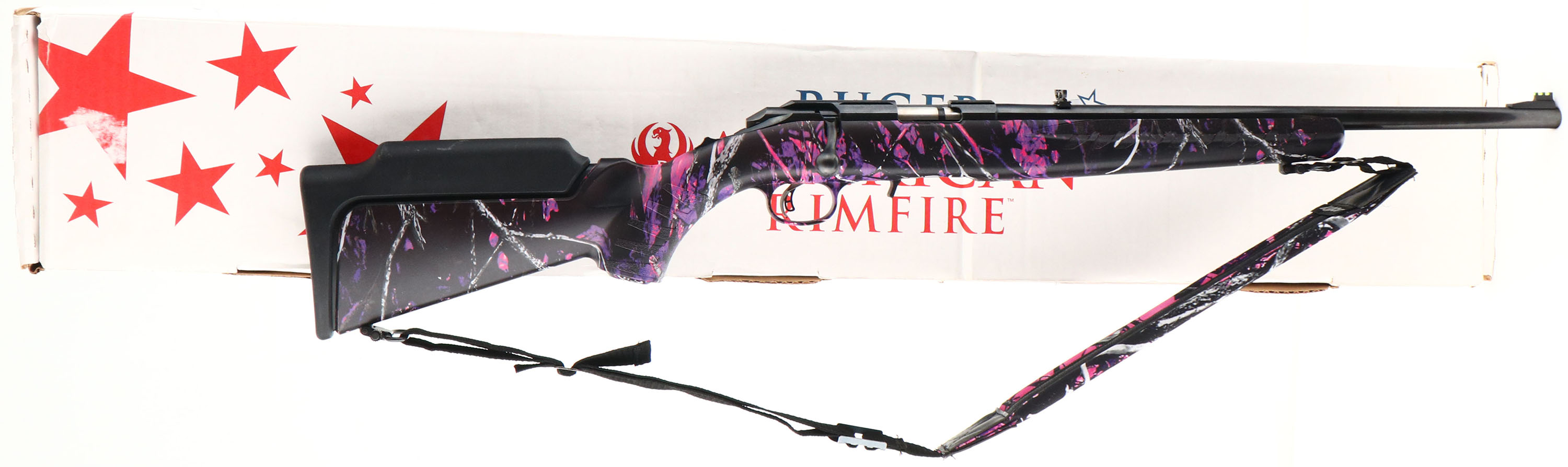 BOXED Ruger Model American (RF-C-CamGP), Talo Exclusive, CAL: 22 LR, MFG: Modern, SN: 832-91538, Bolt Action Rifle, 18'' barrel. The original capped pistol grip composite stock is excellent, with the ''Muddy Girl Camo'' pattern. The original satin blue finish is excellent. Bore is excellent. The barrel holds original folding leaf rear & fiber optic ramped front sights. Stock has a Ruger solid black rubber recoil pad. Sling loops present. 10 round detachable mag. Comes in the factory box, with booklet & sling. FFL Req. - Value: 200 to 400