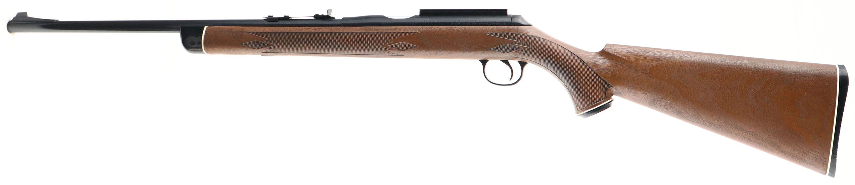 BOXED, Daisy & Heddon, VL Rifle, CAL: .22 Cal. Caseless VL Ammo, S/N: A034639, 18'' barrel. The original checkered & capped pistol grip wood grain plastic stock, with ebony toned forend tip, is excellent. The original metal blue finish rates 99%+ overall. Bore is excellent. The barrel holds an adjustable rear sight & ramp elevated blade front sight. Stock carries a VL grooved plastic buttplate. Comes in the original box, with internal packaging, a booklet & warranty card. FFL Req. - Value: 300 to 600
