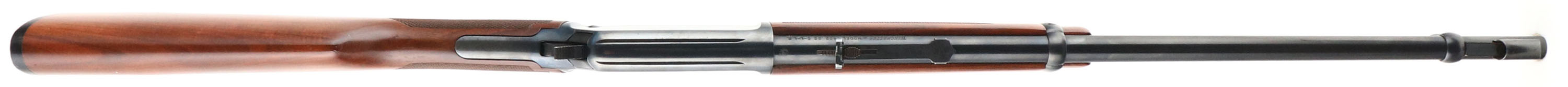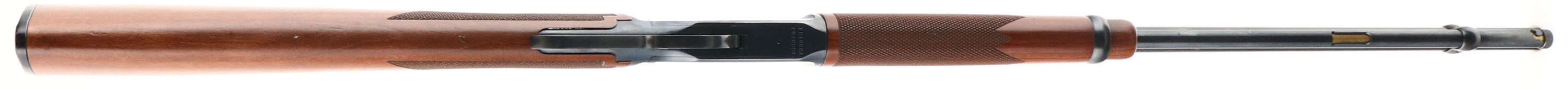 Winchester Model 9422 WIN Magnum, CAL: .22 S, L, LR, MFG: Modern, SN: F610004, Lever Action Rifle, 20 1/4'' barrel. Grooved receiver. The original Checkered & straight grip wood stocks are excellent, displaying factory finish & very few tiny handling marks. The original metal blue finish rates 98% overall, but with a few small spots of cleaned pitting on the right side of the receiver. Barrel holds an adjustable rear elevator sight & large hood front sight. Bore is excellent. Buttstock carries a factory Winchester, checkered, black plastic buttplate. An excellent overall rifle. FFL Req. - Value: 600 to 1000