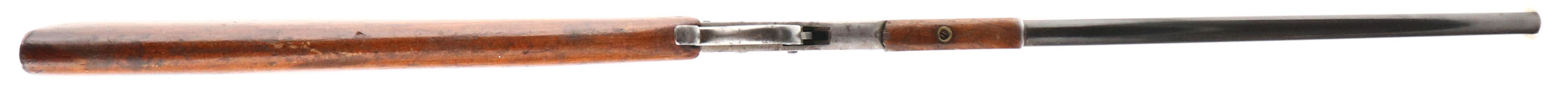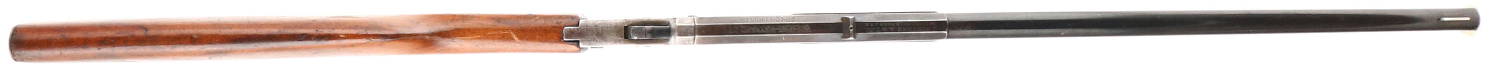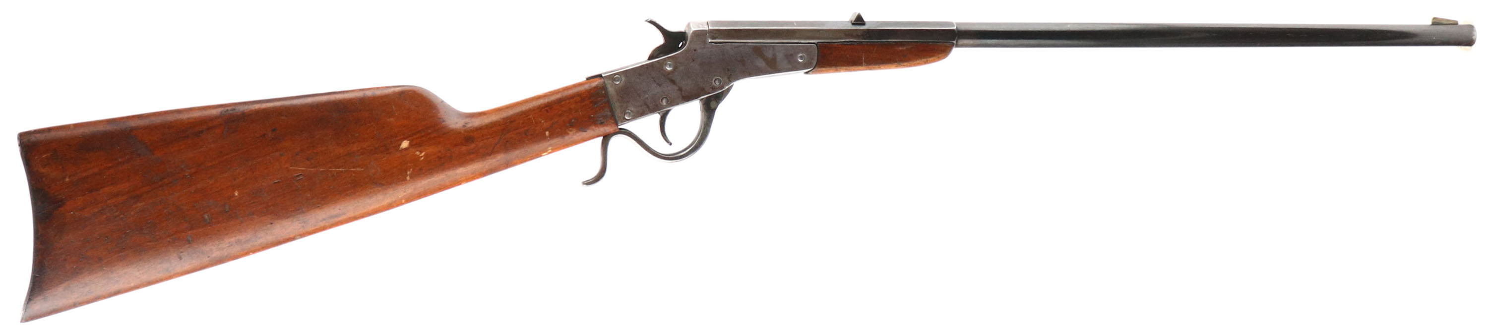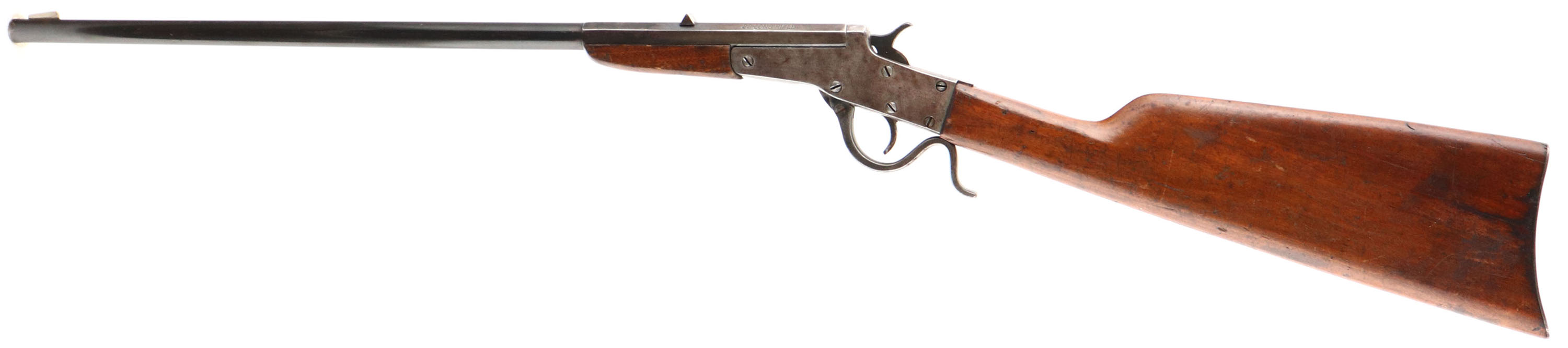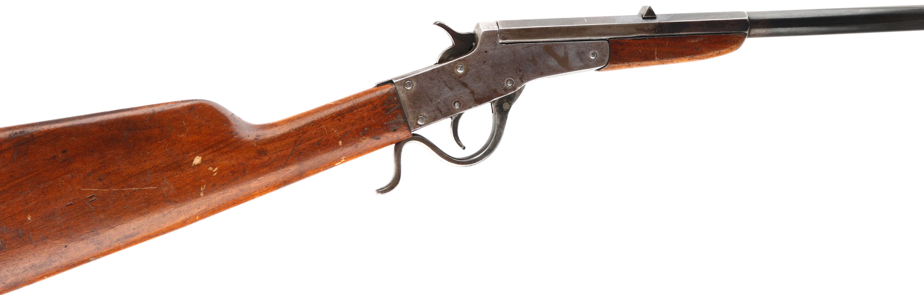 J. Stevens A&T Co., Model: Stevens Maynard Jr. No. 15, Cal: .22 LR, MFG: 1906-12, S/N: None, lever action single shot, 18'' octagon to round barrel. 1 turn in 16'' r.h. twist. The model was made from 1900 -12. When production began, the stocks were made from a flat board, which was later changed in 1906 to an oval style like on this example. Most rifle of this model were chambered in short & long, with rarer examples being marked ''LONG RIFLE''. The straight wrist wood stock & forend are very good, with various dings, scrapes, & scratches from use/age. The barrel retains about 50% bluing, with most of the worn areas located on the back portion of the barrel. The receiver is worn to a gun metal gray & toning to a thin brown patina. The receiver has worn to gun metal gray, with a brown patina. The top of the barrel is marked ''J. STEVENS A&T. CO.'', ''CHICOPEE FALLS, MASS. U.S.A.'', ''STEVENS-MAYNARD JR.'', ''22-LONG RIFLE''. The bore is fair, with roughness & pitting amongst visible rifling. The barrel holds a blade front sight & a V-notch fixed rear sight. The stock carries a smooth steel buttplate. FFL or C&R Req. - Value: 150 to 300