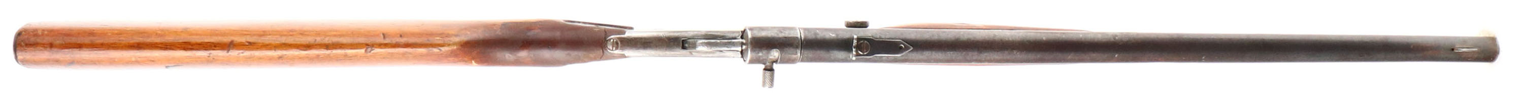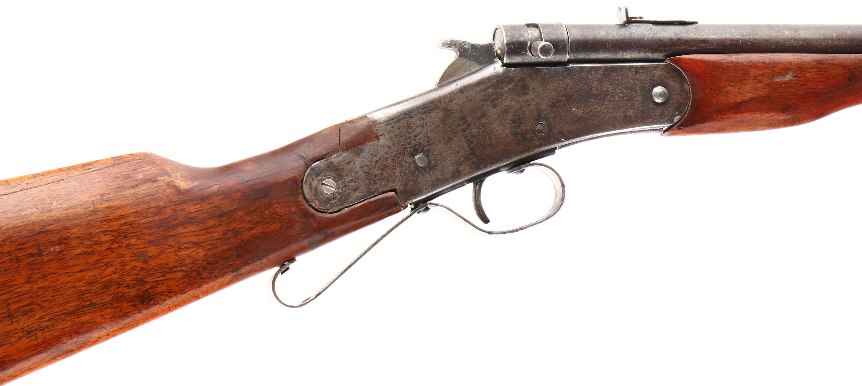 C.J. Hamilton & Son, The Hamilton Rifle Model 027 (USA produced version), .22 LR, MFG 1908-30, SN: None, Break single shot rifle. 15'' Round barrel. The model 027 was considered the more expensive version of the model 27, as they carried an oval shaped stock made of walnut rather than a flat birch board. Early examples had the same brass barrel liner, which was later changed to a steel liner. The factory walnut wood stocks on this example are fine & solid, despite having a brake repair at the wrist requiring some filler & a couple of stress cracks at the wrist. The stocks have been sanded & refinished. The stocks show some staining & other minor scuffs or handling marks. The original metal blue finish has worn & toned to gun metal gray & a spotty brown patina, with some speckling & nick or abrasions. Steel rolled barrel over brass bore liner, 6 groove bore with 1 turn in 15''. The brass bore is good, with lots of rifling remaining. Barrel carries original open iron sights. Thin metal buttplate. A fairly rare Hamilton single shot rifle. FFL or C&R Req. - Value: 80 to 150
