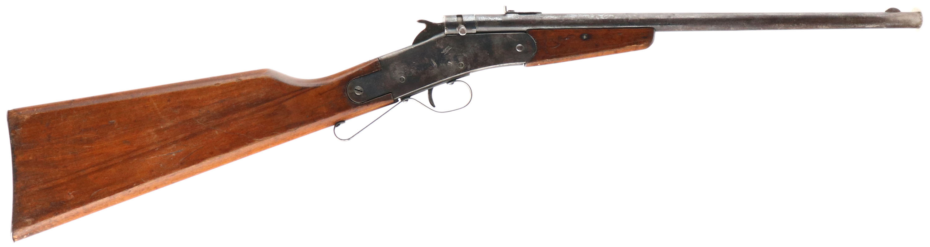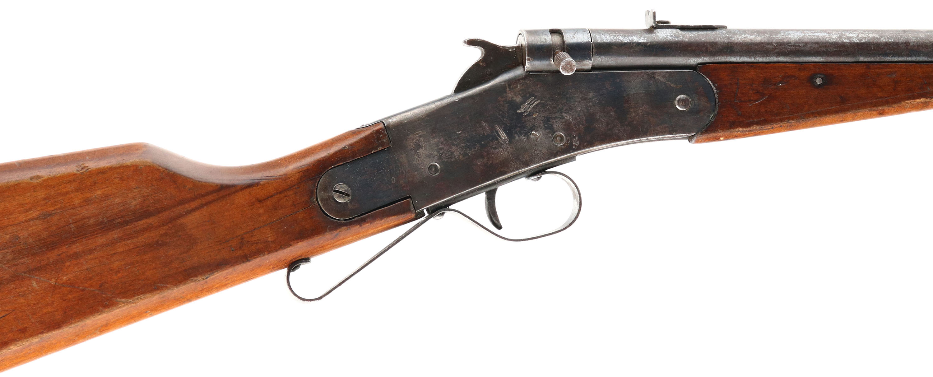 The Hamilton Rifle Co. Model 27 (Tip-up Model), 22 CAL (S. & L.), MFG: 1907-30, SN: NONE, Single Shot, Tip-up Break Action Rifle, 14 7/8'' round barrel. 29 1/2'' overall length. The flat board, straight grip, walnut stained birch stocks are good & solid, despite two 2'' stress crack to the left side of wrist & one on the right side. The letter ''H'' is thinly scratched onto left side of stock. They carry the original finish, which is thinning from use & display a variety of scratches, dings & edge wear. The original metal blue finish has toned mostly to a brown patina, with some remnants of blue on receiver. Metal has speckled rust & a few abrasions on the receiver. Steel rolled barrel over brass bore liner, 6 groove bore with 1 turn in 15''. Bore is fair, with some rifling remaining amongst roughness. Half moon blade front & early rear sight combination. ''S'' shaped trigger guard. Original steel buttplate. FFL or C&R Req. - Value: 70 to 140