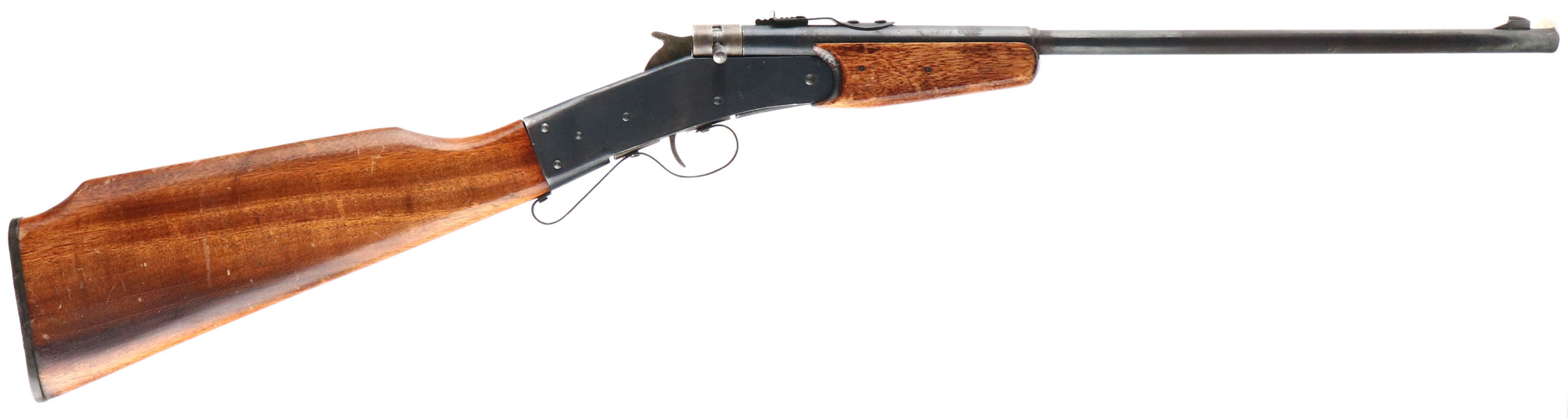 Sierra Arms Co., A Japanese version of the Hamilton Rifle (Model 027), .22 LR, MFG 1965, SN: 003827, Break single shot rifle. 17.5'' Round barrel. A California import companies version of the Hamilton model 027 from Japan. They were not very successful as many dealers thought they were too cheaply made to withstand the .22 LR caliber they marketed to fire. They closely resembled the Hamilton 027, but they carried a walnut stained Monte Carlo shaped stock, had a longer step-down barrel & were fitted with an adjustable rear sight & more substantial front sight. The action remained the same, as did the brass barrel liner. The stocks on this example are very good & solid, with an added layer of finish over the original finish. The stocks display minor scuffs, scrapes or handling marks. The original metal blue finish rates 85 on the receiver, 70% on the barrel, with some rust patina on the barrel where flaking. Bore is good. Barrel carries original sights. Black rubber buttplate. FFL or C&R Req. - Value: 50 to 200