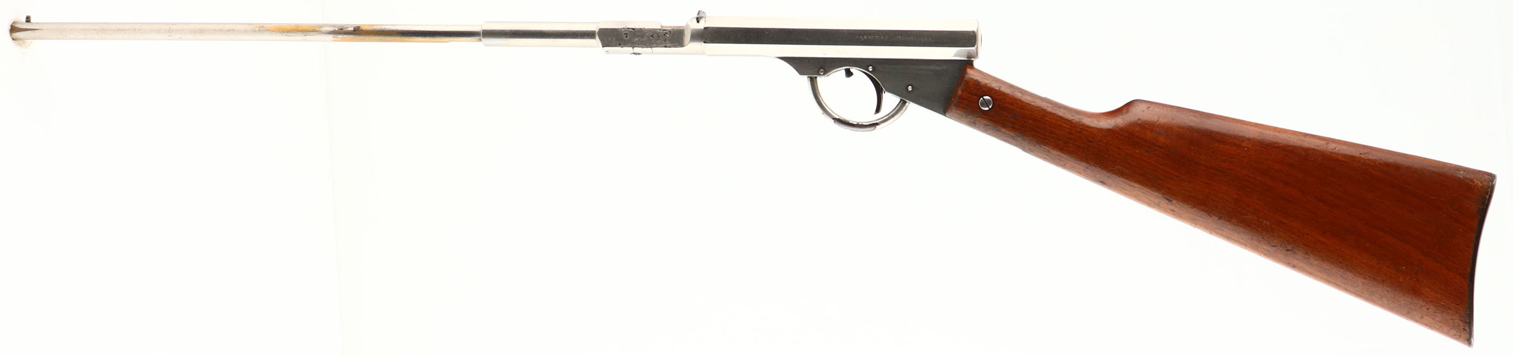 H.M Quackenbush, Model No. 1 Quackenbush Air Gun, CAL: .210'' diameter Darts & slugs, MFG: 1893-1920, SN: NONE, Single Shot Rifle, 16.5'' barrel. The No. 1 started production in 1893 to around 1920, & was the first in a line of variations & modifications, those being the models. 2, 3, 4, 7, 9 & 10. This earlier version is without the wood forearm. The original straight grip wood stock is excellent & solid. There are minor contusions, scrapes & dings, with a thin added layer of protective oil over the original finish. There is a glue repaired chip at the back of comb against the buttplate. The original nickel finish has 90% remaining on the receiver 60% on the barrel, with worn mostly due to pump action & some flaking on the trigger guard. Bore is good. Fixed rear sight & small post blade front sight. Original metal buttplate. The pumping of the barrel is very stiff & the action no longer generates compression for a shot. A good looking example that needs some gunsmith adjustment or repair. Rifle is therefore being sold ''AS IS'' with no returns. No FFL Req. - Value: 40 to 100