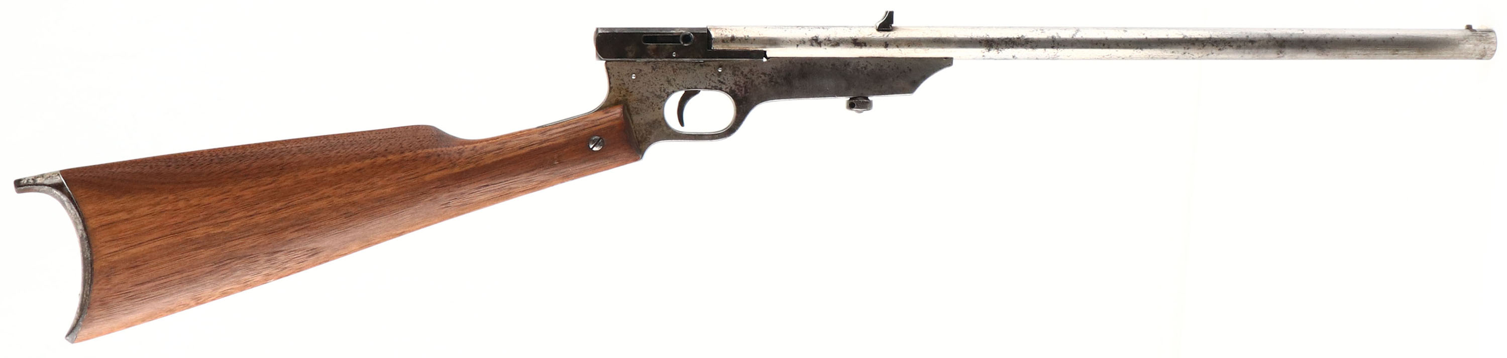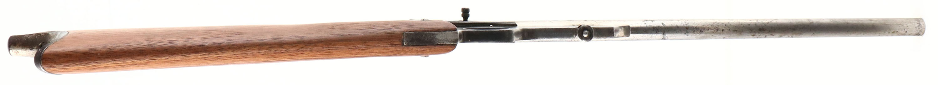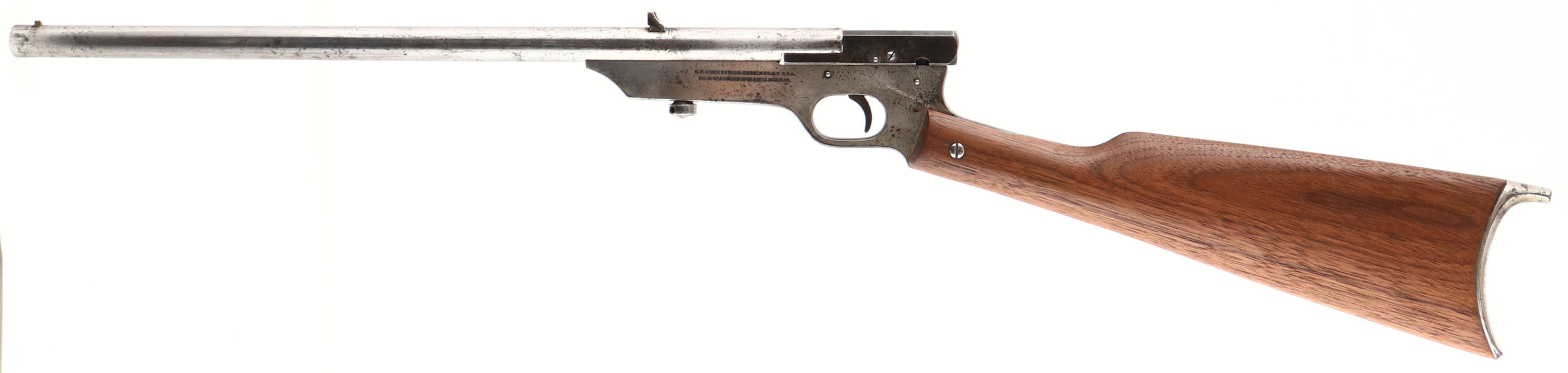 H.M Quackenbush, Safety Cartridge, CAL: 22 S,L,LR, MFG: 1890-1908, SN: NONE, Swing Gate Single Shot Rifle, 18'' barrel. The Safety Cartridge rifle started production in 1896 to around 1920, but a wood forearm was added in 1908. This is the earlier version without the wood forearm. The original straight grip wood stock is excellent & solid, having been sanded & nicely refinished. The metal surfaces have been buffed & polish due to rust pitting, but there remains a mix of original nickel, polished steel & spotty areas of cleaned black pitting. Bore is poor, dark & rough. Fixed rear sight (mounted backwards) & small blade front sight. Original early swiss style metal buttplate, with remnants of nickel finish. FFL or C&R Req. - Value: 100 to 200