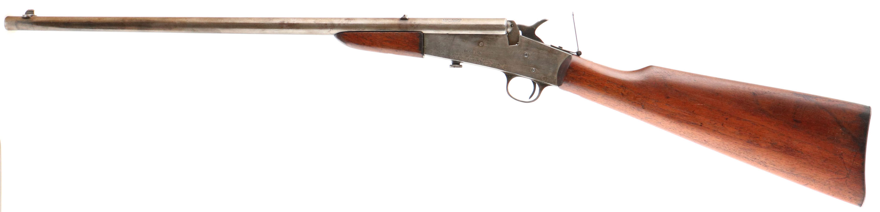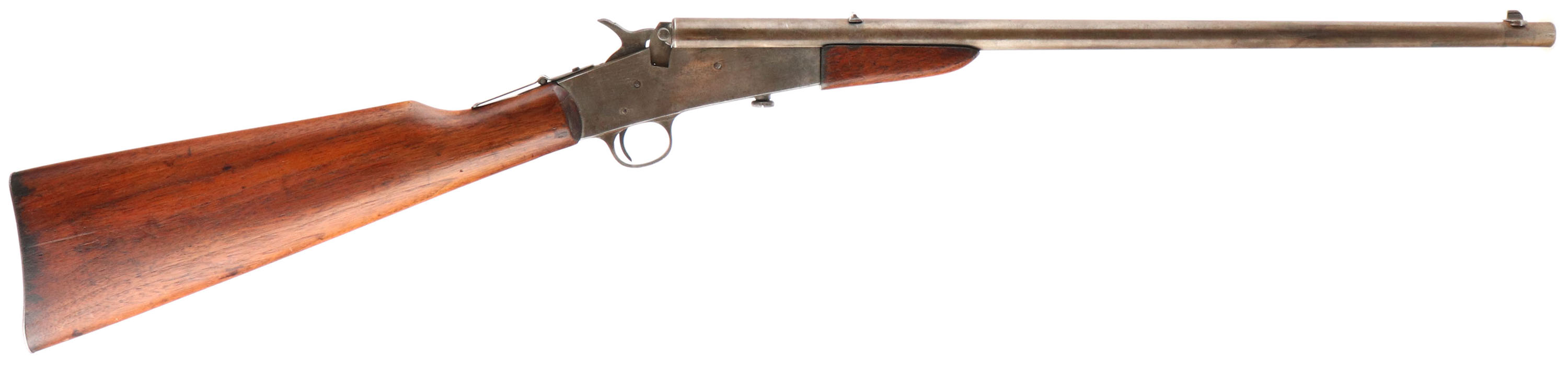 Remington, Model 6, CAL: .22 S,L,LR, MFG: 1901-33, SN: 368466 (barrel), Single Shot Falling Block Rifle, 20'' barrel. The straight grip wood stocks are very good & solid, with an added layer of finish over the original worn finish. There are light scratches, scrapes & contusions, along with a short hairline crack coming off the lower tang. Matching SN on stock. The metal blue finish on the barrel has worn to metal gray, with a thin brown patina. The case-hardened receiver has worn to metal gray & toned to a thin brown patina. Bore is fair & with consistent scarring & pitting amongst worn rifling, Fixed rear sight, blade front sight & flip-up tang peep sight. Remington-UMC smooth metal buttplate. FFL or C&R Req. - Value: 100 to 200