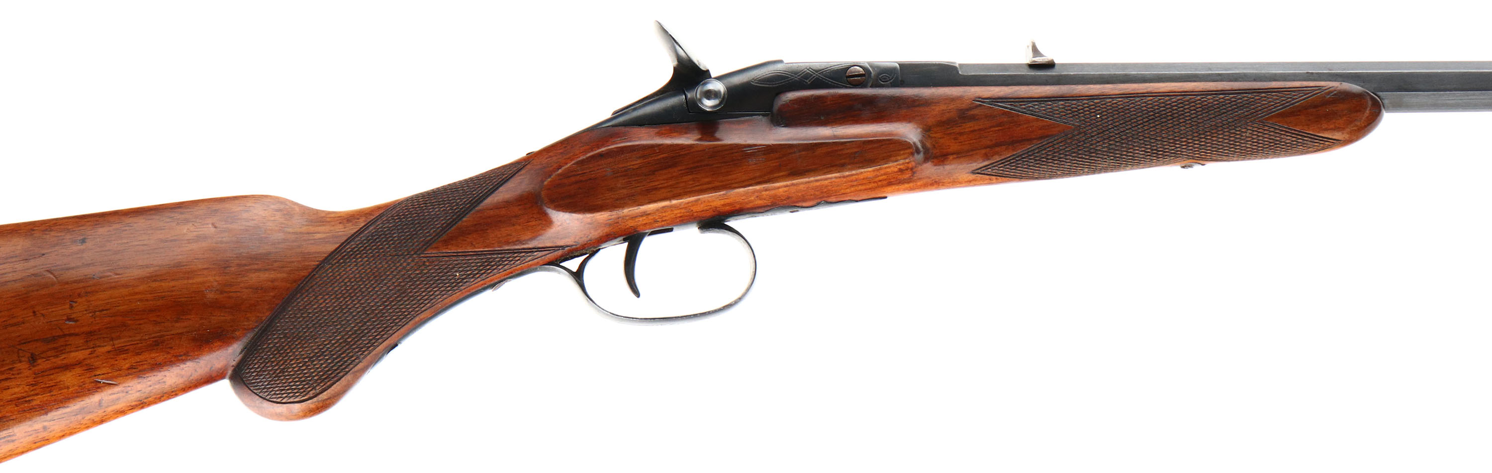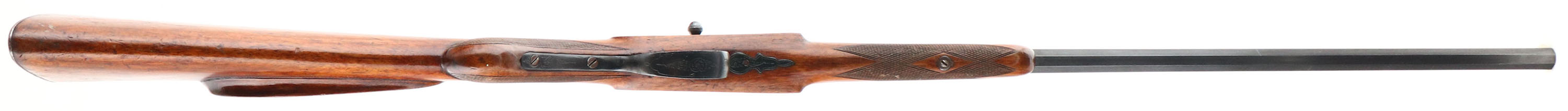 Flobert, Parlor Rifle, CAL: .22, MFG: Pre 1899 Antique, SN: NONE, Single Shot Rifle, 23 1/2'' smoothbore barrel. The checkered & round pistol grip wood stock is very good & solid, having a thin added layer of finish over the original. There are two edge chips at the left side of the receiver, along with minor contusions & scratches. The metal reblued finish has 90% coverage, with areas of rust speckling. Light decorative engraving on receiver & trigger guard. Bore is fair, but with areas of cleaned pitting. Fixed rear sight & blade front sight. Unique lift pivot extractor. Widow's peak smooth metal buttplate. Antique, No FFL Req. - Value: 100 to 250