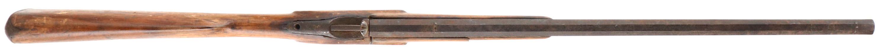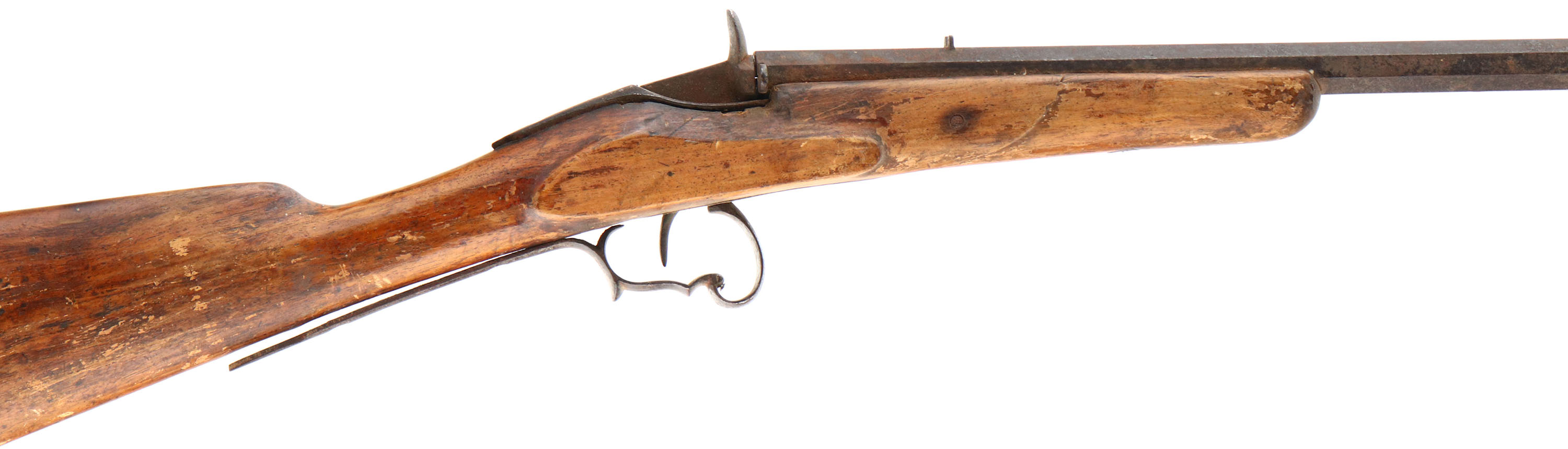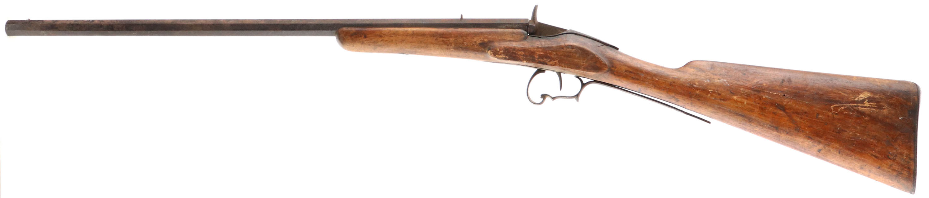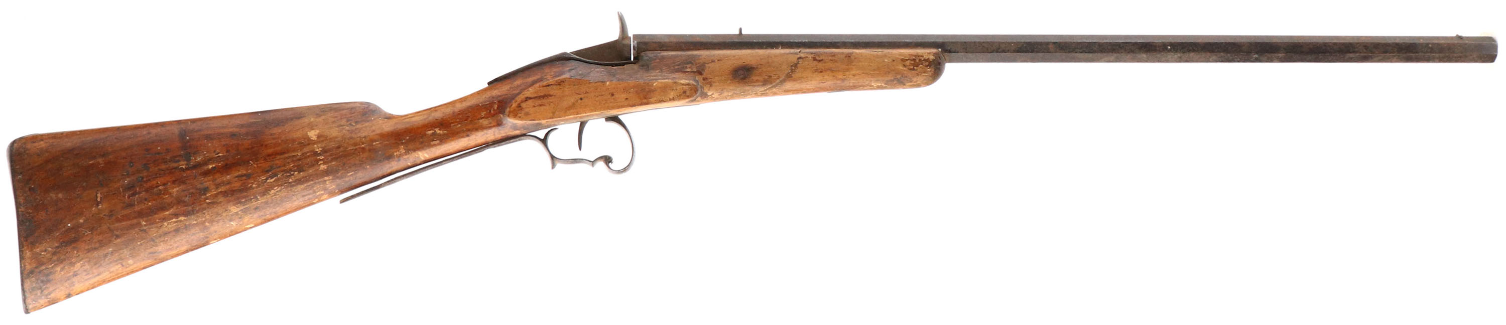 Flobert, Thumb Extractor Parlor Rifle, CAL: .22, MFG: 1880's-90's, SN: NONE, Single Shot Rifle, 22'' smoothbore barrel. The original straight grip wood stock is poor, having a large crack/brake on the left side of forend. There are numerous contusions & scratches, with most of the finish worn away. The metal surfaces are covered in rust & pitting. Bore is fair, consistently rough with areas of pitting. Fixed rear sight & small bead front sight. Widow's peak smooth metal buttplate. Missing the three stock retention screws in the upper & lower tangs. This is a project gun in need of restoration. It is therefore being sold ''AS-IS'' with no returns. Antique, No FFL Req. - Value: 20 to 80