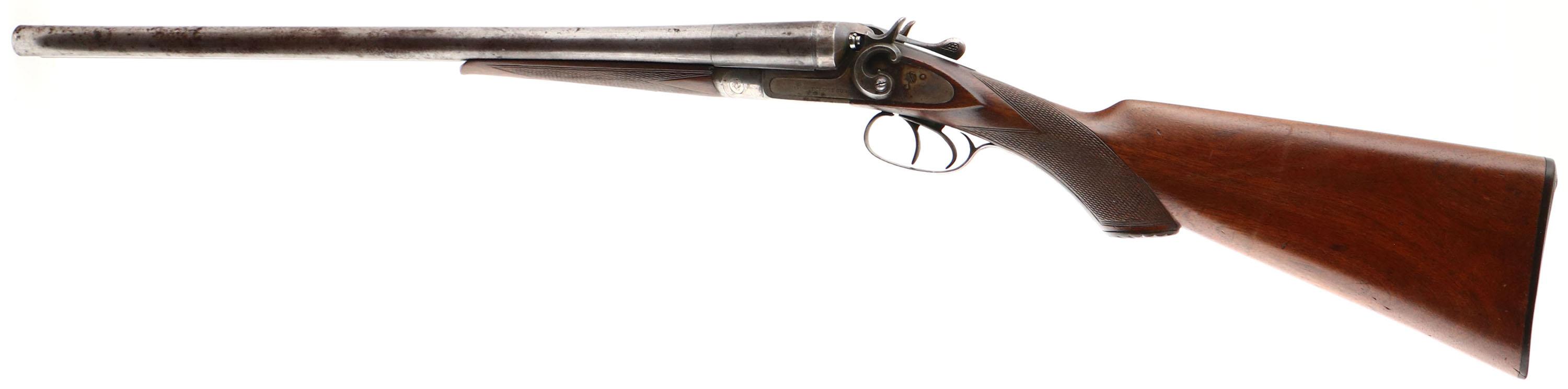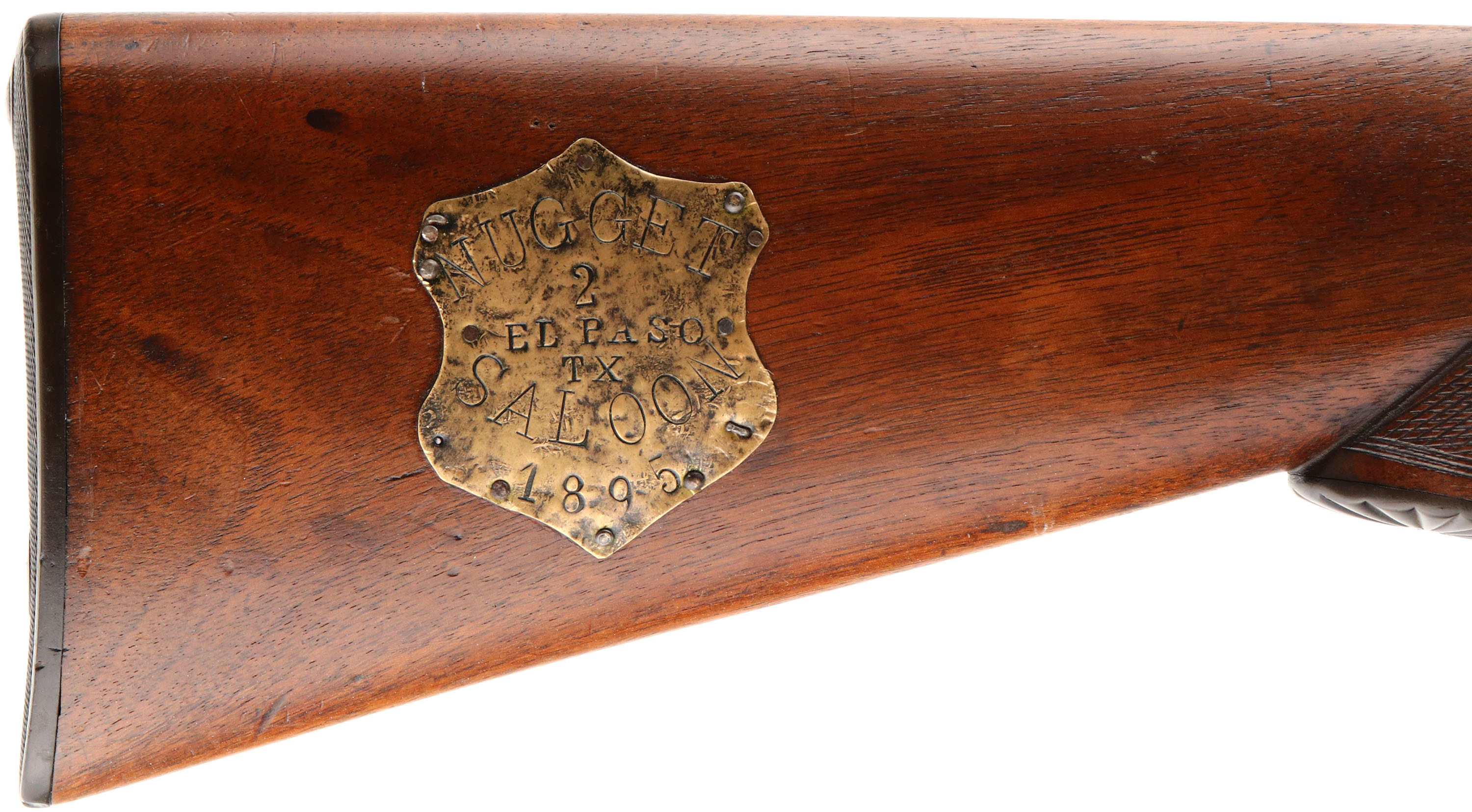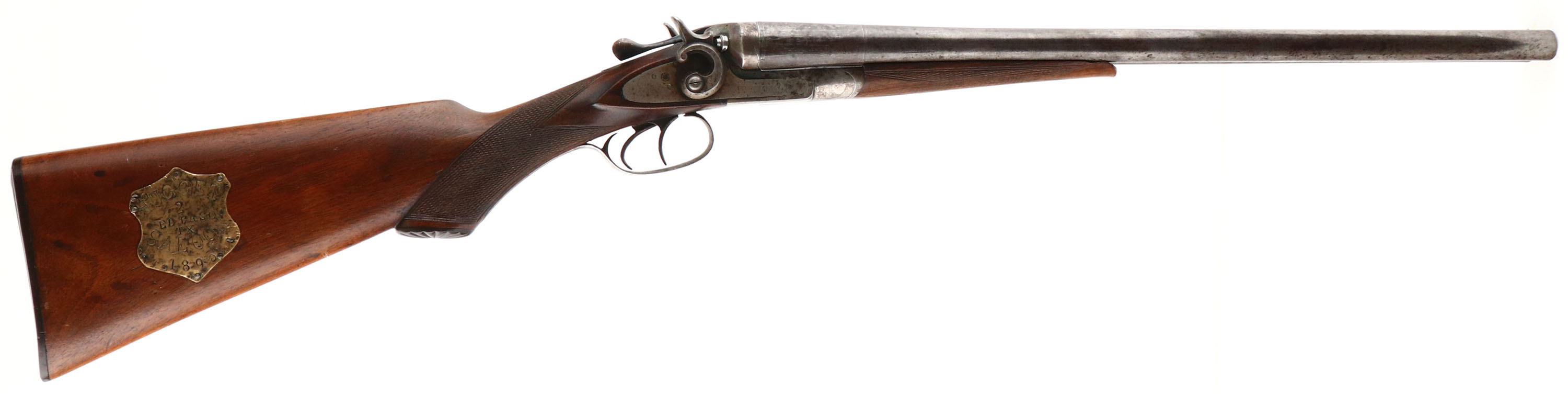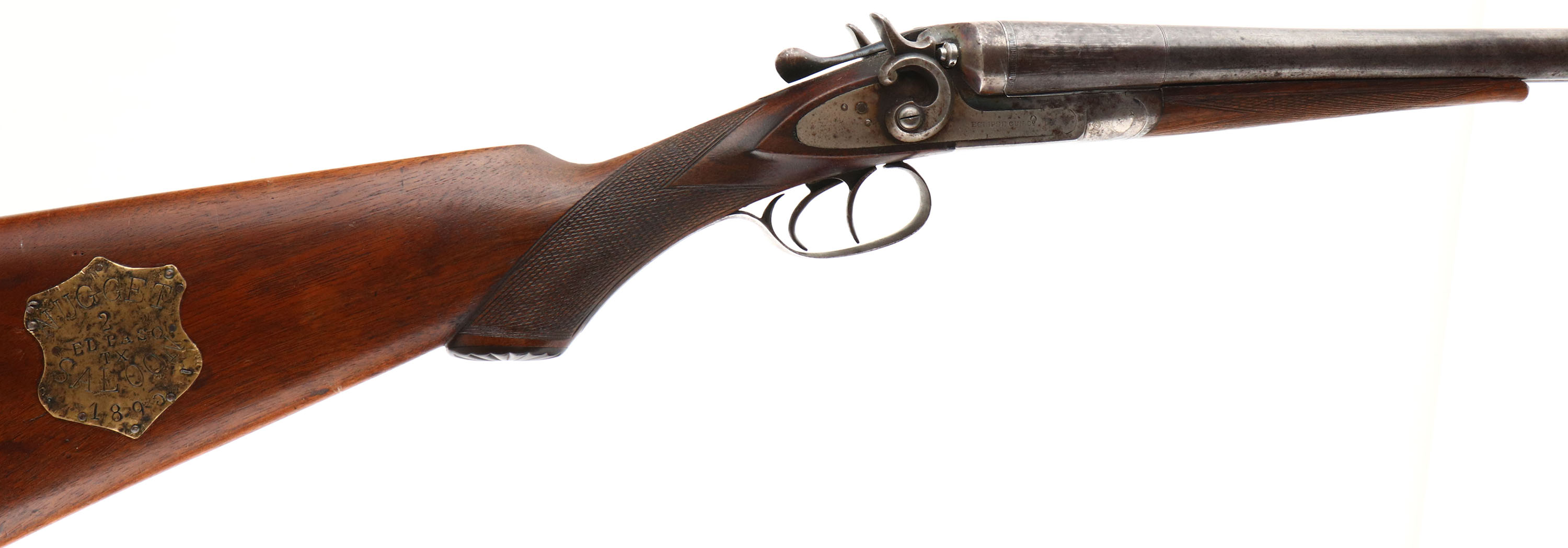 Eclipse Gun Co. SxS Shotgun, CAL: 12GA, MFG: 1892-95, Sn: 190303, Break Action SxS Shotgun, 20 5/8'' barrels. The checkered & capped pistol grip stocks are very good & solid, having been lightly sanded & refinished. There is a small edge chip on the forend, smoothed blemishes under the finish & light contusions & scrapes to the added finish. The right side of the stock has a badge that reads ''NUGGET SALOON EL PASO TX #2 1895''. The twisted steel barrel have worn to metal gray & toned to a brown patina, with intermittent spotting throughout. The twisted steel pattern can be seen in protected areas. The case-hardened receiver has remnants of case-colors in protected areas, but mostly worn to metal gray, with spotting toned to a brown patina. Bores are very good, with consistent roughness in the right barrel. The solid rib holds a single front bead. Stock carries a checkered plastic buttplate. Double triggers. Antique, No FFL Req. - Value: 500 to 800