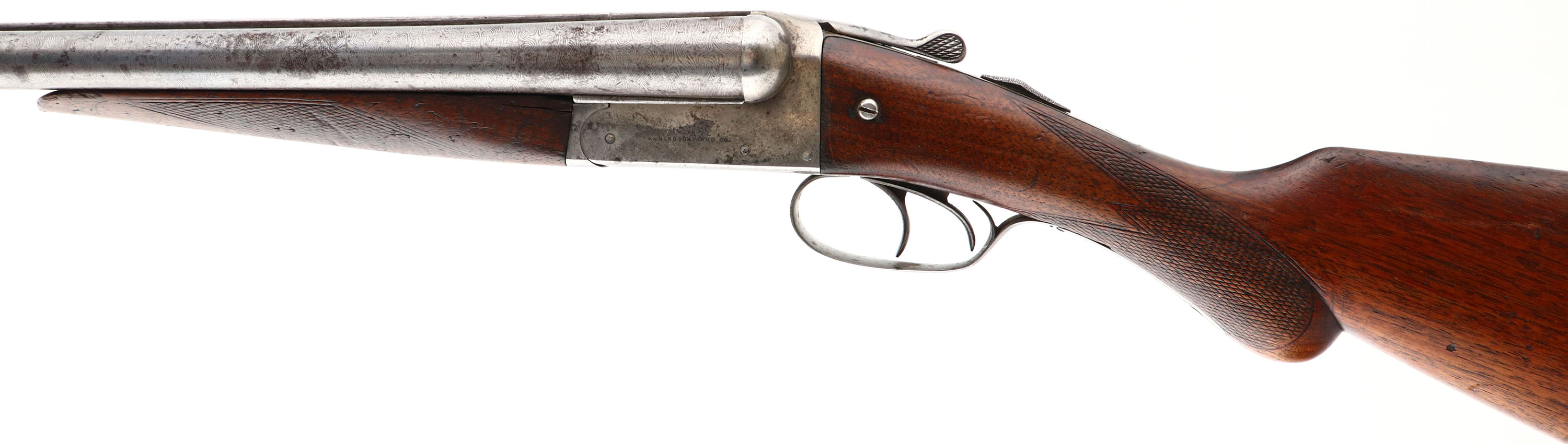 Remington, Model 1900, CAL: 12GA, MFG: 1900-1910, SN: 336394, Break Action SxS Shotgun. Choke: IM/IM, 30'' Damascus barrels. The checkered round knob wood stocks are good. There are multiple cracks in the forend, a large edge chip at the toe, one next to the receiver & multiple contusions, dings, & scrapes. The Damascus finish on the barrels is still prominent, worn to metal gray, with a thin brown patina & spotting toned to a brown patina. The case-hardened receiver has remnants of case-coloring in heavily protected areas, but mostly worn to metal gray, with spotting toned to a brown patina. Bores are good, with roughness & striations. The solid matted rib holds a single front bead. Stock has a RA checkered buttplate, with a toe chip. FFL or C&R Req. - Value: 200 to 400
