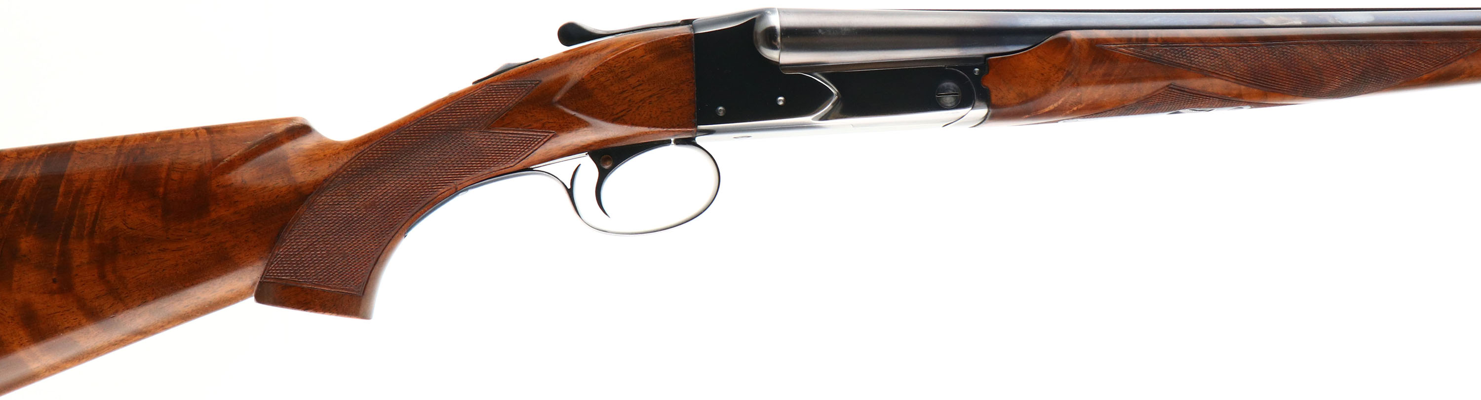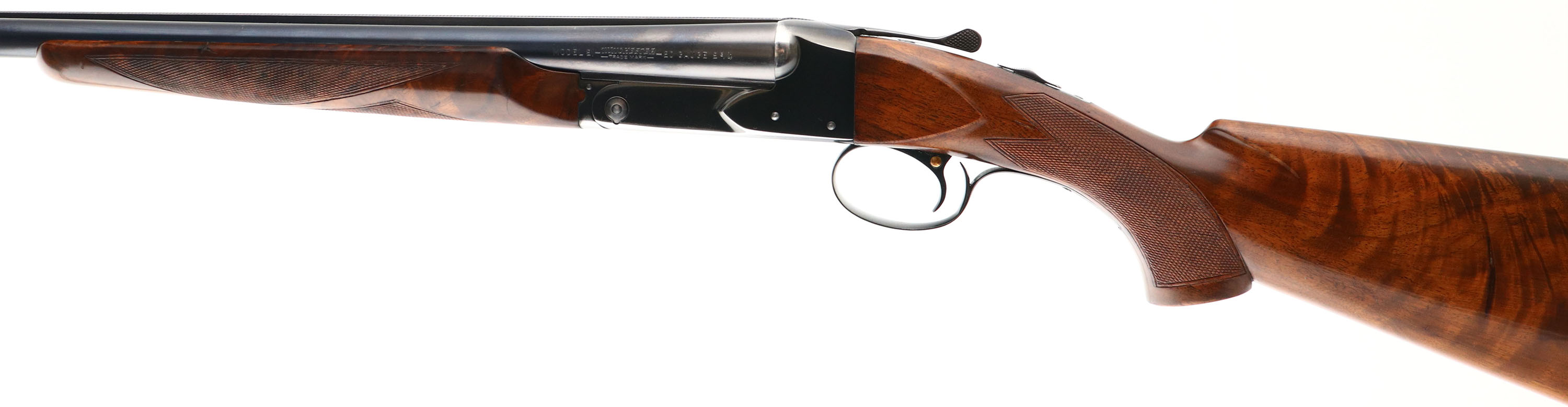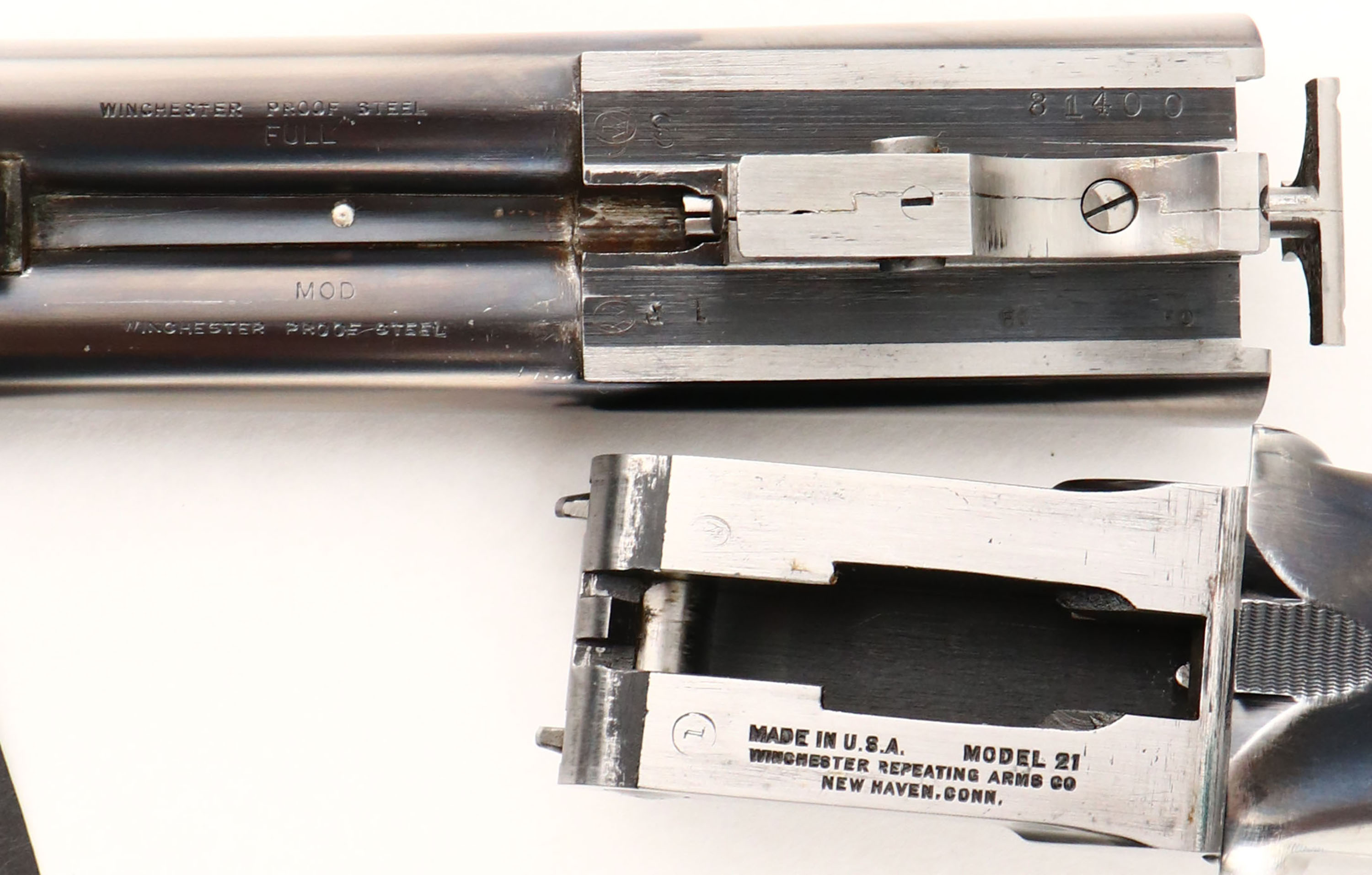 Winchester, Model 21, CAL: 20GA, MFG: 1954, SN: 31400, Break Action SxS Shotgun, Choke: F/MOD, 2 3/4'' chamber, 28'' barrels. The original checkered flat pistol grips tock & forend are excellent. The stocks have beautiful wood figure & feathering patterns. There are handling marks throughout & flaking finish around the buttplate & other sharp edges. The original metal blue finish rates appx 95% on the barrel, with the handling points thinning, beginning to wear to metal gray & the receiver rates 85%, with handling points & edges worn to metal gray. Bores are excellent, with visible striations. The solid, matted rib holds a red front bead. Stock carries a Winchester checkered plastic buttplate. Single selective trigger. FFL or C&R Req. - Value: 6000 to 9000