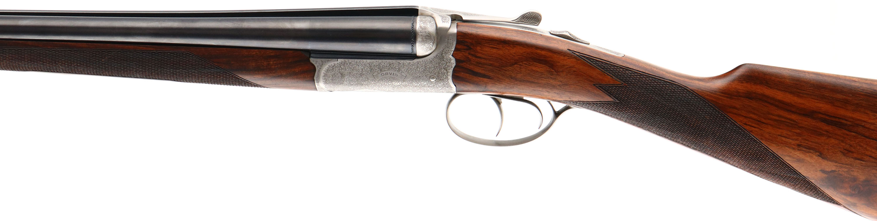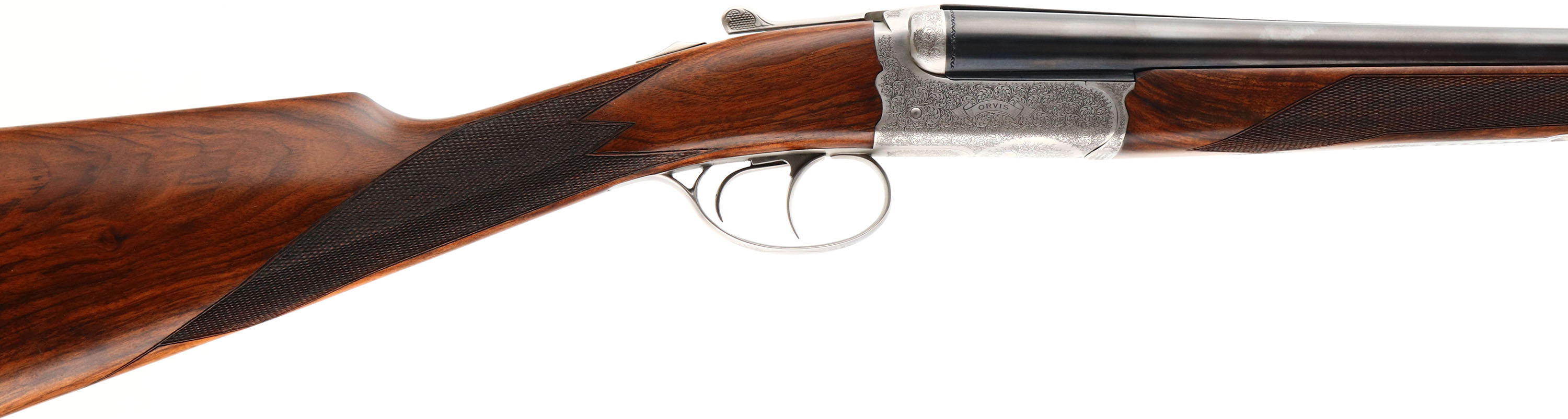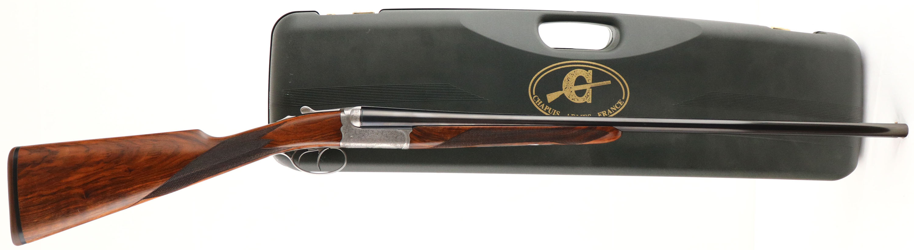CASED, Chapuis Armes (France), Orvis Classic, CAL: 20GA, MFG: Modern, SN: 60906, Break Action SxS Shotgun, Choke: CYL/CYL+, 27 1/2'' barrels. The solid rib is marked ''ORVIS CLASSIC BY CHAPUIS ARMES''. Both sides of the receiver are marked ''ORVIS'' in a banner & the bottom of the receiver has a gold tone ''1856'' (the date Orvis was founded). The gold tone is a little worn, with the edges of the numbers being more pronounced. The bottom of the forend is marked ''CHAPUIS-ARMES JUXTAPOSE PROGRESS''. The AAA Grade Walnut checkered straight grip stocks are excellent. There are minor handling marks to the hand applied oil finish. The metal blue finish on the barrels rates 98%+, with areas beginning to tone to a dark chocolate patina & the Old English coin silver finish on the receiver is excellent. The receiver, trigger guard, break lever, barrel end & forend release lever all display intricate laser engraved floral scroll. Bores are excellent. The solid rib holds a single front bead. Stock carries a Decelerator solid brown rubber recoil pad. Double trigger. LOP: 14 3/4'' overpad (to front trigger), DAH: 2 3/4'', DAC: 1 1/2''. Comes with factory CA hard case, with owners manual & purchase certificate. Orvis Company began importing two versions of Chapuis shotguns for sale under the Orvis brand. This Classic model retails for $4,595. A beautiful example of a French made shotgun. FFL Req. - Value: 2500 to 4000
