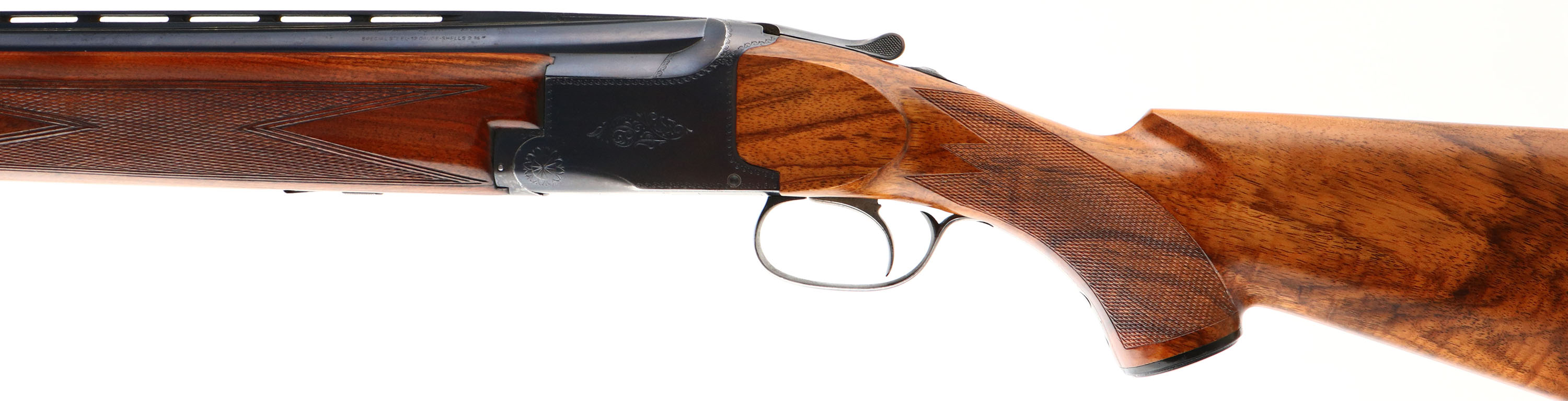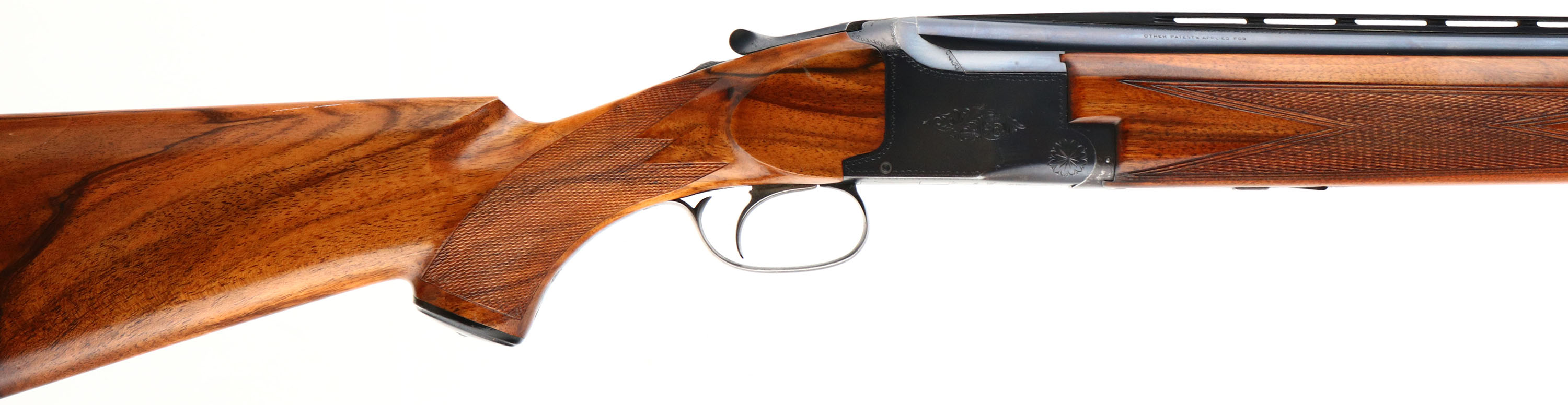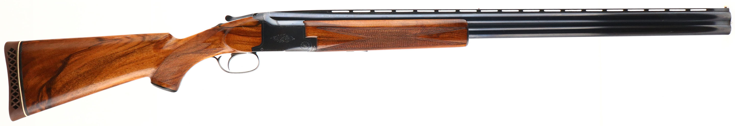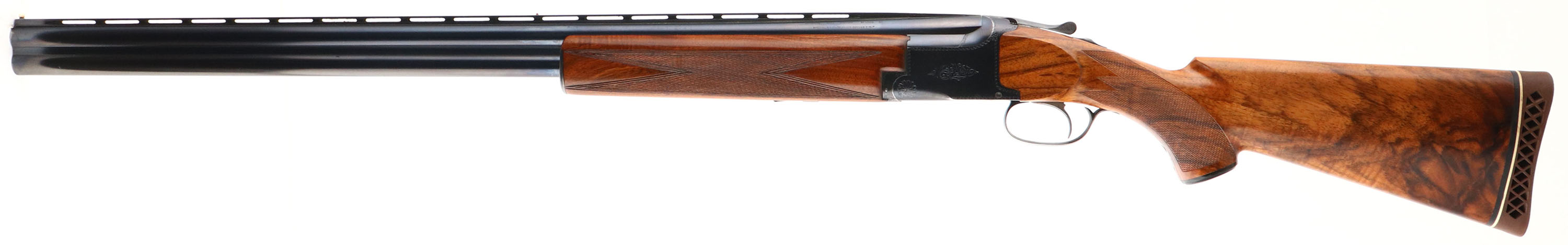 Browning (Belgium), Superposed, CAL: 12GA, MFG: 1391-39, SN: 16111, Break Action O/U, Choke: F/F+, 30'' barrels. The high grade, nicely figured, checkered & capped pistol grip stocks are excellent, having been professionally restored. There are handling marks & a small chip repair on the top front edge of the forend. The original metal blue finish rates 90% on the barrel & 85% on the frame, with concentrated loss around the carry points. There is simple scroll & border engravings on the receiver, trigger guard & break lever. The trigger guard has worn to a mix of remaining blue, brown patina & metal gray. Bores are excellent, with visible striations. The ventilated rib holds an ivory front bead. Stock carries a Pachmayr ventilated brown rubber recoil pad. LOP: 14''. FFL or C&R Req. - Value: 900 to 1600