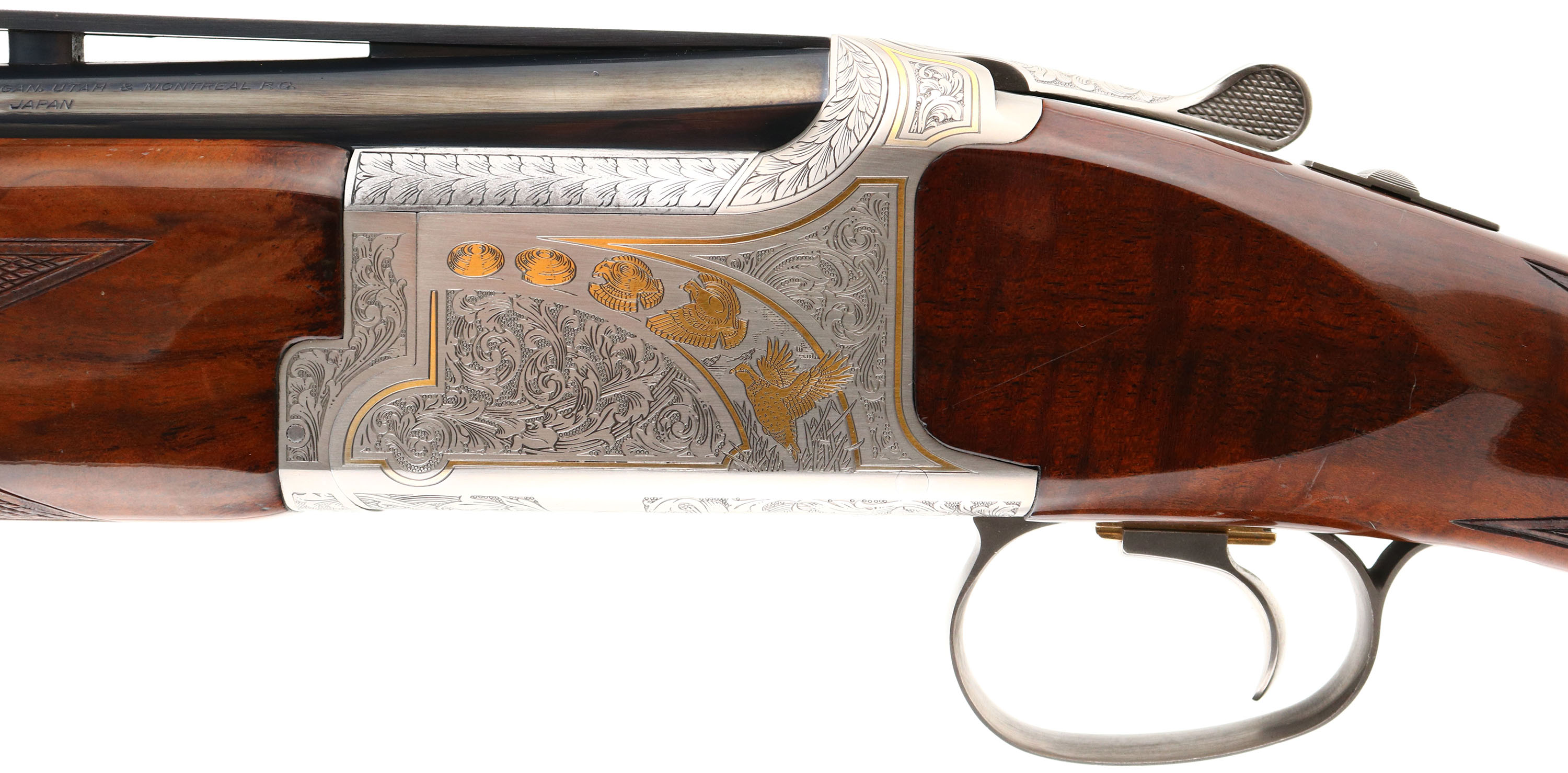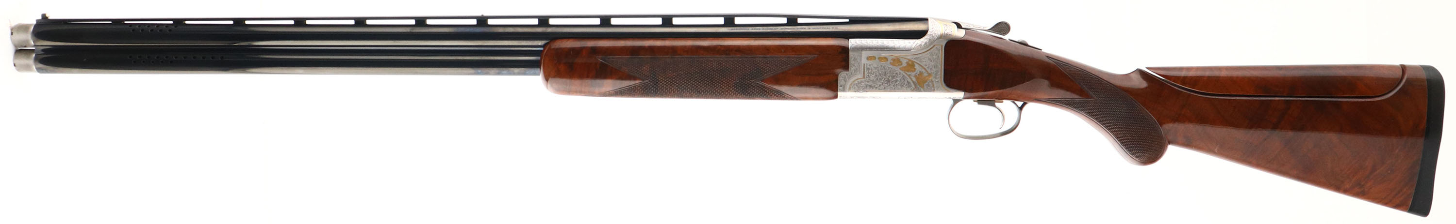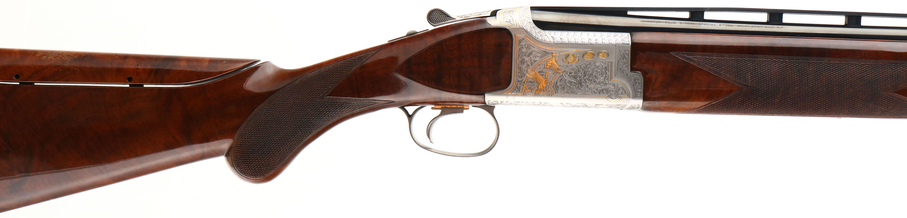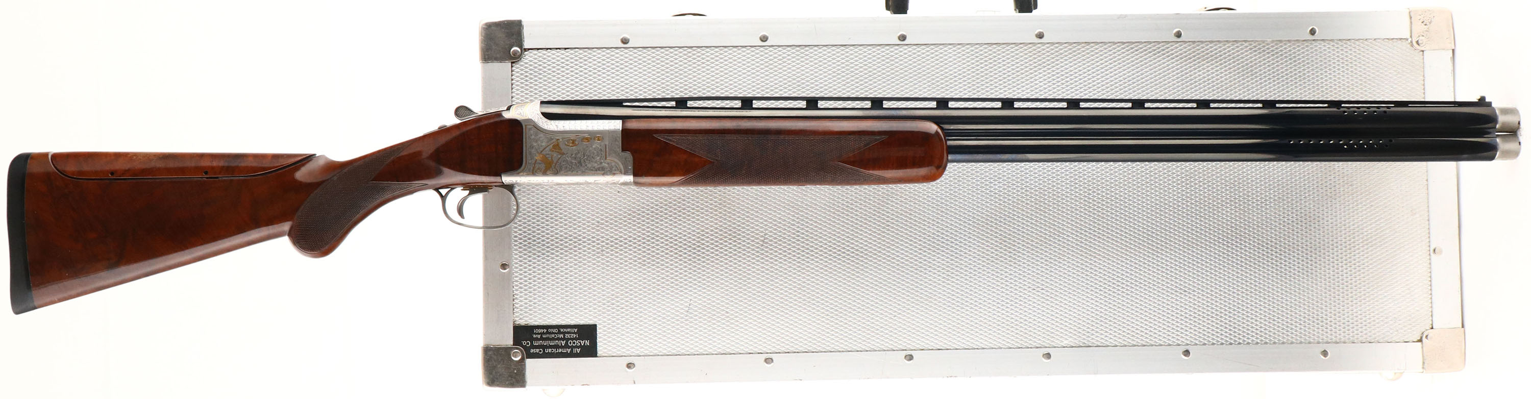 CASED, Browning Citori 625 Sporting Clays Edition Invector-Plus, CAL: 12GA, MFG: 1998, SN: 37613NWW53, Break Action O/U Shotgun, Choke: Briley Choke System, 2 3/4'', 30'' ported barrels with tapered floating top rib. The receiver & surrounding metal areas display an intricate floral pattern engraving. The receiver has a gold accented Pigeon transforming into a clay on the left, a gold accented Duck transforming into a clay on the right & two gold inlayed clays on the bottom. Additionally, it has gold border & a gold toned Browning logo on the bottom of the trigger guard. The deluxe Black Walnut, checkered round pistol grip wood stocks are excellent. The stocks have very attractive grain & an excellent gloss oil finish, exhibiting minor handling marks. Adjustable comb. The metal blue finish on the barrel rates 90%, with concentrated wear, where the forend rubs. The silver nitride finish on the receiver is excellent. Bores are excellent. The ventilated rib holds a mid-rib & front ivory bead. Buttstock carries a solid black rubber recoil pad. Comes in a custom metal ''All American Case'' with extra storage compartment. Inside the case is a set of Drop-In Briley choke tubes. The set includes .410 & 20 GA tubes, which retails at $1700. It also holds (10) screw-in Briley choke attachments, combo wrench, spacers, lubricant & tube set hammer & knock out tool. This all inclusive setup would be a great addition to a competition shooters collection. DAC: 1 3/4'', DAH: 2 1/2'', LOP: 14 3/4'' overpad.* FFL Req - Value: 3500 to 5500