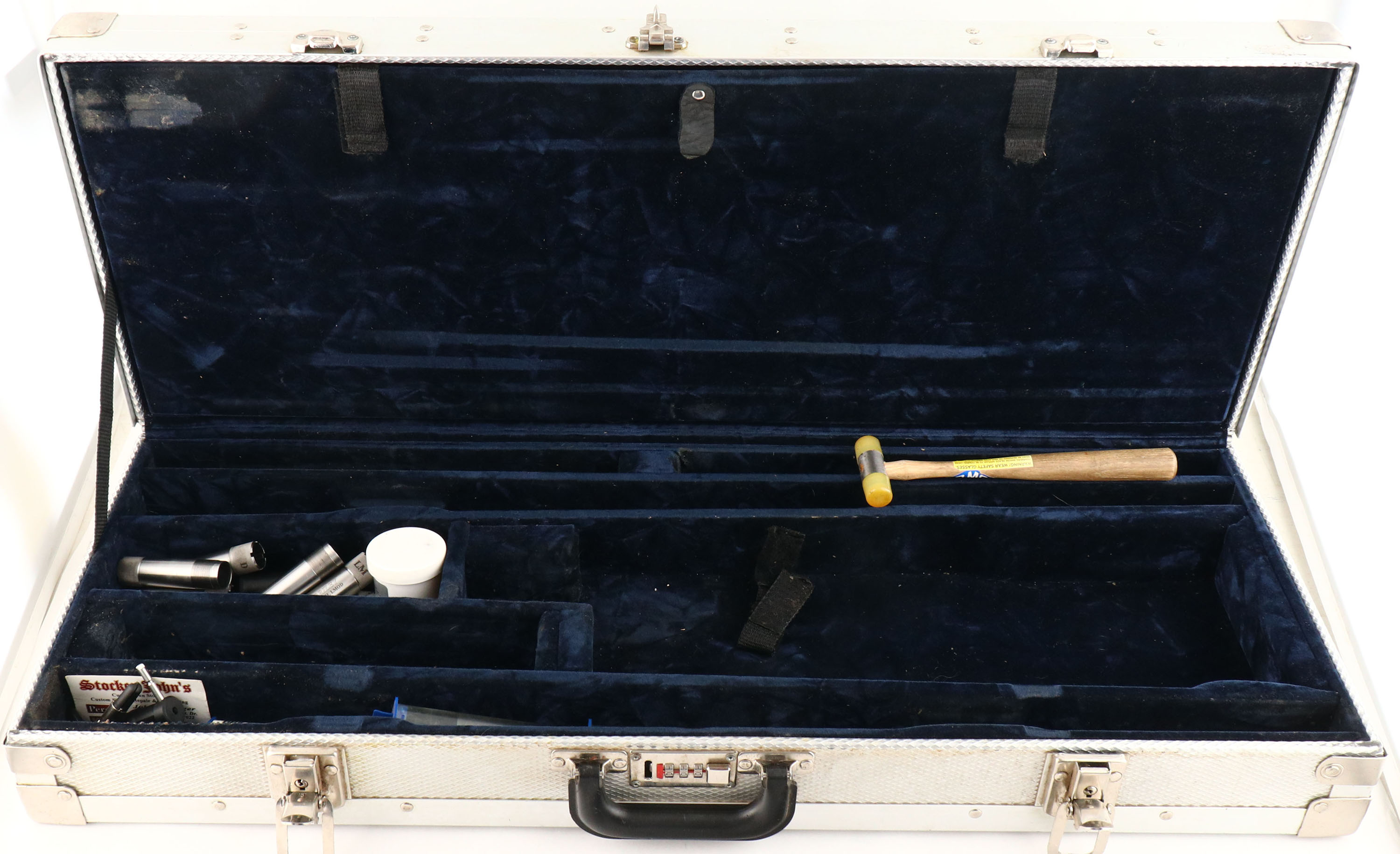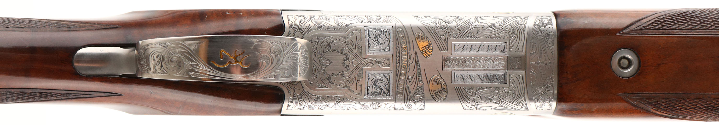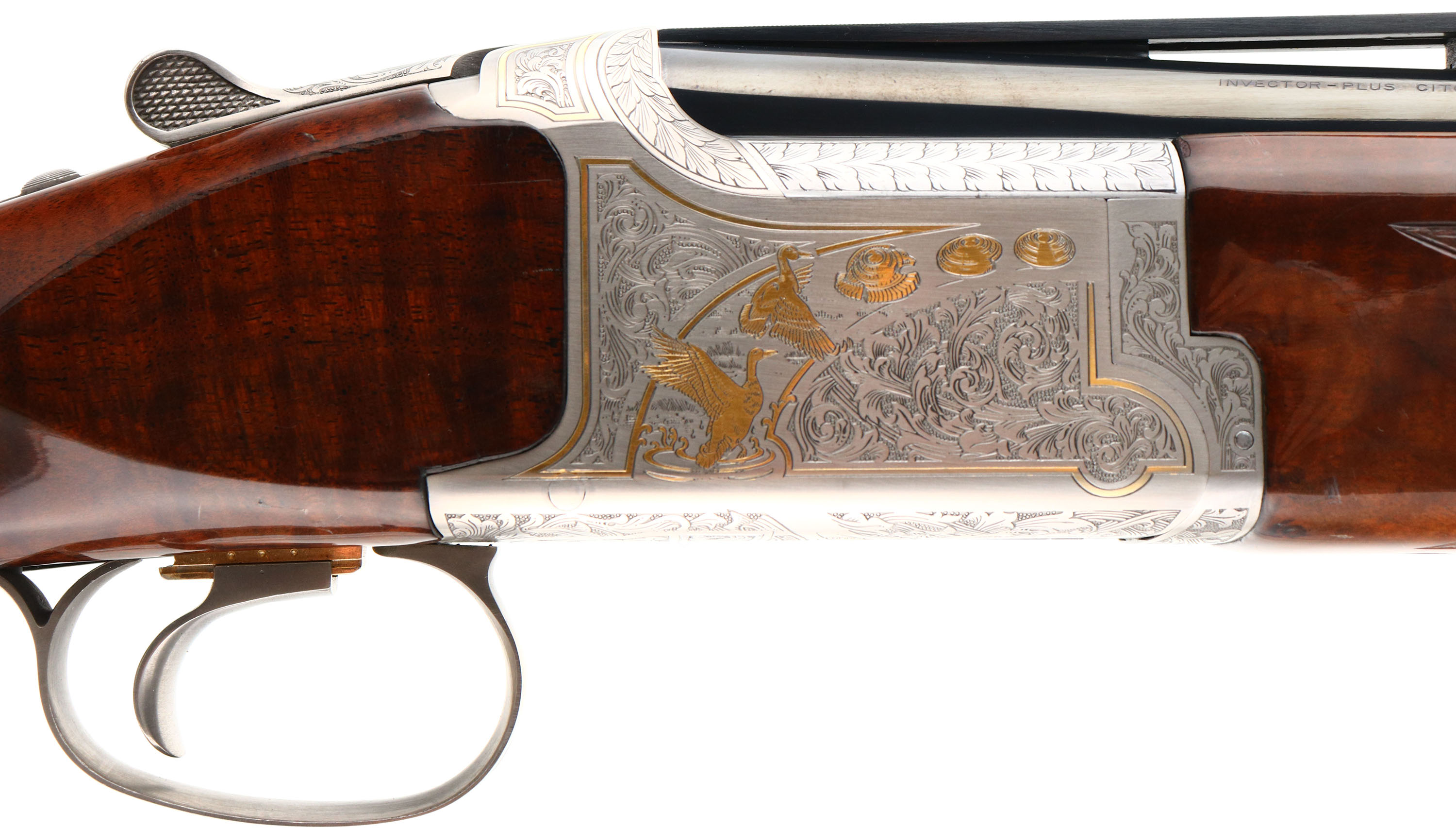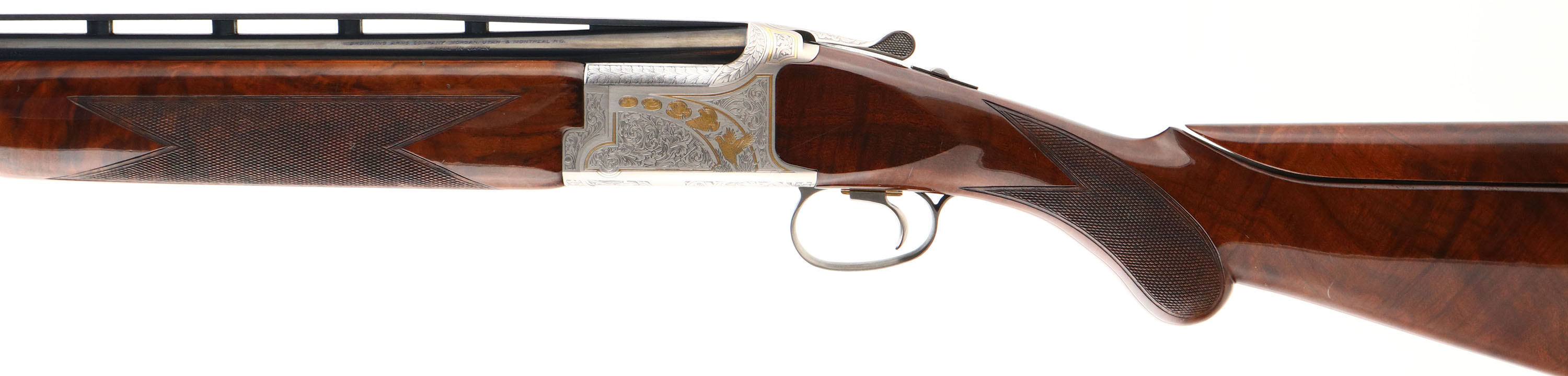 CASED, Browning Citori 625 Sporting Clays Edition Invector-Plus, CAL: 12GA, MFG: 1998, SN: 37613NWW53, Break Action O/U Shotgun, Choke: Briley Choke System, 2 3/4'', 30'' ported barrels with tapered floating top rib. The receiver & surrounding metal areas display an intricate floral pattern engraving. The receiver has a gold accented Pigeon transforming into a clay on the left, a gold accented Duck transforming into a clay on the right & two gold inlayed clays on the bottom. Additionally, it has gold border & a gold toned Browning logo on the bottom of the trigger guard. The deluxe Black Walnut, checkered round pistol grip wood stocks are excellent. The stocks have very attractive grain & an excellent gloss oil finish, exhibiting minor handling marks. Adjustable comb. The metal blue finish on the barrel rates 90%, with concentrated wear, where the forend rubs. The silver nitride finish on the receiver is excellent. Bores are excellent. The ventilated rib holds a mid-rib & front ivory bead. Buttstock carries a solid black rubber recoil pad. Comes in a custom metal ''All American Case'' with extra storage compartment. Inside the case is a set of Drop-In Briley choke tubes. The set includes .410 & 20 GA tubes, which retails at $1700. It also holds (10) screw-in Briley choke attachments, combo wrench, spacers, lubricant & tube set hammer & knock out tool. This all inclusive setup would be a great addition to a competition shooters collection. DAC: 1 3/4'', DAH: 2 1/2'', LOP: 14 3/4'' overpad.* FFL Req - Value: 3500 to 5500