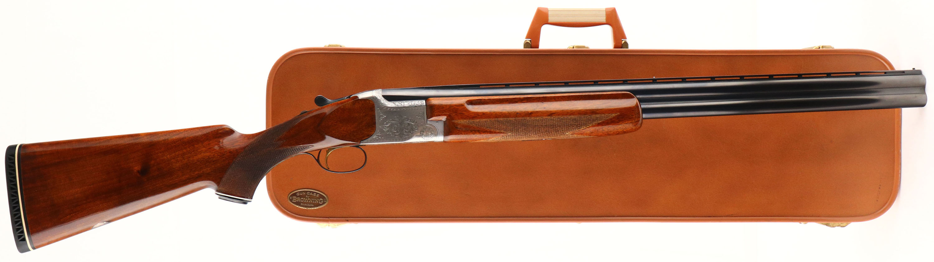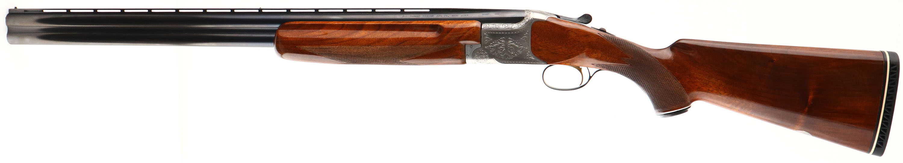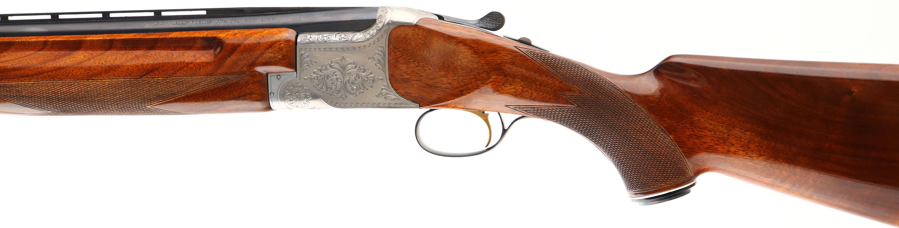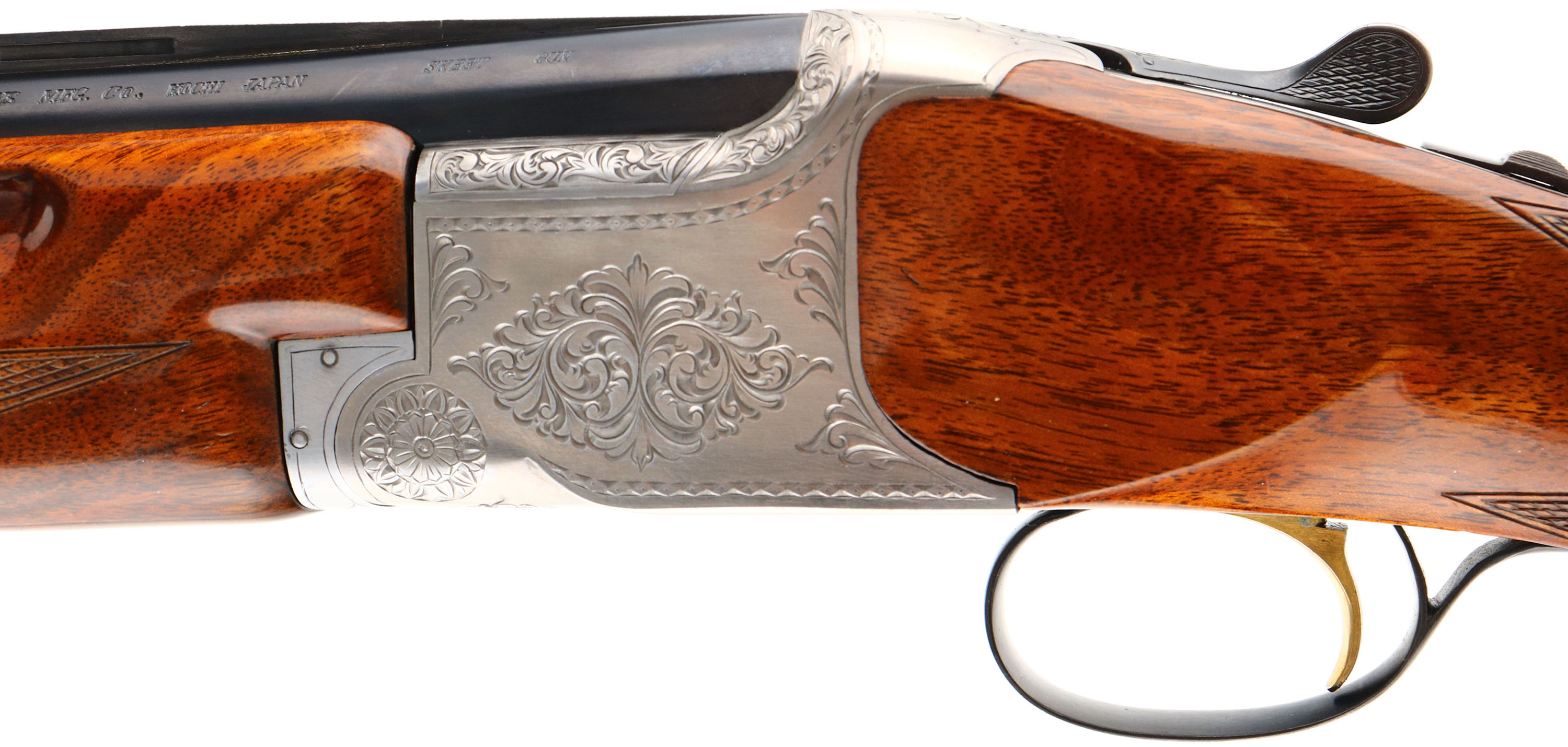 CASED, Miroku, Model 800- Skeet Gun, CAL: 12GA, MFG: Mid 1960's-74, SN: 112191, Break Action O/U, Choke: IC/IC, 26'' barrel with ventilated rib. The original checkered & capped pistol grip stocks are excellent. The high gloss finish is excellent. There is an engraved initial plate in the belly of the stock, marked ''B''. The metal blue finish on the barrels rates 97% & the engraved coin silver receiver is excellent. The hand engraved receiver displays decorative floral scroll work & accent engravings on the break lever, trigger guard & forend release lever. Bores are excellent, with visible striations. The ventilated rib holds a small mid-rib bead & front bead. Stock carries a Pachmayr ventilated black rubber recoil pad. Comes with a Browning Hartmann case. Case condition is very good, with light age soiling both inside & out. LOP: 14 1/2''.* FFL or C&R Req. - Value: 800 to 1200