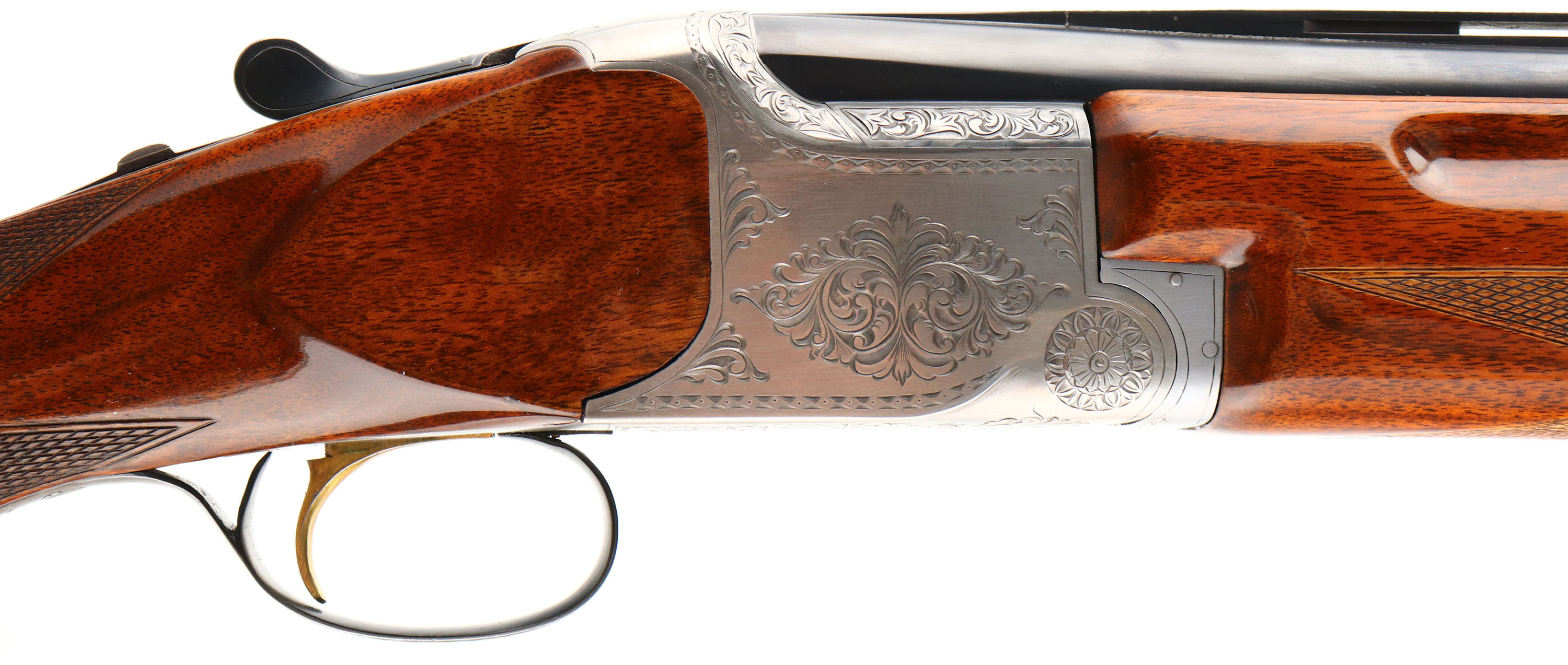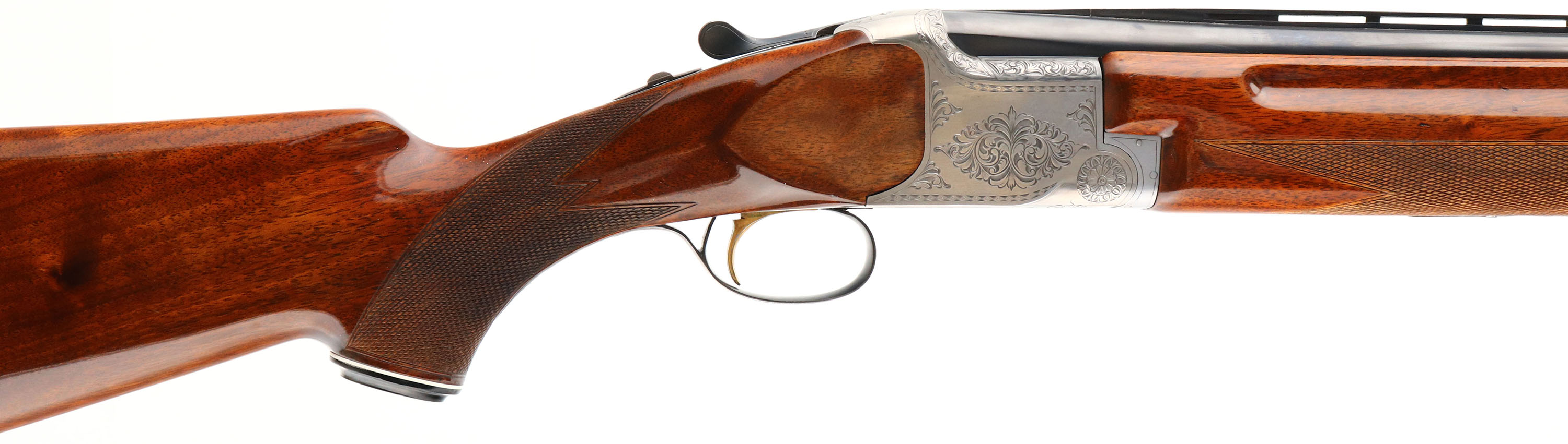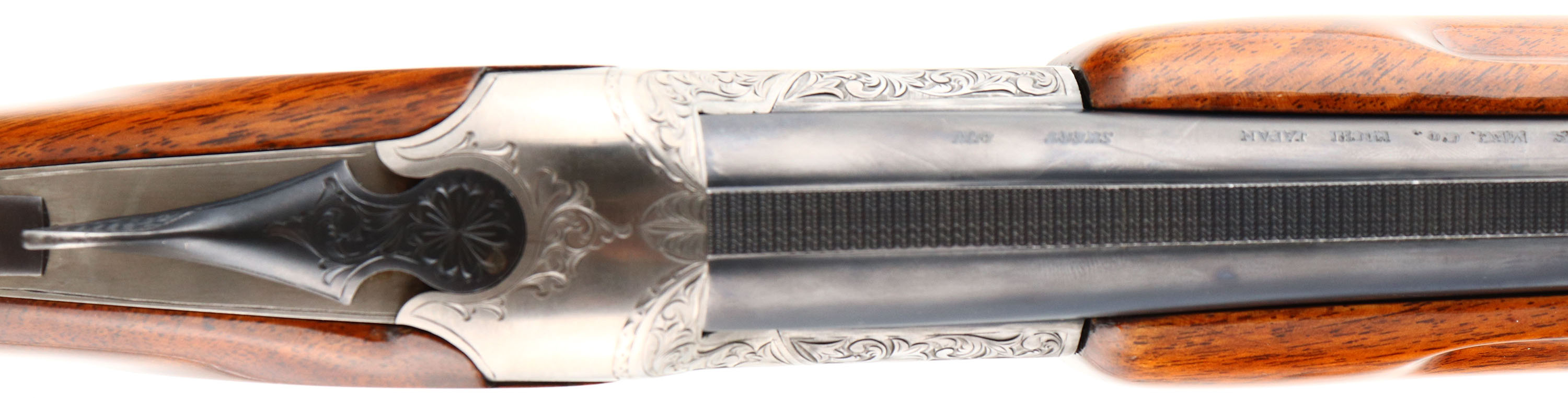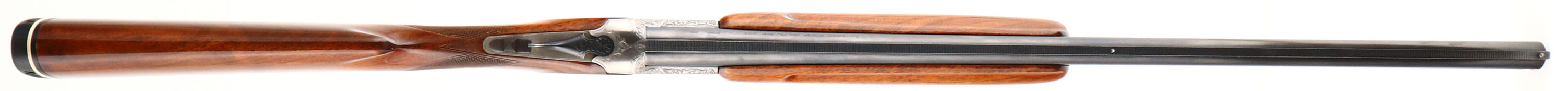 CASED, Miroku, Model 800- Skeet Gun, CAL: 12GA, MFG: Mid 1960's-74, SN: 112191, Break Action O/U, Choke: IC/IC, 26'' barrel with ventilated rib. The original checkered & capped pistol grip stocks are excellent. The high gloss finish is excellent. There is an engraved initial plate in the belly of the stock, marked ''B''. The metal blue finish on the barrels rates 97% & the engraved coin silver receiver is excellent. The hand engraved receiver displays decorative floral scroll work & accent engravings on the break lever, trigger guard & forend release lever. Bores are excellent, with visible striations. The ventilated rib holds a small mid-rib bead & front bead. Stock carries a Pachmayr ventilated black rubber recoil pad. Comes with a Browning Hartmann case. Case condition is very good, with light age soiling both inside & out. LOP: 14 1/2''.* FFL or C&R Req. - Value: 800 to 1200
