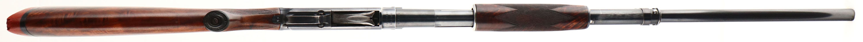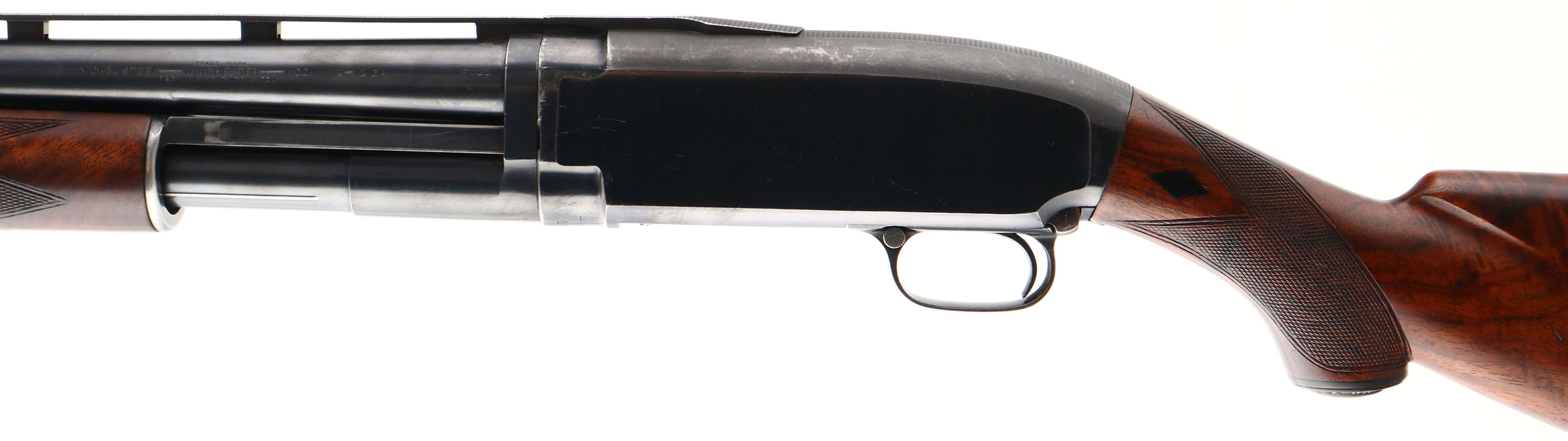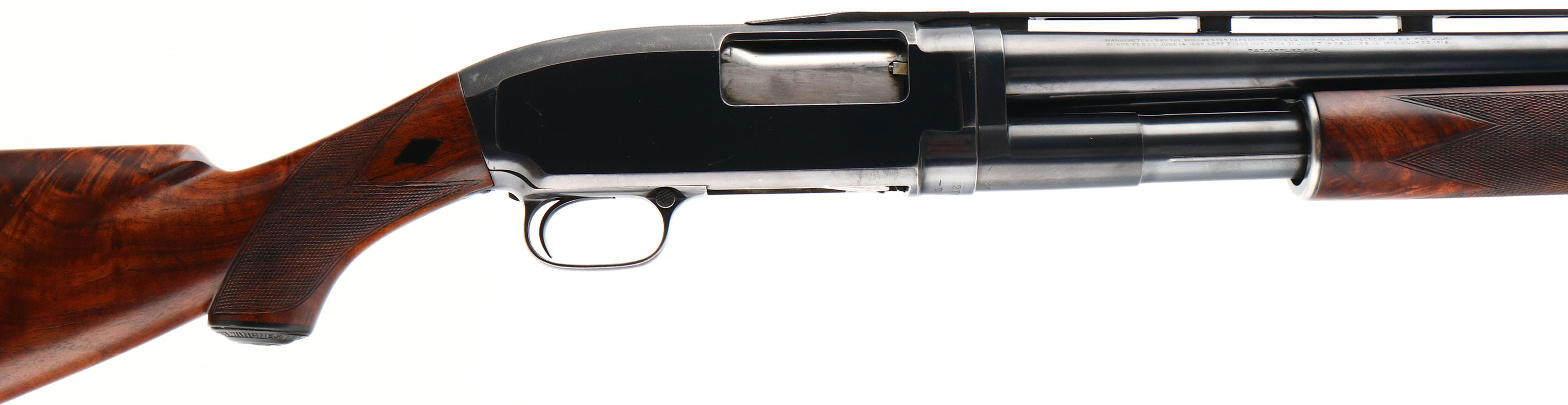 RARE Winchester Model 12 BLACK DIAMOND -DELUXE TRAP, CAL: 12 GA, MFG: 1920, SN: 278715, Pump Action Shotgun, 2 3/4'', Choke: Full, 30'' Ventilated rib barrel. The factory deluxe checkered & capped pistol grip wood stocks are excellent, with fabulous feathered grain. The finish has been professionally restored, with only a few finish level blemishes or light contusions. The wrist of the stock carries the two inlaid ebony diamonds. The original metal blue finish rates 90% on receiver, 95% on barrel & 80% on the mag tube, with loss caused by pump action & light carry wear. Top of receiver is matted, with matte finish & with proof stampings correctly placed to the side of the ventilated rib. Bore is very good. The ventilated rib carries a mid & front beads. Buttstock carries a ''Winchester'' marked solid red recoil pad, with some chipping loss at the toe. LOP: 14 1/4'' over pad. A rare & beautiful example of a Black Diamond Deluxe Trap. FFL or C&R Req. - Value: 2500 to 5000