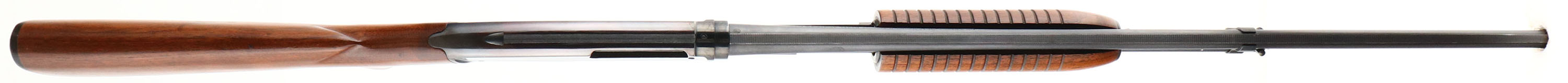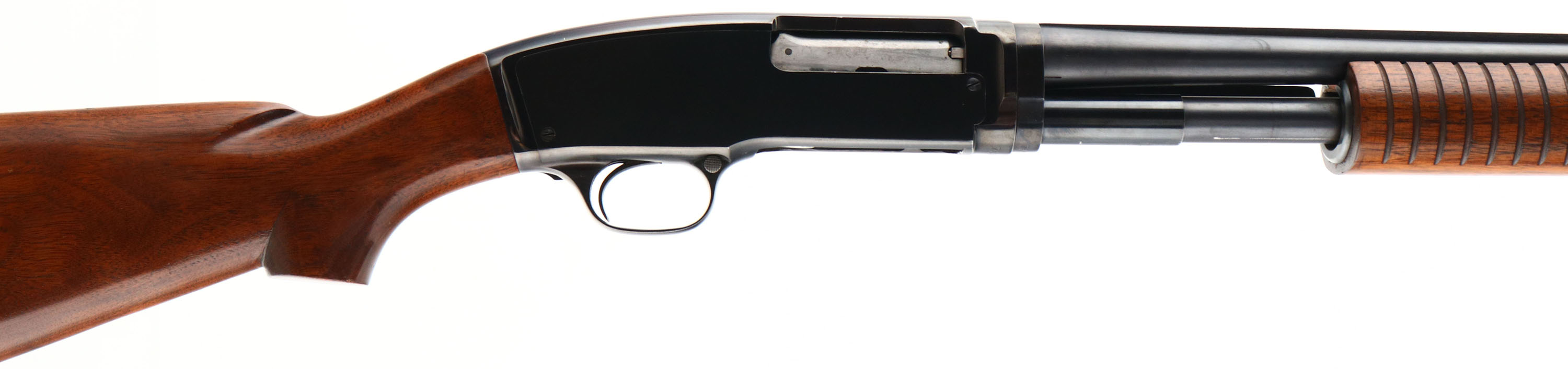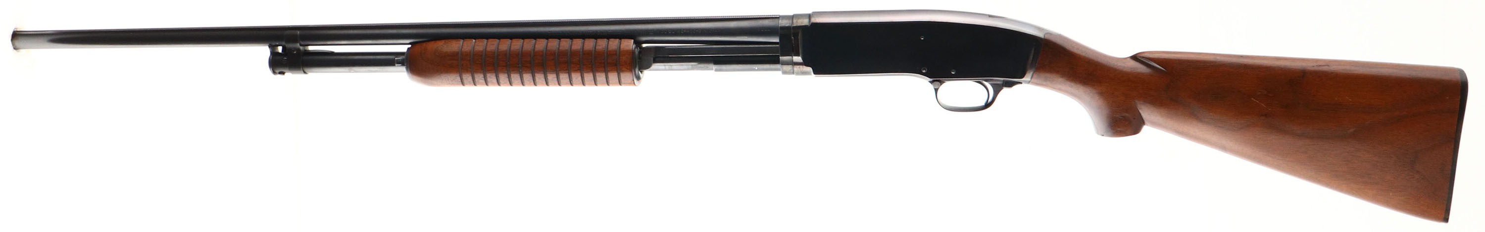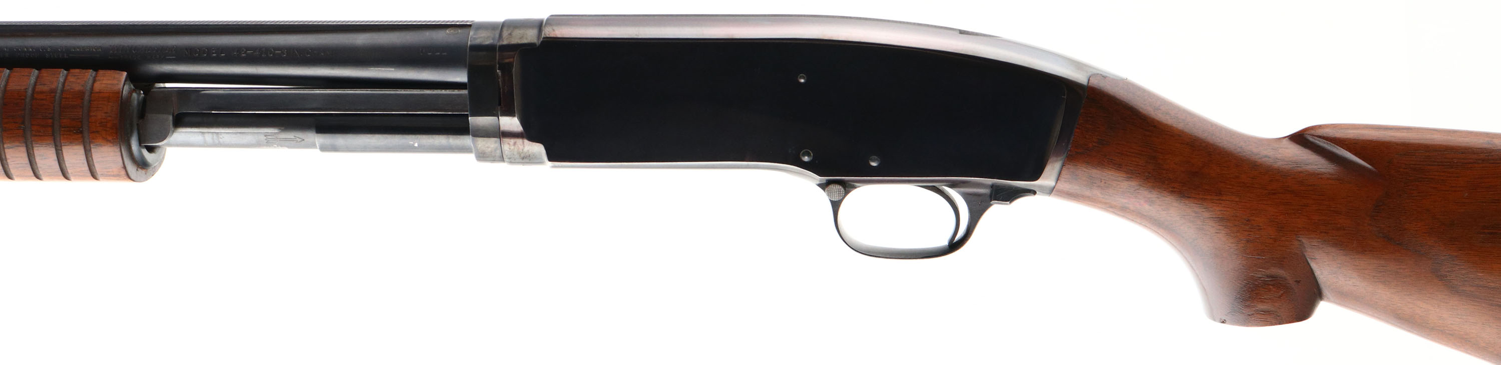 Winchester, Model 42, 410 GA., MFG. 1948, SN: 76757, Pump action, 3'', Full Choke, 26'' Matted solid rib barrel. The original flat pistol grip stocks & factory finish are excellent. They carry very few minor finish level blemishes or contusions. The metal blue finish appears to have been professionally restored & rates 98% overall, with the receiver starting to tone a bit plum. Bore is excellent. The barrel rib carries a single front bead. Buttstock carries the original Winchester buttplate. An overall excellent, original, & collector's condition example. FFL or C&R Req. - Value: 1500 to 3000