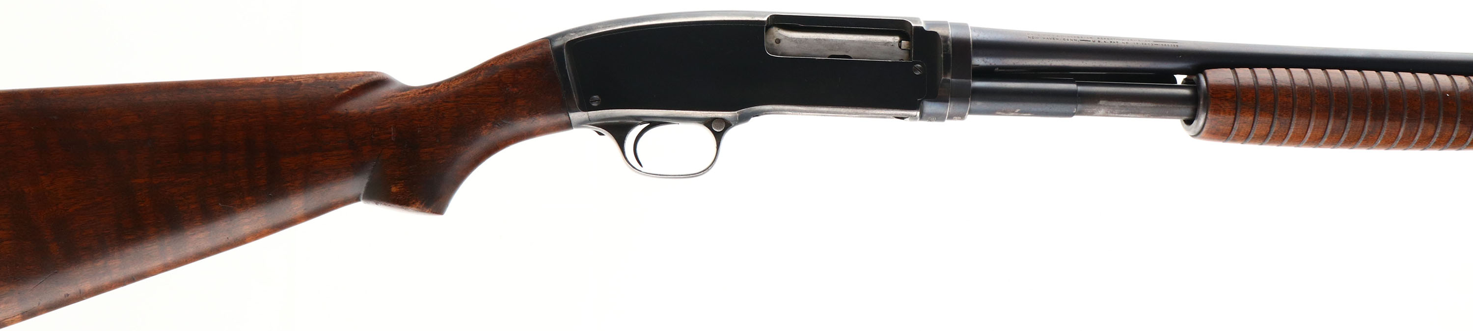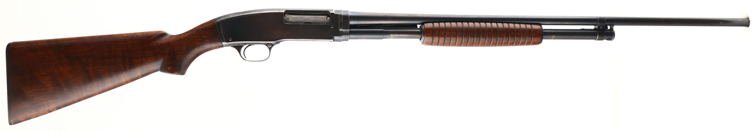 Winchester, Model 42, 410 GA., MFG. 1946, SN: 52832, Pump action, 2 1/2'' Chamber, Choke: Rare ''SKEET'' marking, 26'' no rib barrel. The original flat pistol grip stocks are excellent, with the stock appearing to have been cleaned, possibly very lightly sanded, & reoiled, & forearm carrying the factory finish. They carry very few minor finish level blemishes, scratches or contusions. The original metal blue finish rates 85% overall. Bore is excellent. The barrel carries a single front bead. Buttstock carries the original Winchester buttplate. An overall very nice condition & collector's example. FFL or C&R Req. - Value: 1200 to 2500
