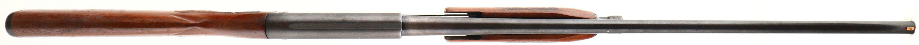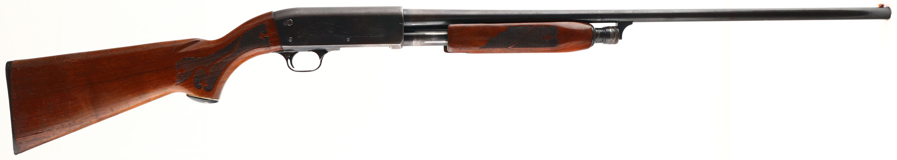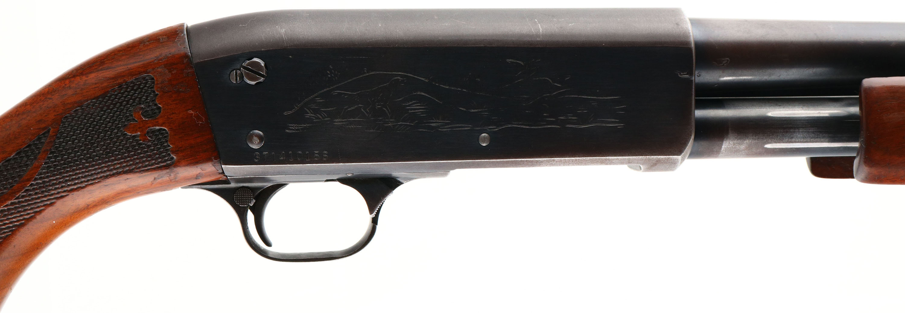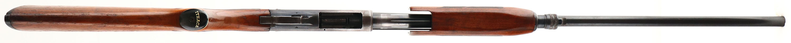 Ithaca, Model 37 Featherlight, CAL: 20 GA, MFG: 1974, SN: 371410156, Pump Action Shotgun, Choke: MOD, 2 3/4'' chamber, 28'' barrel. The original checkered & capped pistol grip wood stocks are very good & solid, however there is a 1'' x 5'' glue repaired toe break to the stock. The wood displays several scrapes, scratches & contusions to the original flaking & thinning finish. The metal blue finish rates 70% overall. All stampings, markings & engravings are clear. Bore is excellent. The barrel holds a single orange fiber optic bead sight. Buttstock carries the original plastic buttplate. 13 7/8'' LOP. FFL or C&R Req. - Value: 300 to 600