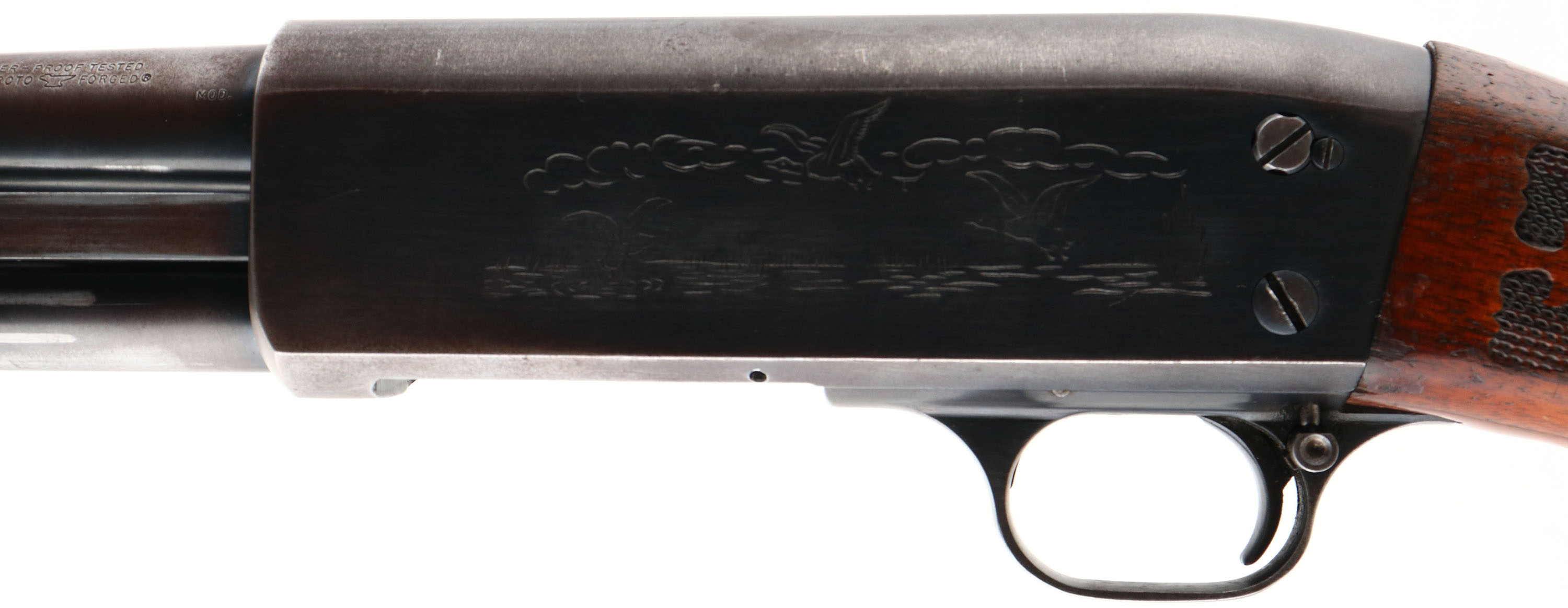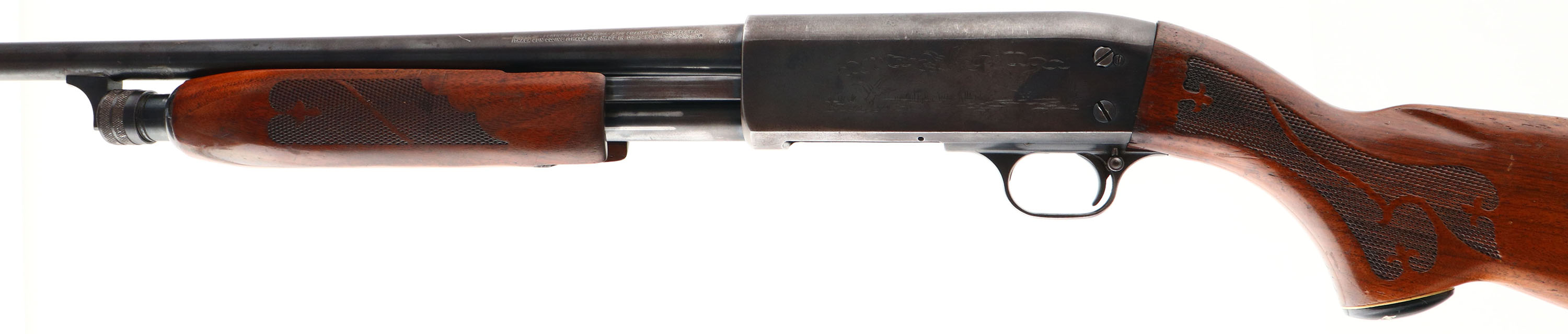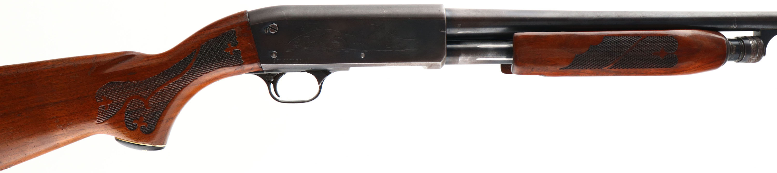 Ithaca, Model 37 Featherlight, CAL: 20 GA, MFG: 1974, SN: 371410156, Pump Action Shotgun, Choke: MOD, 2 3/4'' chamber, 28'' barrel. The original checkered & capped pistol grip wood stocks are very good & solid, however there is a 1'' x 5'' glue repaired toe break to the stock. The wood displays several scrapes, scratches & contusions to the original flaking & thinning finish. The metal blue finish rates 70% overall. All stampings, markings & engravings are clear. Bore is excellent. The barrel holds a single orange fiber optic bead sight. Buttstock carries the original plastic buttplate. 13 7/8'' LOP. FFL or C&R Req. - Value: 300 to 600
