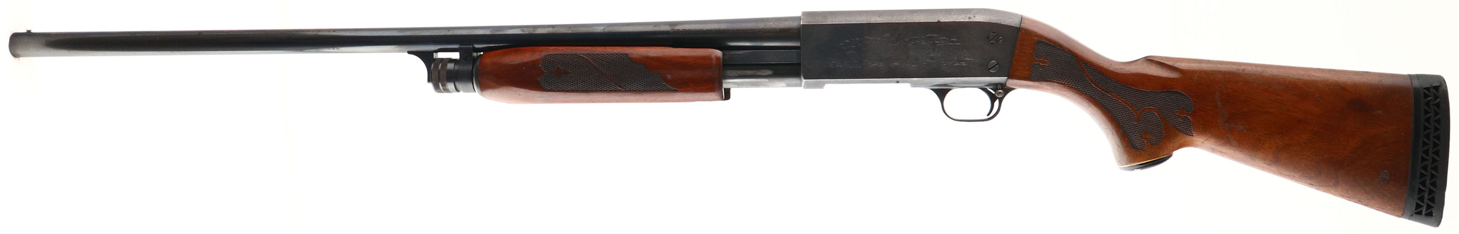 Ithaca, Model 37 Featherlight, CAL: 12 GA, MFG: 1973, SN: 371307547, Pump Action Shotgun, Choke: CYL, 2 3/4'' chamber, 26'' barrel. The original checkered & capped pistol grip wood stocks are very good, displaying several small scuffs, scrapes & contusions to the original thinning finish. The metal blue finish rates 85% overall. All stampings, markings & engravings are crisp & clear. Bore is excellent. The barrel holds a single white front sight. Buttstock carries a ventilated recoil pad. 13 5/16'' LOP over pad. FFL or C&R Req. - Value: 300 to 600