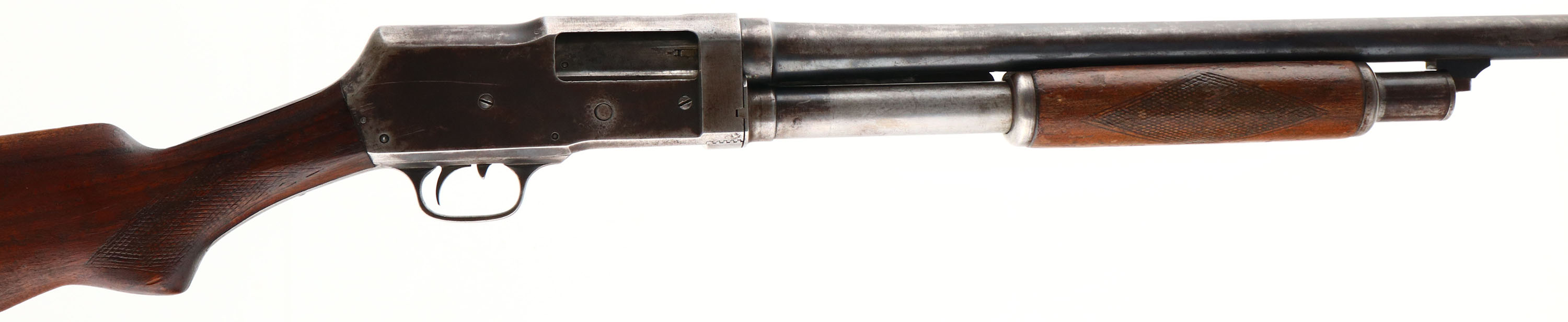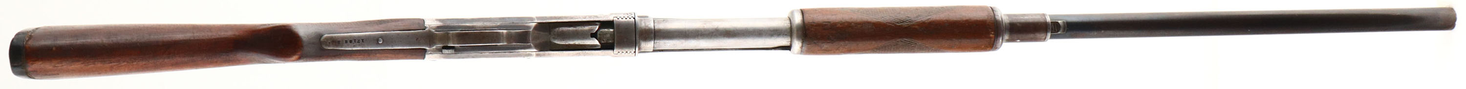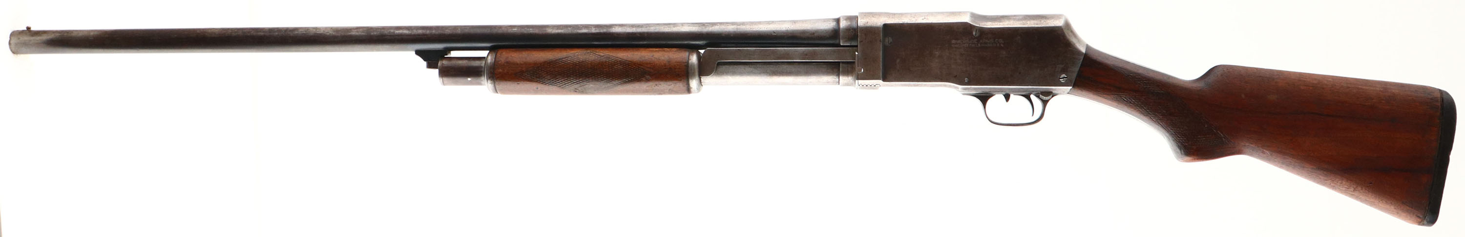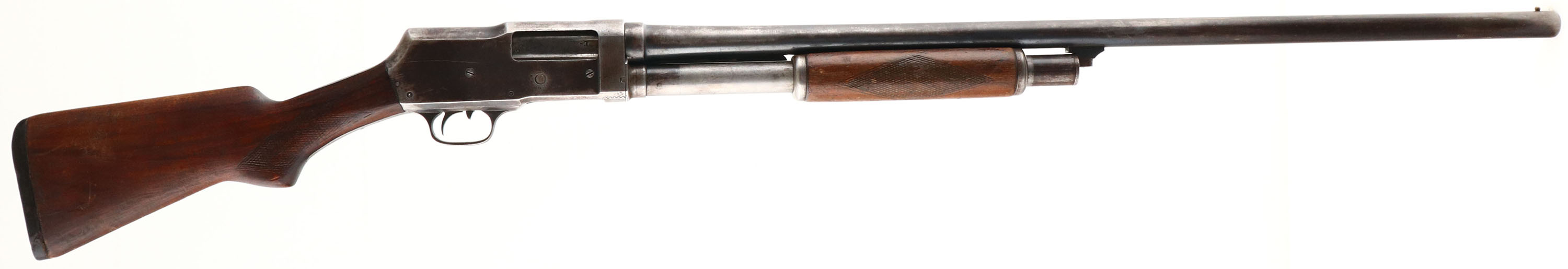 Riverside Arms (J. Steven), Model 520 (Martially Stamped), CAL: 12 GA, MFG: 1938-39, SN:12108B, Pump Action Shotgun, Full, 30'' barrel. The checkered & pistol grip stocks are good & solid. The stock has been cut to a length of pull of 12 5/8'' & was heavily sanded, refinished & the checkering was non-professionally re-cut. The forearm carries an added coat of finish over the original checkering & flaking finish. The stocks have numerous small scratches, scrapes & contusions. The metal has worn mostly gray, with some mix of remaining blue & areas toning brown. Left side of receiver has some small numbers & a date lightly scratched into it. Bore is very good. The stock carries an altered & poorly fit vintage buttplate, with a leather spacer. Barrel carries a single front bead. This gun has a problem with the mag plunger & spring wanting to push out of the mag tube into the receiver & causing the bolt not to slide or cock properly. We recommend this shotgun visit a gunsmith before attempting to use & is therefore being sold as a parts gun & ''AS IS'', with no returns. FFL or C&R Req - Value: 80 to 200