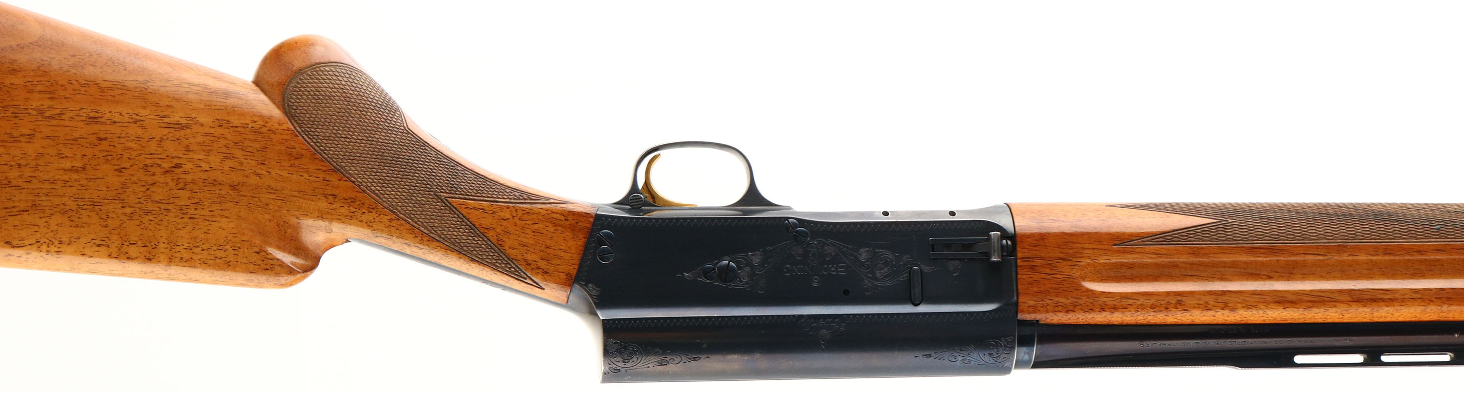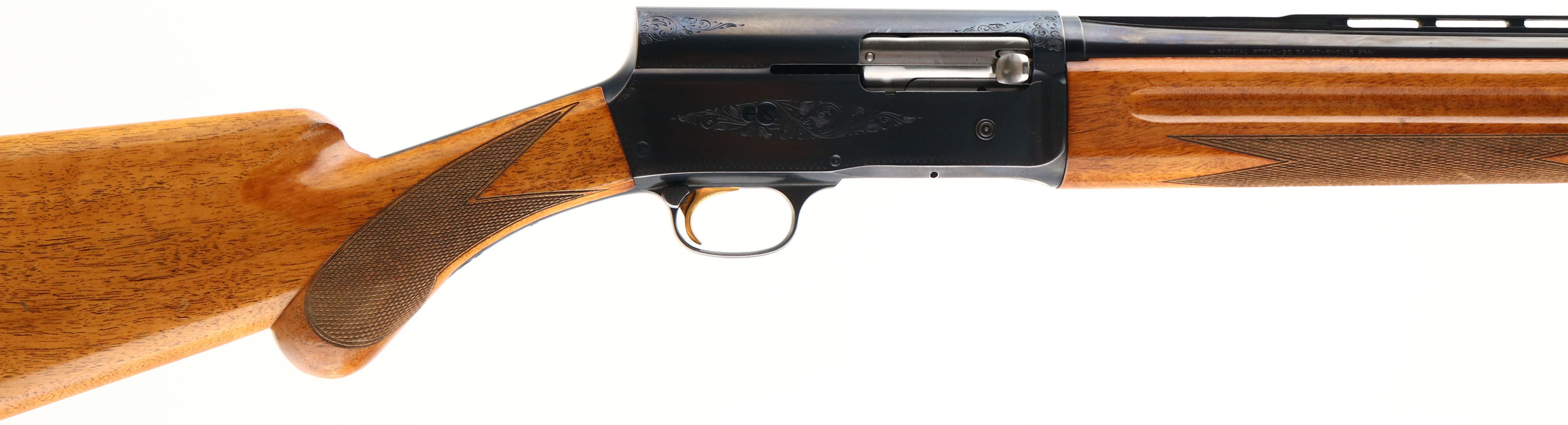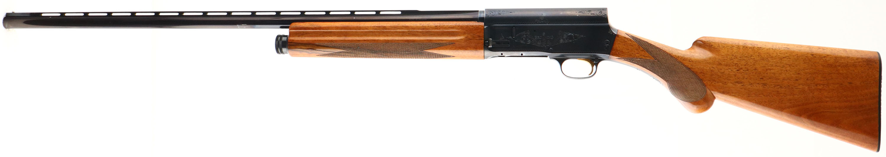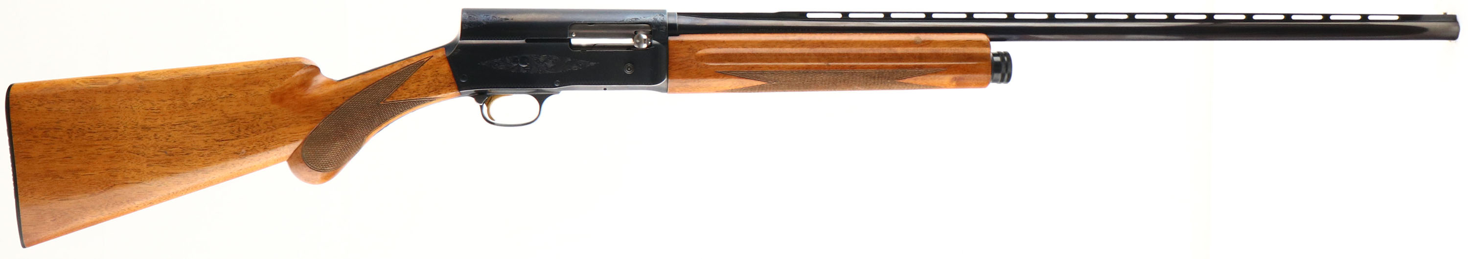 Browning, Model A-5 TWENTY, 20 GA., MFG. 1966, SN: 6Z3244, (Belgium), Semi-Auto Shotgun, 3'', Full choke, 27 1/2'' Matted vent rib Special Steel barrel, The original high gloss finish, checkered & round knob pistol grip wood stocks are excellent, with only a few very minor finish level rubs, scuffs or contusions to the stock. The original metal blue finish is 95% on the barrel & engraved receiver, with the barrel toning a bit plum & most of the finish loss located on the belly of the receiver. Bore is excellent. FN Browning factory buttplate. Single front bead. Gold trigger. 14 1/8'' LOP. An excellent, all original condition & collectible Belgium Twenty. FFL or C&R Req. - Value: 1000 to 2000
