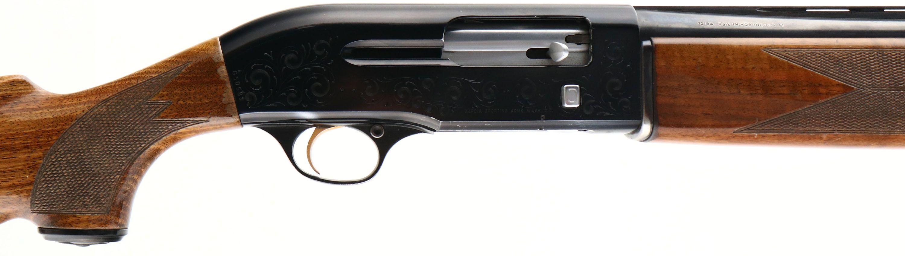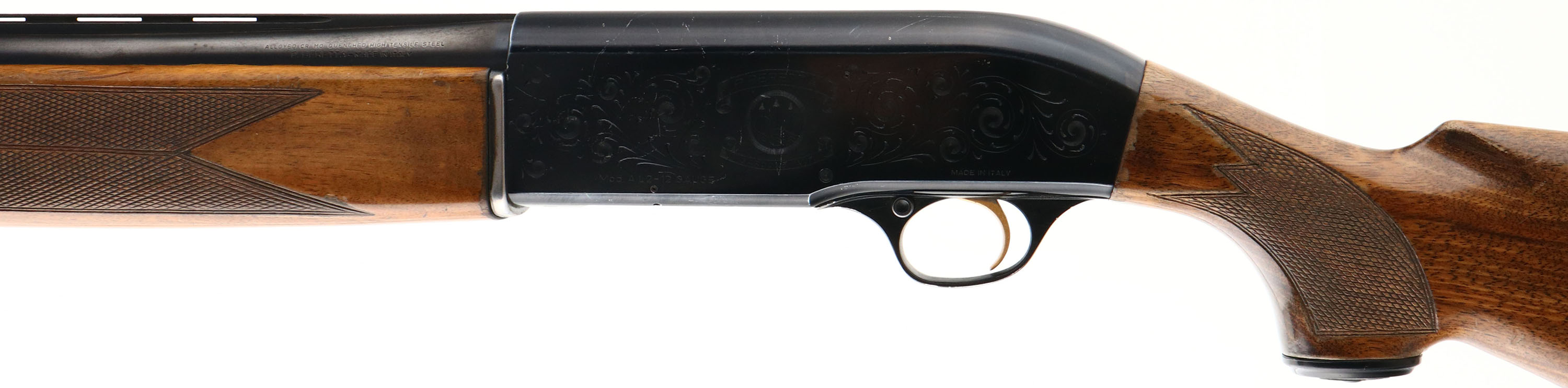 P. Beretta, Model AL2, CAL: 12 GA, MFG: 1970's-90's, SN: G50581, Semi Auto Shotgun, Choke: MOD, 2 3/4'', 28'' barrel. The original checkered & capped pistol grip stocks are very good & solid. There are scratches, scrapes, contusions & flaking to the original finish. There are also a couple of larger gouges on the stock. The original metal blue finish on the barrel rates 80%, while the anodized black receiver is excellent, with minor rub loss or scratches. Both sides of the receiver display simple scroll decorative engraving. Bore is excellent, with visible striations. Rib carries a bead front sight. Buttstock carries the original buttplate. FFL Req. - Value: 200 to 400